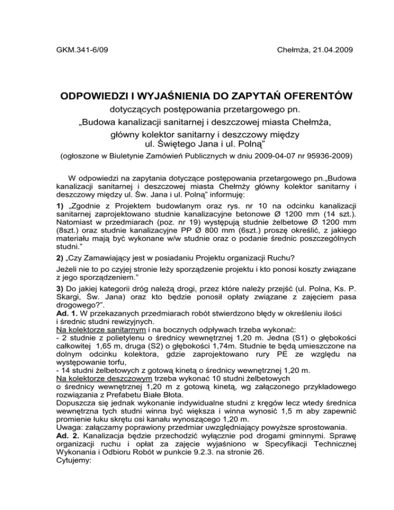 GKM.341-6/09 ChełmŜa, 21.04.2009 ODPOWIEDZI I WYJAŚNIENIA DO ZAPYTAŃ OFERENTÓW dotyczących postępowania przetargowego pn. „Budowa kanalizacji sanitarnej i deszczowej miasta ChełmŜa, główny kolektor sanitarny i deszczowy między ul. Świętego Jana i ul. Polną” (ogłoszone w Biuletynie Zamówień Publicznych w dniu 2009-04-07 nr 95936-2009) W odpowiedzi na zapytania dotyczące postępowania przetargowego pn.„Budowa kanalizacji sanitarnej i deszczowej miasta ChełmŜy główny kolektor sanitarny i deszczowy między ul. Św. Jana i ul. Polną” informuję: 1) „Zgodnie z Projektem budowlanym oraz rys. nr 10 na odcinku kanalizacji sanitarnej zaprojektowano studnie kanalizacyjne betonowe Ø 1200 mm (14 szt.). Natomiast w przedmiarach (poz. nr 19) występują studnie Ŝelbetowe Ø 1200 mm (8szt.) oraz studnie kanalizacyjne PP Ø 800 mm (6szt.) proszę określić, z jakiego materiału mają być wykonane w/w studnie oraz o podanie średnic poszczególnych studni.” 2) „Czy Zamawiający jest w posiadaniu Projektu organizacji Ruchu? JeŜeli nie to po czyjej stronie leŜy sporządzenie projektu i kto ponosi koszty związane z jego sporządzeniem.” 3) Do jakiej kategorii dróg naleŜą drogi, przez które naleŜy przejść (ul. Polna, Ks. P. Skargi, Św. Jana) oraz kto będzie ponosił opłaty związane z zajęciem pasa drogowego?”. Ad. 1. W przekazanych przedmiarach robót stwierdzono błędy w określeniu ilości i średnic studni rewizyjnych. Na kolektorze sanitarnym i na bocznych odpływach trzeba wykonać: - 2 studnie z polietylenu o średnicy wewnętrznej 1,20 m. Jedna (S1) o głębokości całkowitej 1,65 m, druga (S2) o głębokości 1,74m. Studnie te będą umieszczone na dolnym odcinku kolektora, gdzie zaprojektowano rury PE ze względu na występowanie torfu, - 14 studni Ŝelbetowych z gotową kinetą o średnicy wewnętrznej 1,20 m. Na kolektorze deszczowym trzeba wykonać 10 studni Ŝelbetowych o średnicy wewnętrznej 1,20 m z gotową kinetą, wg załączonego przykładowego rozwiązania z Prefabetu Białe Błota. Dopuszcza się jednak wykonanie indywidualne studni z kręgów lecz wtedy średnica wewnętrzna tych studni winna być większa i winna wynosić 1,5 m aby zapewnić promienie łuku skrętu osi kanału wynoszącego 1,20 m. Uwaga: załączamy poprawiony przedmiar uwzględniający powyŜsze sprostowania. Ad. 2. Kanalizacja będzie przechodzić wyłącznie pod drogami gminnymi. Sprawę organizacji ruchu i opłat za zajęcie wyjaśniono w Specyfikacji Technicznej Wykonania i Odbioru Robót w punkcie 9.2.3. na stronie 26. Cytujemy: 9.2.3. Koszt budowy, utrzymania i likwidacji objazdów, przejazdów i organizacji ruchu Wykonawca będzie zwolniony z opłat drogowych za zajęcie pasa drogowego na czas prowadzenia robót we wszystkich ulicach pod warunkiem, Ŝe czas zajęcia pasa drogowego na danym odcinku nie przekroczy 50 dni, wliczając w to równieŜ roboty drogowe. Po upływie tego czasu będą naliczane opłaty zgodnie z obowiązującymi przepisami. Koszty zmian organizacji ruchu na czas prowadzenia robót w całości pokrywane będą przez Wykonawcę i jego staraniem winny być przeprowadzone. Koniec cytatu. Informujemy ponadto, Ŝe nie jest wymagane sporządzanie projektu organizacji ruchu lecz wystarczy szkic proponowanej organizacji i uzgodnienie go z Inwestorem i Inspektorem nadzoru. 3. „Do budowy kanalizacji sanitarnej i deszczowej mamy zamiar uŜyć rur z PP (polipropylenu) jako materiału równowaŜnego o takich samych parametrach projektowych jak przewidziane rury z PE (polietylenu) i GPR (duroplasty). Nadmieniamy, Ŝe rury te są propozycją bardziej ekonomiczną ze względu na ich cenę. Pytanie nasze kierujemy, opierając się na Zarządzeniu nr 30 Generalnego Dyrektora Dróg Krajowych i Autostrad z dnia 2 listopada 2006 roku, opublikowanego w opracowaniu Pt.: „ZALECENIA PROJEKTOWE I TECHNOLOGICZNE DLA PODATNYCH DROGOWYCH KONSTRUKCJI INśYNIERSKICH Z TWORZYW SZTUCZNYCH. Opracowanie to mówi w rozdziale 2.1.1. o materiałach stosowanych do produkcji rur, które stosowane są w budowach dróg. A mianowicie są to polipropylen (PP), polietylen (PE) i duroplasty. Czy zamawiający widzi jakieś przeciwwskazania?” Ad. 3 Inwestor nie dopuszcza zastosowania rur polipropylenowych zamiast zaprojektowanych na części długości rur polietylenowych dwuściennych ø500. Uzasadnieniem tego jest fakt, Ŝe na rozpatrywanym odcinku kanalizacji długości 62,5 m pod kanałem w podłoŜu pozostaną istniejące torfy. Kanał na tym odcinku będzie więc powoli osiadał. WydłuŜenie do punktu zerwania polietylenu jest 35 razy większe od polipropylenu. Zaprojektowane rury PE zapewniają więc utrzymanie szczelności kanału nawet przy większym osiadaniu, zaś rury PP nie zapewniają tego. Inwestor nie dopuszcza zastosowania dwuściennych rur polipropylenowych do budowy kolektora deszczowego zamiast zaprojektowanych rur z Ŝywic epoksydowych (GRP). Uzasadnieniem tego jest fakt, Ŝe dostępne w kraju rury polipropylenowe mają bardzo cienką ściankę wewnętrzną. Dla rury DN800 grubość tej ścianki wynosi zaledwie 3,5 mm. Rury te miałyby więc znacznie niŜszą odporność na ścieranie niŜ zaprojektowane rury GRP. Omawiany kolektor będzie odprowadzał większość ścieków deszczowych z ChełmŜy a ścieki te zawierać będą duŜe ilości piasku, więc odporność na ścieranie jest waŜna dla przyszłej eksploatacji. 4. „Czy do oferty wykonawca powinien dołączyć kosztorys ofertowy?” Do oferty wykonawca nie potrzebuje dołączyć kosztorysu ofertowego. 5. Proszę o podanie parametrów rur kamionkowych, gdyŜ w Projekcie Budowlanym (część opisowa ) w pkt. 6.1 zakłada się wykorzystanie rur kamionkowych fi 500 mm i fi 600 mm klasy 120 natomiast w Specyfikacji technicznej wykonania i odbioru robót budowlanych pkt. 22.2 zaleca się zastosowanie rur kamionkowych klasy co najmniej 200?” NaleŜy zastosować rury kamionkowe klasy 200. 6. 