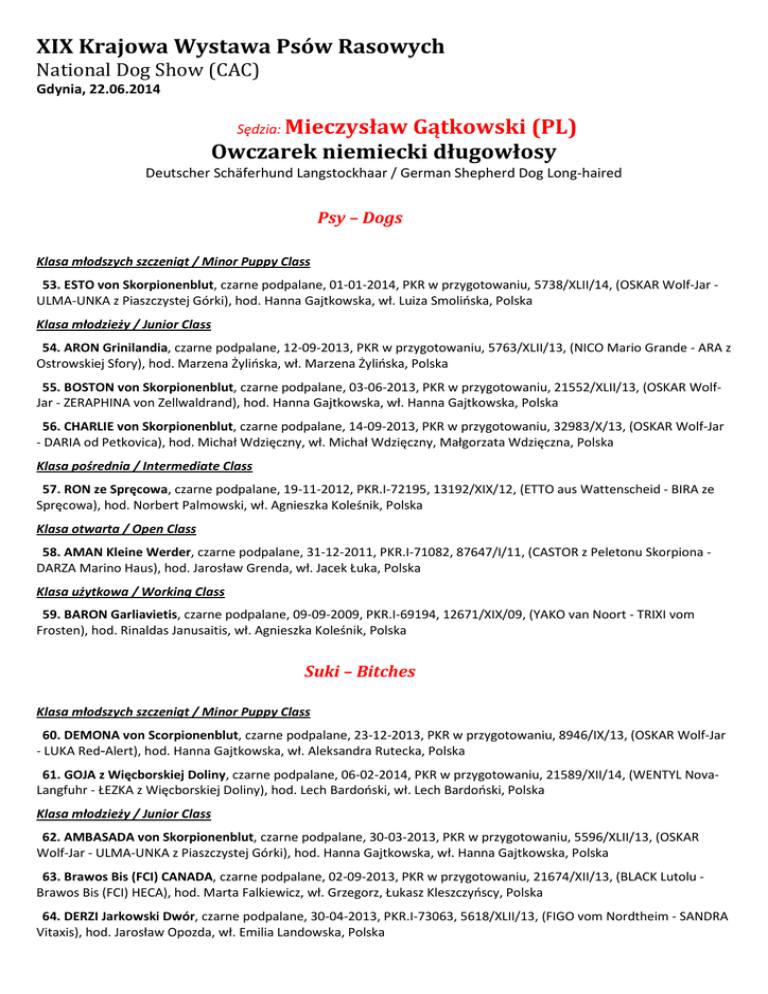 XIX Krajowa Wystawa Psów Rasowych National Dog Show (CAC) Gdynia, 22.06.2014 Sędzia: Mieczysław Gątkowski (PL) Owczarek niemiecki długowłosy Deutscher Schäferhund Langstockhaar / German Shepherd Dog Long-haired Psy – Dogs Klasa młodszych szczeniąt / Minor Puppy Class 53. ESTO von Skorpionenblut, czarne podpalane, 01-01-2014, PKR w przygotowaniu, 5738/XLII/14, (OSKAR Wolf-Jar ULMA-UNKA z Piaszczystej Górki), hod. Hanna Gajtkowska, wł. Luiza Smolińska, Polska Klasa młodzieży / Junior Class 54. ARON Grinilandia, czarne podpalane, 12-09-2013, PKR w przygotowaniu, 5763/XLII/13, (NICO Mario Grande - ARA z Ostrowskiej Sfory), hod. Marzena Żylińska, wł. Marzena Żylińska, Polska 55. BOSTON von Skorpionenblut, czarne podpalane, 03-06-2013, PKR w przygotowaniu, 21552/XLII/13, (OSKAR WolfJar - ZERAPHINA von Zellwaldrand), hod. Hanna Gajtkowska, wł. Hanna Gajtkowska, Polska 56. CHARLIE von Skorpionenblut, czarne podpalane, 14-09-2013, PKR w przygotowaniu, 32983/X/13, (OSKAR Wolf-Jar - DARIA od Petkovica), hod. Michał Wdzięczny, wł. Michał Wdzięczny, Małgorzata Wdzięczna, Polska Klasa pośrednia / Intermediate Class 57. RON ze Spręcowa, czarne podpalane, 19-11-2012, PKR.I-72195, 13192/XIX/12, (ETTO aus Wattenscheid - BIRA ze Spręcowa), hod. Norbert Palmowski, wł. Agnieszka Koleśnik, Polska Klasa otwarta / Open Class 58. AMAN Kleine Werder, czarne podpalane, 31-12-2011, PKR.I-71082, 87647/I/11, (CASTOR z Peletonu Skorpiona DARZA Marino Haus), hod. Jarosław Grenda, wł. Jacek Łuka, Polska Klasa użytkowa / Working Class 59. BARON Garliavietis, czarne podpalane, 09-09-2009, PKR.I-69194, 12671/XIX/09, (YAKO van Noort - TRIXI vom Frosten), hod. Rinaldas Janusaitis, wł. Agnieszka Koleśnik, Polska Suki – Bitches Klasa młodszych szczeniąt / Minor Puppy Class 60. DEMONA von Scorpionenblut, czarne podpalane, 23-12-2013, PKR w przygotowaniu, 8946/IX/13, (OSKAR Wolf-Jar - LUKA Red-Alert), hod. Hanna Gajtkowska, wł. Aleksandra Rutecka, Polska 61. GOJA z Więcborskiej Doliny, czarne podpalane, 06-02-2014, PKR w przygotowaniu, 21589/XII/14, (WENTYL NovaLangfuhr - ŁEZKA z Więcborskiej Doliny), hod. Lech Bardoński, wł. Lech Bardoński, Polska Klasa młodzieży / Junior Class 62. AMBASADA von Skorpionenblut, czarne podpalane, 30-03-2013, PKR w przygotowaniu, 5596/XLII/13, (OSKAR Wolf-Jar - ULMA-UNKA z Piaszczystej Górki), hod. Hanna Gajtkowska, wł. Hanna Gajtkowska, Polska 63. Brawos Bis (FCI) CANADA, czarne podpalane, 02-09-2013, PKR w przygotowaniu, 21674/XII/13, (BLACK Lutolu Brawos Bis (FCI) HECA), hod. Marta Falkiewicz, wł. Grzegorz, Łukasz Kleszczyńscy, Polska 64. DERZI Jarkowski Dwór, czarne podpalane, 30-04-2013, PKR.I-73063, 5618/XLII/13, (FIGO vom Nordtheim - SANDRA Vitaxis), hod. Jarosław Opozda, wł. Emilia Landowska, Polska 65. ERI Wypusty, czarne podpalane, 18-09-2013, PKR w przygotowaniu, 3209/XLVIII/13, (NAZIR ze Skalnego Wzgórza CANDY Wypusty), hod. Sławomir Skorupa, Rafał Skorupa, wł. Kamila Godlewska, Polska 66. KATIA z Zielonego Ursynowa, czarne podpalane, 07-05-2013, PKR.I-73408, 89498/I/13, (XAMBO Kalupus - RICKE von der Piste Trophe), hod. Janusz Chojnacki, wł. Jacek Łuka, Polska Klasa pośrednia / Intermediate Class 67. ALFA z Chojniczanki FCI, czarne podpalane, 07-07-2012, PKR.I-72204, 3760/XXXI/12, (MAJK z Weselskiej Zagrody TIKSI z Chojniczanki FCI), hod. Waldemar Spichalski, wł. Waldemar, Wojciech Spichalski, Polska 68. PIRA ze Spręcowa, czarne podpalane, 23-08-2012, PKR.I-73790, 13429/XIX/12, (POLDI v.Leckebusch - SHILLA ze Spręcowa), hod. Norbert Palmowski, wł. Agnieszka Koleśnik, Polska Klasa championów / Champion Class 69. HONDA z Agiru Bohemia, czarne podpalane, 18-06-2011, PKR.I-69276, 3645/XXXI/11, (NELSON Frankengold - XINI z Agiru Bohemia), hod. M. Sasak, wł. Jarosław Kołsut, Polska Sędzia: Mieczysław Gątkowski (PL) Owczarek niemiecki krótkowłosy Deutscher Schäferhund Stockhaar / German Shepherd Dog Short-haired Psy – Dogs Klasa młodzieży / Junior Class 70. AWO znad Aru, czarne podpalane, 05-07-2013, PKR w przygotowaniu, 32957/X/13, (JOKER vom Eichenplatz - TIGRA ze Spręcowa), hod. Mirosław Grzywacz, wł. Dariusz Kotarski, Polska Klasa otwarta / Open Class 71. GORAN Lestes Poland FCI, czarne podpalane, 04-04-2011, PKR.I-69629, 31921/X/11, (DOLLAR von Zellwaldrand RANDIA Lestes), hod. Zbigniew Bagrowski, wł. Teresa Gruchalska, Polska 72. KANTO ze Spręcowa, czarne podpalane, 31-03-2011, PKR.I-69497, 12737/XIX/11, (Conbhairean UNO - BIRA ze Spręcowa), hod. Norbert Palmowski, wł. Norbert Palmowski, Polska 73. WENTYL Nova Langfuhr, czarne podpalane, 29-04-2012, PKR.I-71079, 21186/XII/12, (URSUS v. Panoniansee - COCA Nova Langfuhr), hod. Dykowski Paweł, wł. Lech Bardoński, Polska 74. WIRUS Nova-Langfuhr, czarne podpalane, 29-04-2012, PKR.I-71211, 5500/XLII/12, (URSUS von Panoniansee - COCA Nova-Langfuhr), hod. Paweł Dykowski, wł. Dariusz Sokołowski, Polska 75. ZIKO z Mylnej Gromady, czarne podpalane, 25-04-2009, PKR.I-63709, 30598/X/09, (IMO von den Zwei Steinen - IRA z Mylnej Gromady), hod. S.A. Wawrzyniak, wł. Henryk Ziółkowski, Polska Klasa użytkowa / Working Class 76. GHUCCI Hexenland, czarne podpalane, 07-12-2011, PKR.I-70370, 87115/I/11, (ENOSH von Amasis - HINA Hexenland), hod. K. Leszczyńska, wł. Monika Szczepaniak, Polska Klasa championów / Champion Class 77. BAX ze Spręcowa, czarne podpalane, 16-04-2009, PKR.I-65066, 11964/XIX/09, (GOSCHA v.Holtkamper See - DIWA ze Spręcowa), hod. Norbert Palmowski, wł. Norbert Palmowski, Polska Suki – Bitches Klasa szczeniąt / Puppy Class 78. FIFA z Hodowli Mistrza Jana, czarne podpalane, 18-10-2013, PKR w przygotowaniu, 21682/XII/13, (URSUS StanLech - DASZA z Hodowli Mistrza Jana), hod. Jan Antczak, Zbigniew Idziak, wł. Jan Antczak, Polska 79. YAKIMA z Więcborskiej Doliny, czarne podpalane, 28-10-2013, PKR w przygotowaniu, 10085/XVIII/13, (URSUS Stan-Lech - WICI z Więcborskiej Doliny), hod. Lech Bardoński, wł. Andrzej Daniecki, Polska Kl