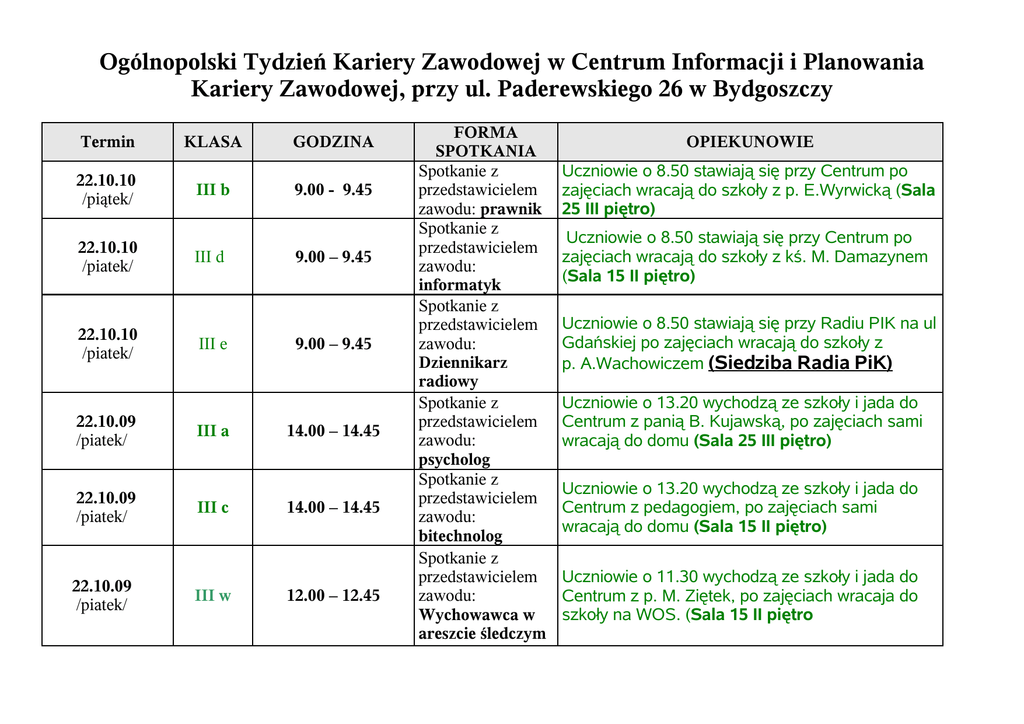 Ogólnopolski Tydzień Kariery Zawodowej w Centrum Informacji i Planowania Kariery Zawodowej, przy ul. Paderewskiego 26 w Bydgoszczy Termin KLASA GODZINA 22.10.10 /piątek/ III b 9.00 - 9.45 22.10.10 /piatek/ III d 9.00 – 9.45 22.10.10 /piatek/ 22.10.09 /piatek/ 22.10.09 /piatek/ 22.10.09 /piatek/ III e III a III c III w 9.00 – 9.45 14.00 – 14.45 14.00 – 14.45 12.00 – 12.45 FORMA SPOTKANIA Spotkanie z przedstawicielem zawodu: prawnik Spotkanie z przedstawicielem zawodu: informatyk Spotkanie z przedstawicielem zawodu: Dziennikarz radiowy Spotkanie z przedstawicielem zawodu: psycholog Spotkanie z przedstawicielem zawodu: bitechnolog Spotkanie z przedstawicielem zawodu: Wychowawca w areszcie śledczym OPIEKUNOWIE Uczniowie o 8.50 stawiają się przy Centrum po zajęciach wracają do szkoły z p. E.Wyrwicką (Sala 25 III piętro) Uczniowie o 8.50 stawiają się przy Centrum po zajęciach wracają do szkoły z kś. M. Damazynem (Sala 15 II piętro) Uczniowie o 8.50 stawiają się przy Radiu PIK na ul Gdańskiej po zajęciach wracają do szkoły z p. A.Wachowiczem (Siedziba Radia PiK) Uczniowie o 13.20 wychodzą ze szkoły i jada do Centrum z panią B. Kujawską, po zajęciach sami wracają do domu (Sala 25 III piętro) Uczniowie o 13.20 wychodzą ze szkoły i jada do Centrum z pedagogiem, po zajęciach sami wracają do domu (Sala 15 II piętro) Uczniowie o 11.30 wychodzą ze szkoły i jada do Centrum z p. M. Ziętek, po zajęciach wracaja do szkoły na WOS. (Sala 15 II piętro