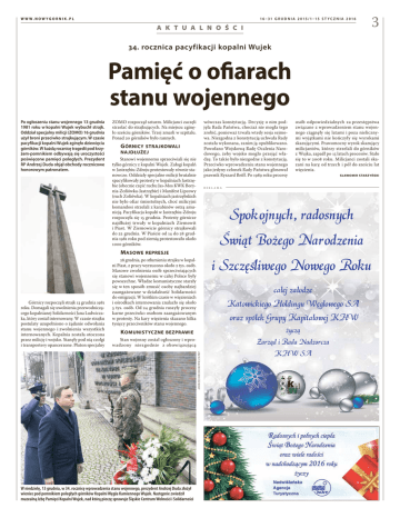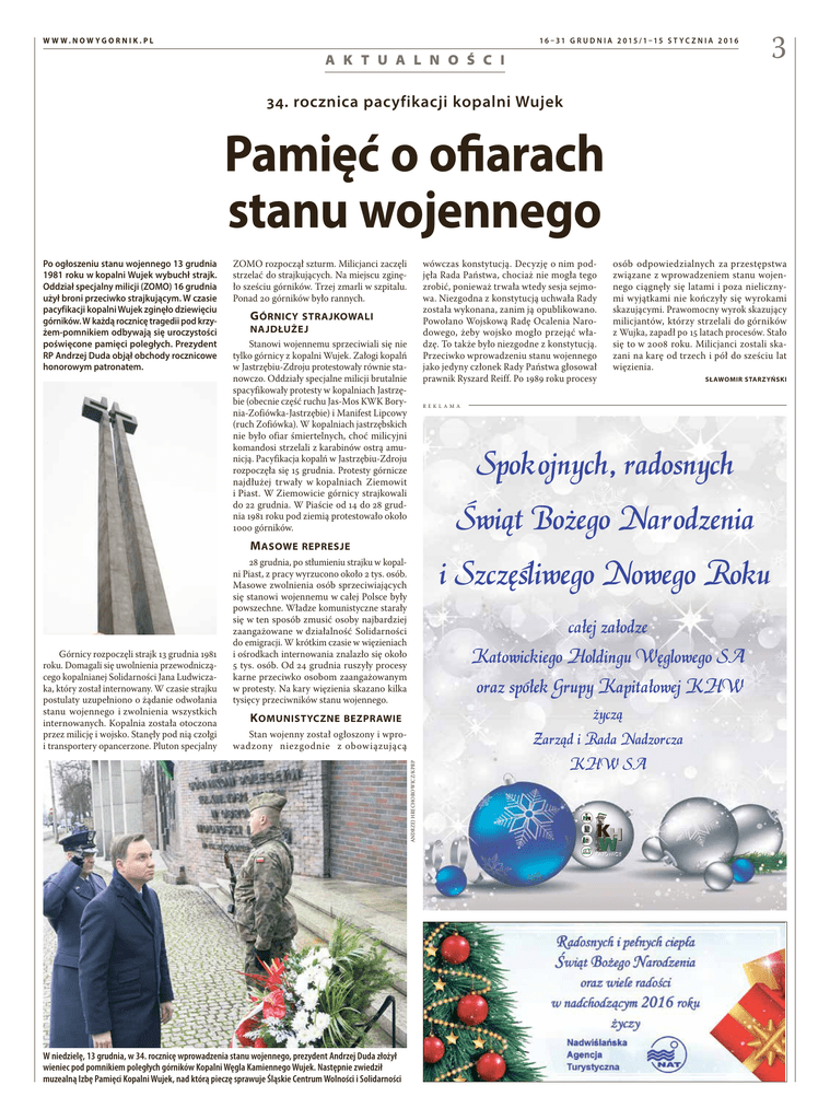 W W W.NOW YGORNIK.PL 16 –31 G R U D N I A 2 015/1–15 S T YC Z N I A 2 016 A K T U A L N O Ś C I 3 34. rocznica pacyfikacji kopalni Wujek Pamięć o ofiarach stanu wojennego Po ogłoszeniu stanu wojennego 13 grudnia 1981 roku w kopalni Wujek wybuchł strajk. Oddział specjalny milicji (ZOMO) 16 grudnia użył broni przeciwko strajkującym. W czasie pacyfikacji kopalni Wujek zginęło dziewięciu górników. W każdą rocznicę tragedii pod krzyżem-pomnikiem odbywają się uroczystości poświęcone pamięci poległych. Prezydent RP Andrzej Duda objął obchody rocznicowe honorowym patronatem. ZOMO rozpoczął szturm. Milicjanci zaczęli strzelać do strajkujących. Na miejscu zginęło sześciu górników. Trzej zmarli w szpitalu. Ponad 20 górników było rannych. wówczas konstytucją. Decyzję o nim podjęła Rada Państwa, chociaż nie mogła tego zrobić, ponieważ trwała wtedy sesja sejmowa. Niezgodna z konstytucją uchwała Rady została wykonana, zanim ją opublikowano. Powołano Wojskową Radę Ocalenia Narodowego, żeby wojsko mogło przejąć władzę. To także było niezgodne z konstytucją. Przeciwko wprowadzeniu stanu wojennego jako jedyny członek Rady Państwa głosował prawnik Ryszard Reiff. Po 1989 roku procesy G órnicy strajkowali najdłużej Stanowi wojennemu sprzeciwiali się nie tylko górnicy z kopalni Wujek. Załogi kopalń w Jastrzębiu-Zdroju protestowały równie stanowczo. Oddziały specjalne milicji brutalnie spacyfikowały protesty w kopalniach Jastrzębie (obecnie część ruchu Jas-Mos KWK Borynia-Zofiówka-Jastrzębie) i Manifest Lipcowy (ruch Zofiówka). W kopalniach jastrzębskich nie było ofiar śmiertelnych, choć milicyjni komandosi strzelali z karabinów ostrą amunicją. Pacyfikacja kopalń w Jastrzębiu-Zdroju rozpoczęła się 15 grudnia. Protesty górnicze najdłużej trwały w kopalniach Ziemowit i Piast. W Ziemowicie górnicy strajkowali do 22 grudnia. W Piaście od 14 do 28 grudnia 1981 roku pod ziemią protestowało około 1000 górników. REKL A M A M asowe represje K omunistyczne bezprawie Stan wojenny został ogłoszony i wprowadzony niezgodnie z obowiązującą ANDRZEJ HRECHOROWICZ/KPRP Górnicy rozpoczęli strajk 13 grudnia 1981 roku. Domagali się uwolnienia przewodniczącego kopalnianej Solidarności Jana Ludwiczaka, który został internowany. W czasie strajku postulaty uzupełniono o żądanie odwołania stanu wojennego i zwolnienia wszystkich internowanych. Kopalnia została otoczona przez milicję i wojsko. Stanęły pod nią czołgi i transportery opancerzone. Pluton specjalny 28 grudnia, po stłumieniu strajku w kopalni Piast, z pracy wyrzucono około 2 tys. osób. Masowe zwolnienia osób sprzeciwiających się stanowi wojennemu w całej Polsce były powszechne. Władze komunistyczne starały się w ten sposób zmusić osoby najbardziej zaangażowane w działalność Solidarności do emigracji. W krótkim czasie w więzieniach i ośrodkach internowania znalazło się około 5 tys. osób. Od 24 grudnia ruszyły procesy karne przeciwko osobom zaangażowanym w protesty. Na kary więzienia skazano kilka tysięcy przeciwników stanu wojennego. W niedzielę, 13 grudnia, w 34. rocznicę wprowadzenia stanu wojennego, prezydent Andrzej Duda złożył wieniec pod pomnikiem poległych górników Kopalni Węgla Kamiennego Wujek. Następnie zwiedził muzealną Izbę Pamięci Kopalni Wujek, nad którą pieczę sprawuje Śląskie Centrum Wolności i Solidarności osób odpowiedzialnych za przestępstwa związane z wprowadzeniem stanu wojennego ciągnęły się latami i poza nielicznymi wyjątkami nie kończyły się wyrokami skazującymi. Prawomocny wyrok skazujący milicjantów, którzy strzelali do górników z Wujka, zapadł po 15 latach procesów. Stało się to w 2008 roku. Milicjanci zostali skazani na karę od trzech i pół do sześciu lat więzienia. SŁAWOMIR STARZYŃSKI