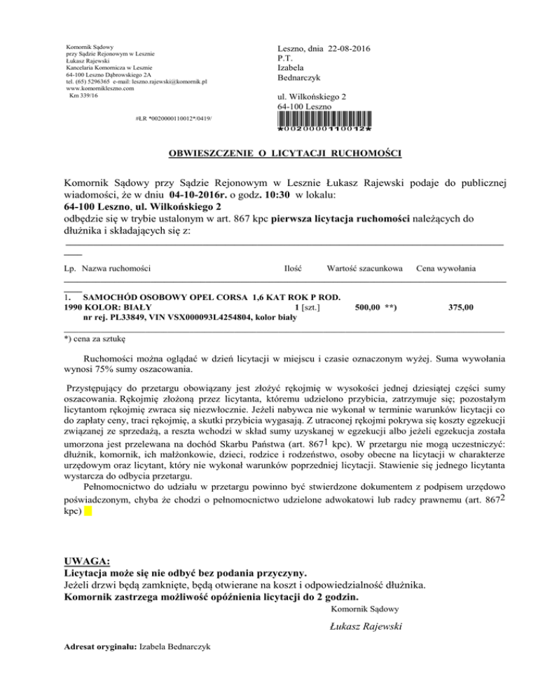 Obwieszczenie o licytacji - Kancelaria Komornicza w Lesznie
