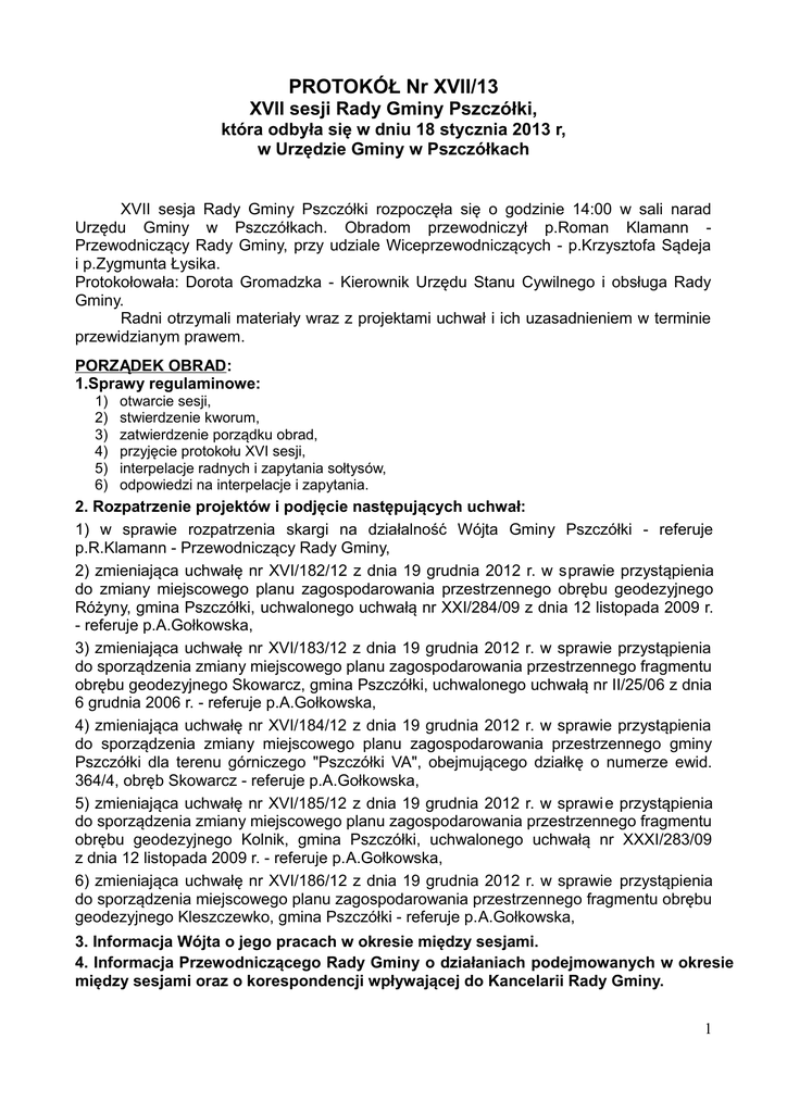 PROTOKÓŁ Nr XVII/13 XVII sesji Rady Gminy Pszczółki, która odbyła się w dniu 18 stycznia 2013 r, w Urzędzie Gminy w Pszczółkach XVII sesja Rady Gminy Pszczółki rozpoczęła się o godzinie 14:00 w sali narad Urzędu Gminy w Pszczółkach. Obradom przewodniczył p.Roman Klamann Przewodniczący Rady Gminy, przy udziale Wiceprzewodniczących - p.Krzysztofa Sądeja i p.Zygmunta Łysika. Protokołowała: Dorota Gromadzka - Kierownik Urzędu Stanu Cywilnego i obsługa Rady Gminy. Radni otrzymali materiały wraz z projektami uchwał i ich uzasadnieniem w terminie przewidzianym prawem. PORZĄDEK OBRAD: 1.Sprawy regulaminowe: 1) 2) 3) 4) 5) 6) otwarcie sesji, stwierdzenie kworum, zatwierdzenie porządku obrad, przyjęcie protokołu XVI sesji, interpelacje radnych i zapytania sołtysów, odpowiedzi na interpelacje i zapytania. 2. Rozpatrzenie projektów i podjęcie następujących uchwał: 1) w sprawie rozpatrzenia skargi na działalność Wójta Gminy Pszczółki - referuje p.R.Klamann - Przewodniczący Rady Gminy, 2) zmieniająca uchwałę nr XVI/182/12 z dnia 19 grudnia 2012 r. w sprawie przystąpienia do zmiany miejscowego planu zagospodarowania przestrzennego obrębu geodezyjnego Różyny, gmina Pszczółki, uchwalonego uchwałą nr XXI/284/09 z dnia 12 listopada 2009 r. - referuje p.A.Gołkowska, 3) zmieniająca uchwałę nr XVI/183/12 z dnia 19 grudnia 2012 r. w sprawie przystąpienia do sporządzenia zmiany miejscowego planu zagospodarowania przestrzennego fragmentu obrębu geodezyjnego Skowarcz, gmina Pszczółki, uchwalonego uchwałą nr II/25/06 z dnia 6 grudnia 2006 r. - referuje p.A.Gołkowska, 4) zmieniająca uchwałę nr XVI/184/12 z dnia 19 grudnia 2012 r. w sprawie przystąpienia do sporządzenia zmiany miejscowego planu zagospodarowania przestrzennego gminy Pszczółki dla terenu górniczego "Pszczółki VA", obejmującego działkę o numerze ewid. 364/4, obręb Skowarcz - referuje p.A.Gołkowska, 5) zmieniająca uchwałę nr XVI/185/12 z dnia 19 grudnia 2012 r. w sprawi e przystąpienia do sporządzenia zmiany miejscowego planu zagospodarowania przestrzennego fragmentu obrębu geodezyjnego Kolnik, gmina Pszczółki, uchwalonego uchwałą nr XXXI/283/09 z dnia 12 listopada 2009 r. - referuje p.A.Gołkowska, 6) zmieniająca uchwałę nr XVI/186/12 z dnia 19 grudnia 2012 r. w sprawie przystąpienia do sporządzenia miejscowego planu zagospodarowania przestrzennego fragmentu obrębu geodezyjnego Kleszczewko, gmina Pszczółki - referuje p.A.Gołkowska, 3. Informacja Wójta o jego pracach w okresie między sesjami. 4. Informacja Przewodniczącego Rady Gminy o działaniach podejmowanych w okresie między sesjami oraz o korespondencji wpływającej do Kancelarii Rady Gminy. 1 5. Wolne wnioski i informacje. 6. Zamknięcie obrad sesji Rady Gminy. Ad.1 Sprawy regulaminowe: 1) otwarcie sesji XVII sesję Rady Gminy Pszczółki otworzył Przewodniczący Rady słowami: „Otwieram XVII sesję Rady Gminy Pszczółki”. Powitał radnych, Zastępcę Wójta, Sekretarza Gminy, Sołtysów oraz pracowników Urzędu Gminy. 2) stwierdzenie kworum Na podstawie listy obecności Przewodniczący stwierdził obecność 15 radnych – wszyscy obecni, zatem sesja jest prawomocna i zdolna do podejmowania uchwał. Lista obecności w załączeniu. W sesji uczestniczyło także 3 sołtysów - lista obecności w załączeniu. 3) przedstawienie porządku obrad Przewodniczący Rady Gminy powiedział, że porządek obrad znajduje się w materiałach na sesję, które otrzymali wszyscy radni. Zapytał, czy są uwagi do zaproponowanego porządku sesji? Ponieważ żadnych uwag nie zgłoszono, zarządził głosowanie. Obecnych 15 radnych, wynik głosowania: ZA - 15 radnych, głosów przeciw i wstrzymujących się nie było. Porządek obrad został przyjęty jednogłośnie. 4) przyjęcie protokołu XVI sesji Przewodniczący Rady R.Klamann powiedział, że protokół XVI sesji był wyłożony do wglądu w kancelarii Rady Gminy i radni nie wnieśli do niego żadnych uwag ani poprawek, w związku z czym zostaje zatwierdzony przy braku sprzeciwu. 5) interpelacje radnych i zapytania sołtysów Żadnych nie zgłoszono. 6) odpowiedzi na interpelacje i zapytania Nie miały miejsca. Ad.2 Rozpatrzenie projektów i podjęcie następujących uchwał: 1) w sprawie rozpatrzenia skargi na działalność Wójta Gminy Pszczółki Pan R.Klamann powiedział, że w dniu 19 grudnia 2012 r. wpłynęła skarga p.K.Sądeja - dyrektora Niepublicznego Przedszkola w Kolniku, na działalność Wójta. W materiałach na sesję radni otrzymali kopię skargi, więc nie ma potrzeby jej odczytywania. Przekazał dokument do analizy Komisji Rewizyjnej, której posiedzenie odbyło się 28 grudnia 2012 r. Zwracając się do p.Janiny Jakowskiej - Przewodniczącej Komisji, poprosił o przekazanie wniosków. Pani J.Jakowska powiedziała, że Komisja Rewizyjna w obecności Przewodniczącego Rady Gminy, Przewodniczącej Komisji Gospodarczej oraz członków Komisji Oświaty wysłuchała wyjaśnień radcy prawnego, sekretarza gminy oraz osób, które z upoważnienia Wójta prowadziły kontrolę wykorzystania dotacji udzielonej z budżetu gminy Niepublicznemu Przedszkolu „Dębowy Zakątek” w Kolniku. Obszerne wyjaśnienia pozwoliły obecnym na zapoznanie się ze stanem faktycznym i prawnym oraz stwierdzenie, że Wójt działał zgodnie z prawem. Żaden z postawionych w skardze zarzutów nie znalazł potwierdzenia. W opinii Komisji Rewizyjnej skargę należy uznać w całości za bezzasadną i Komisja wnioskuje o podjęcie stosownej uchwały. Jednocześnie Komisja wnioskuje o zobowiązanie Wójta do dokończenia kontroli i przedstawienia jej wyników na najbliższej sesji Rady. 2 Pan R.Klamann powiedział, że zgodnie z Kodeksem postępowania administracyjnego organem właściwym do rozpatrzenia skargi na działalność wójta jest rada gminy. Radni powinni zapoznać się z każdym zarzutem, by mieć możliwość ich oceny, w związku z czym otwiera