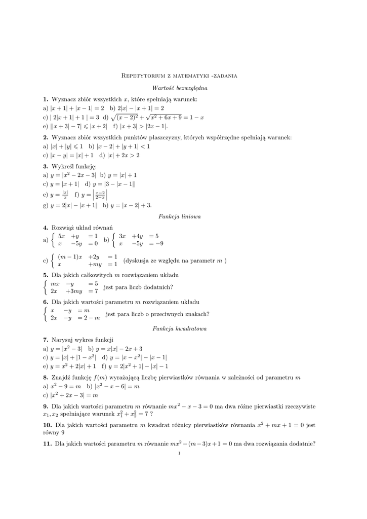 Repetytorium z matematyki -zadania Wartość bezwzględna 1. Wyznacz zbiór wszystkich x, które spełniają warunek: a) |x + 1| + |x − 1| = 2 b) 2|x| − |x + 1| = 2 p √ c) | 2|x + 1| + 1 | = 3 d) (x − 2)2 + x2 + 6x + 9 = 1 − x e) ||x + 3| − 7| 6 |x + 2| f) |x + 3| > |2x − 1|. 2. Wyznacz zbiór wszystkich punktów płaszczyzny, których współrzędne spełniają warunek: a) |x| + |y| 6 1 b) |x − 2| + |y + 1| < 1 c) |x − y| = |x| + 1 d) |x| + 2x > 2 3. Wykreśl funkcję: a) y = |x2 − 2x − 3| b) y = |x| + 1 c) y = |x + 1| d) y = |3 − |x − 1|| x−2 e) y = |x| f) y = x 2−x g) y = 2|x| − |x + 1| h) y = |x − 2| + 3. Funkcja liniowa 4. Rozwiąż układ równań 5x +y =1 3x +4y = 5 a) b) x −5y = 0 x −5y = −9 (m − 1)x +2y = 1 c) (dyskusja ze względu na parametr m ) x +my = 1 5. Dla jakich całkowitych m rozwiązaniem układu mx −y =5 jest para liczb dodatnich? 2x +3my = 7 6. Dla jakich wartości parametru m rozwiązaniem układu x −y = m jest para liczb o przeciwnych znakach? 2x −y = 2 − m Funkcja kwadratowa 7. Narysuj wykres funkcji a) y = |x2 − 3| b) y = x|x| − 2x + 3 c) y = |x| + |1 − x2 | d) y = |x − x2 | − |x − 1| e) y = x2 + 2|x| + 1 f) y = 2|x2 + 1| − |x| − 1 8. Znajdź funkcję f (m) wyrażającą liczbę pierwiastków równania w zależności od parametru m a) x2 − 9 = m b) |x2 − x − 6| = m c) |x2 + 2x − 3| = m 9. Dla jakich wartości parametru m równanie mx2 − x − 3 = 0 ma dwa różne pierwiastki rzeczywiste x1 , x2 spełniające warunek x21 + x22 = 7 ? 10. Dla jakich wartości parametru m kwadrat różnicy pierwiastków równania x2 + mx + 1 = 0 jest równy 9 11. Dla jakich wartości parametru m równanie mx2 − (m − 3)x + 1 = 0 ma dwa rozwiązania dodatnie? 1 12. Dla jakich wartości parametru m pierwiastki rzeczywiste równania 4mx2 −4(1−2m)x+9m−8 = 0 spełniają warunek 1 1 + 2 > −4 2 x1 x2 Wielomiany 13. Rozłóż wielomiany na czynniki 1) x4 + 1 2) x4 + x2 + 1 3) x4 − x2 + 1 4) x6 + 7x3 − 8 5) 3x3 − 2x2 + 3x − 2 6) y 5 − 2y 3 − y 2 + 2 7) 2x3 + 9x2 − 6x − 5 8) t4 − t3 − 7t2 + t + 6 14. Rozwiąż równania 1) x3 − 7x − 6 = 0 2) 2x6 + x4 + 3x2 + 1 = 0 4) x4 − 2x3 + 2x − 1 = 0 15. Rozwiąż nierówności 1) x4 + x3 − x − 1 6 0 2) 2x3 + 2x2 − 3x − 3 > 0 3) (x − 1)4 (x − 2)(x − 5)3 < 0 4) 3x2 +4x−4 x2 +x−2 > 1 5) 5−x 3−x 6 3x−1 2−x 16. Narysuj wykres funkcji x+1 1) y = x+2 2) y = 2x+3 3)y = x+2 6) x4 − 3x3 − x + 3 < 0 7) 2 + −x+4 x+2 4) y = 3 x+1 > 2 x 2x−2 x+1 Funkcja potęgowa, wykładnicza i logarytmiczna 17. Rozwiąż równania √ √ √ √ √ 1) x + 3 = 3 2) x + 3 + x = 3 3) 3x − 1 − x − 1 = 2 18. Rozwiąż nierówności √ √ √ 1) 2x − 1 > 2 2) 2x + 3 > x + 2 3) x − 2 + x > 4 19. Określ dziedzinę funkcji √ 1) y = 2x2 − x + 1 2) y + p 2 3x 2− 3x+1 x−2 x , 3) y = √ −8 3 2− x . 20. Rozwiąż równanie √ 2 1) 2x−4 = ( 2)2−3x 2) 4 · 2x = 23x 3) 32x−1 + 32x−2 − 32x−4 = 315 x x−1 4) 49 · 27 = 23 5) 93x−4 − 38x−2 = 0 6) 6x+1 + 61−x = 37 8 2x+1 x−1 7) 4 = 65 · 4 − 1 8) 27x · 92x · 33x = 243 9) 33x · 34x · 33x = 35 10) (2x )x · (4x )x = 64 11) 4x − 10 · 2x−1 = 24 21. Rozwiąż nierówność √ 4 1) 3x > 27 2) 9 x < 3 3) 4) 3x+4 < 31−x 5) 33x · 27 > 1 3x <1 7 1 6) ( 14 )x 3 − ( 12 )2(x−2) > 52 7) 32x > 2 · 3x + 3 22. Wyznacz dziedzinę funkcji √ q √ log(9−x2 ) 1) y = log(x2 − 4) + 6 − 2x 2) y = log21 (x − 3) − 1 3) y = 3x −1 2 p p 4) y = log 21 [1 − log2 (x2 − 5x + 6)] 5) y = log3 |x − 2| 6) logx (3 − x) 23. Rozwiąż równanie 1) log(x − 3) − log(2 − 3x) = 1 2) 4) log3 (x2 + 4x + 12) = 2 3 + log2 3 + log2 5 log(2x−5) log(x2 −8) 2 = 1 2 3) log3 (3x − 8) = 2 − x 5) log2 (9x − 20) = 2 + log2 6 + log2 x 6) log2 (x − 2) + log2 (12 + x) = 2 24. Rozwiąż nierówność 1 1) log2 (x + 2) > 3 2) log2 (x2 + 3x) 6 2 3) log1 x + 1−log x >1 √ √ 2 2 4) log 31 x + 1 < 1 + log 13 4 − x 5) (log 12 x) + log 21 x − 2 6 0 6) log2 x + 3 log x Funkcje trygonometryczne 25. Oblicz 1) tg x wiedząc, że cos x = 3 5 2) sin x wiedząc, że ctg x = 3) cos x wiedząc, że sin x = i x ∈ (0, π2 ) 8 15 15 17 i x ∈ (0, π2 ) i x ∈ ( π2 , π) 5 4) ctg x wiedząc, że cos x = − 13 i x ∈ (π, 32 π) 26. Oblicz sin 2x, cos 2x, jeśli wiadomo, że sin x = 0, 6 i x ∈ (0, π2 ). 27. Oblicz sin x2 , cos x2 , jeśli wiadomo, że tg x = 0, 75 i x ∈ (0, π2 ) 28. Rozwiąż równanie √ √ 1) sin x = 3 2 2) sin x = − 2 2 √ 3) cos x = 3 2 4) cos2 x = 1 5) sin2 x + 2 sin x − 3 = 0 6) 2 cos2 x + 3 cos x + 1 = 0 7) tg2 x = 3 8) ctg2 x = 1 9) tg x + ctg x = 2 √ 10) tg(x + π4 ) = 1 11) ctg(x − π3 ) = − 3 12) sin x = cos x. 29. Rozwiąż w przedziale [0, 2π] nierówność √ 1) sin x − 12 < 0 2) | cos x − 12 | < 1 3) 3 tg x − 1 < 0 4) sin x 6 − 21 7) cos2x < 1 2 √ 2 6) tg x < 1 √2 8) tg 4x > 3 9)ctg 14 x 6 −1 5) cos x > Wektory −−→ 30. Oblicz współrzędne wektora AB √ √ √ √ 1) A = (1, 2), B = (3, 4) 2) A = (−3, 2), B = (4, −1) 3) A = ( 2, 3), B = ( 2, − 3) 31. Wykreśl wektor mając jego współrzędne 1) [2, 1] 2) [−2, 3] 3) [−3, 0] 4) [4, −2] −−→ 32. Znajdź współrzędną końca wektora KL = [−1, 2] zaczepionego w punkcie 1) (1, 0) 2) (−4, 5) 3) (−2, 3) −−→ 33. Znajdź współrzędną początku wektora CD = [4, −2] którego koniec ma współrzędne 1) (5, 2) 2) (4, −2) 3) (−2, 0) 34. Oblicz odległość punktów A, B 1) A = (1, 5), B = (4, 2) 2) A = (−3, 1), B = (1, −1) 3) A = (2, −3), B = (2, 2) 35. Oblicz iloczyn skalarny wektorów → − → − → → 1) |− a | = 5, | b | = 4, ^(− a , b ) = 30o → − → − → → 2) |− a | = 12, | b | = 0, 4 ^(− a , b ) = 45o 3) [2, −4] [3, 5] 4) [−7, 3] [6, 4] 36. Oblicz kąt między wektorami √ √ 1) [1, 3] i [−1, 3] 2) [− 21 , 3] i [6, 1] 3) [4, −2] i [1, 21 ] 3 − 37. Napisz równ