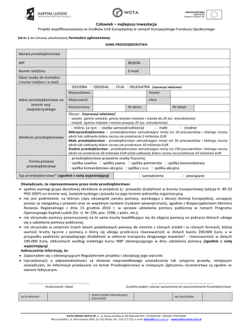Człowiek – najlepsza inwestycja Projekt współfinansowany ze środków Unii Europejskiej w ramach Europejskiego Funduszu Społecznego Zał nr 1 do Umowy szkoleniowej Formularz zgłoszeniowy DANE PRZEDSIĘBIORSTWA Nazwa przedsiębiorstwa NIP REGON Numer telefonu E-mail Dane osoby do kontaktu (+numer telefonu i e-mail) SIEDZIBA ODDZIAŁ FILIA DELEGATRA /zaznaczyć właściwe/ Adres przedsiębiorstwa na terenie woj. świętokrzyskiego Wielkość przedsiębiorstwa Forma prawna przedsiębiorstwa Województwo Powiat Miejscowość Ulica Kod pocztowy Nr domu Nr lokalu Obszar: /zaznaczyć właściwe/ wiejski (gminy wiejskie, gminy wiejsko-miejskie i miasta do 25 tyś. mieszkańców) miejski (gminy miejskie i miasta powyżej 25 tys. mieszkańców) mikro, (w tym osoba samozatrudniona) małe średnie Mikroprzedsiębiorstwo – przedsiębiorstwo zatrudniające mniej niż 10 pracowników i którego roczny obrót lub całkowity bilans roczny nie przekracza 2 milionów EUR. Małe przedsiębiorstwo - przedsiębiorstwo zatrudniające mniej niż 50 pracowników i którego roczny obrót lub całkowity bilans roczny nie przekracza 10 milionów EUR. Średnie przedsiębiorstwo - przedsiębiorstwo zatrudniające mniej niż 250 pracowników i którego roczny obrót nie przekracza 50 milionów EUR a/lub całkowity bilans roczny nie przekracza 43 milionów EUR. przedsiębiorstwo prywatne osoby fizycznej spółka cywilna spółka jawna spółka partnerska spółka komandytowa spółka komandytowo-akcyjna spółka z o.o. spółka akcyjna samodzielne Typ przedsiębiorstwa* (zgodnie z notą wyjaśniającą) powiązane Oświadczam, że reprezentowane przez mnie przedsiębiorstwo: spełnia wymogi grupy docelowej określone w projekcie tj.: prowadzi działalność w branży transportowej (sekcja H. 49-53 PKD 2007) na terenie woj. świętokrzyskiego i posiada na jego terenie jednostkę organizacyjną nie jest podmiotem, na którym ciąży obowiązek zwrotu pomocy, wynikający z decyzji Komisji Europejskiej, uznającej pomoc za niezgodną z prawem oraz ze wspólnym rynkiem (rynkiem wewnętrznym), zgodnie z Rozporządzeniem Ministra Rozwoju Regionalnego z dnia 15 grudnia 2010 r. w sprawie udzielania pomocy publicznej w ramach Programu Operacyjnego Kapitał Ludzki (Dz. U. Nr 239, poz. 1598, z późn. zm.); nie otrzymało pomocy przeznaczonej na te same koszty kwalifikujące się do objęcia pomocą na pokrycie których ubiega się o udzielenie pomocy publicznej; nie otrzymało w ostatnich trzech latach podatkowych pomocy de minimis z różnych źródeł i w różnych formach, której wartość brutto łącznie z pomocą o którą się ubiega przekracza równowartość w złotych kwoty 200.000 Euro, a w przypadku podmiotu prowadzącego działalność w sektorze transportu drogowego towarów* - równowartość w złotych 100.000 Euro, obliczonych według średniego kursu NBP obowiązującego w dniu udzielenia pomocy (zgodnie z notą wyjaśniającą) Jednocześnie informuję, że: Zapoznałem się z obowiązującym Regulaminem projektu i akceptuję jego warunki. Uprzedzona/y o odpowiedzialności za złożenie nieprawidłowego oświadczenia lub zatajenia prawdy, niniejszym oświadczam, że informacje przekazane na temat Przedsiębiorstwa w niniejszym Zgłoszeniu Uczestnictwa są zgodne ze stanem faktycznym. ……………………………….…………………………… (miejscowość i data) DATA WPŁYWU ……………………………………………………………… (czytelny podpis i pieczęć uprawnionej do reprezentowania Przedsiębiorstwa) PODPIS OSOBY PRZYJMUJĄCEJ ZGŁOSZENIE NR ZGŁOSZENIA AUTO SZKOŁA WOTA SP. J. ul. Nowy Józefów 6, 90-406 Łódź NIP: 7271045136 REGON: 470379202 Biuro projektu: ul. Warszawska 30/6, 25-312 Kielce; tel.: 514 117 515, e-mail: [email protected] www.kielce.wota.com.pl Człowiek – najlepsza inwestycja Projekt współfinansowany ze środków Unii Europejskiej w ramach Europejskiego Funduszu Społecznego NOTA WYJAŚNIAJĄCA (bez konieczności załączania noty do formularza) Limit pomocy de minimis dla przedsiębiorstw prowadzących działalność w obszarze transportu drogowego towarów Zgodnie z Rozporządzeniem Komisji (UE) nr 1407/2013 z dnia 18 grudnia 2013 roku w sprawie stosowania art. 107 i 108 Traktatu o funkcjonowaniu Unii Europejskiej do pomocy de minimis (Dz. Urz. UE L 352 z 24.12.2013, str. 1) całkowita kwota pomocy de minimis przyznanej przez państwo członkowskie jednemu przedsiębiorstwu nie może przekroczyć 200 000 EUR w okresie trzech lat podatkowych, tj. w bieżącym roku podatkowym oraz dwóch poprzedzających latach podatkowych natomiast całkowita kwota pomocy de minimis przyznanej przez państwo członkowskie jednemu przedsiębiorstwu prowadzącemu działalność zarobkową w zakresie drogowego transportu towarów nie może przekroczyć 100 000 EUR w okresie trzech lat podatkowych, tj. w bieżącym roku podatkowym oraz dwóch poprzedzających latach podatkowych. Jeżeli przedsiębiorstwo prowadzi działalność zarobkową w zakresie drogowego transportu towarów a także inną działalność, w odniesieniu do której stosuje się pułap wynoszący 200 000 EUR, to w odniesieniu do tego przedsiębiorstwa stosuje się pułap wynoszący 200 000 EUR, pod warunkiem, że przedsiębiorstwo to zapewniło rozdzielenie organizacyjne obu działalności lub wyodrębniło przychody i koszty w ramach prowadzonej działalności gospodarczej. Definicja „jednego przedsiębiorstwa” – przedsiębiorstwo powiązane Definicja „jednego przedsiębiorstwa” została zawarta w art. 2 ust. 2 ww. rozporządzenia i stanowi, iż jedno przedsiębiorstwo obejmuje wszystkie jednostki gospodarcze, które są ze sobą powiązane co najmniej jednym z następujących stosunków: a) jedna jednostka gospodarcza posiada w drugiej jednostce gospodarczej większość praw głosu akcjonariuszy, wspólników lub członków; b) jedna jednostka gospodarcza ma prawo wyznaczyć lub