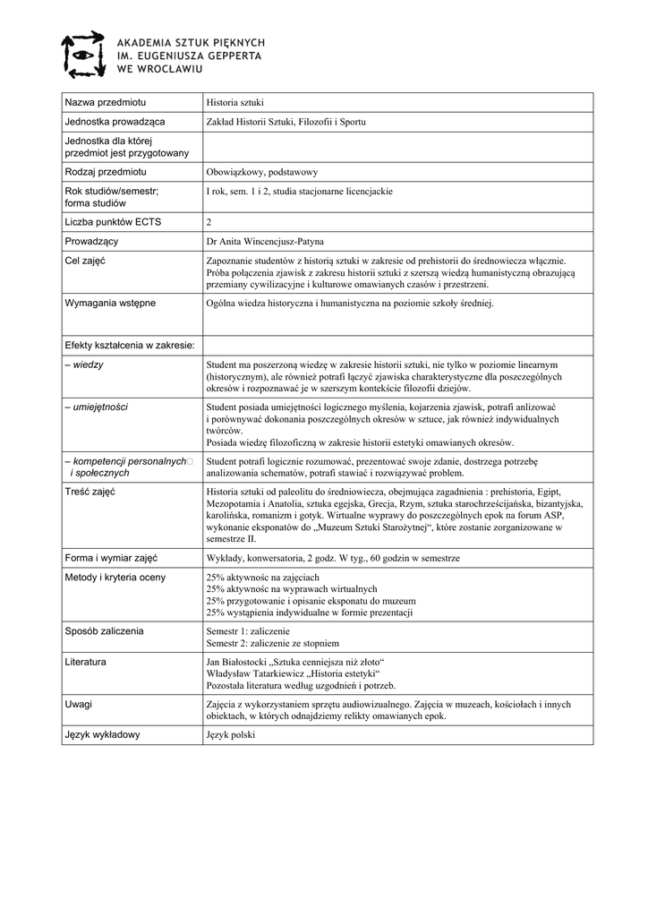Nazwa przedmiotu Historia sztuki Jednostka prowadząca Zakład Historii Sztuki, Filozofii i Sportu Jednostka dla której przedmiot jest przygotowany Rodzaj przedmiotu Obowiązkowy, podstawowy Rok studiów/semestr; forma studiów I rok, sem. 1 i 2, studia stacjonarne licencjackie Liczba punktów ECTS 2 Prowadzący Dr Anita Wincencjusz-Patyna Cel zajęć Zapoznanie studentów z historią sztuki w zakresie od prehistorii do średnowiecza włącznie. Próba połączenia zjawisk z zakresu historii sztuki z szerszą wiedzą humanistyczną obrazującą przemiany cywilizacyjne i kulturowe omawianych czasów i przestrzeni. Wymagania wstępne Ogólna wiedza historyczna i humanistyczna na poziomie szkoły średniej. Efekty kształcenia w zakresie: – wiedzy Student ma poszerzoną wiedzę w zakresie historii sztuki, nie tylko w poziomie linearnym (historycznym), ale również potrafi łączyć zjawiska charakterystyczne dla poszczególnych okresów i rozpoznawać je w szerszym kontekście filozofii dziejów. – umiejętności Student posiada umiejętności logicznego myślenia, kojarzenia zjawisk, potrafi anlizować i porównywać dokonania poszczególnych okresów w sztuce, jak również indywidualnych twórców. Posiada wiedzę filozoficzną w zakresie historii estetyki omawianych okresów. – kompetencji personalnych i społecznych Student potrafi logicznie rozumować, prezentować swoje zdanie, dostrzega potrzebę analizowania schematów, potrafi stawiać i rozwiązywać problem. Treść zajęć Historia sztuki od paleolitu do średniowiecza, obejmująca zagadnienia : prehistoria, Egipt, Mezopotamia i Anatolia, sztuka egejska, Grecja, Rzym, sztuka starochrześcijańska, bizantyjska, karolińska, romanizm i gotyk. Wirtualne wyprawy do poszczególnych epok na forum ASP, wykonanie eksponatów do „Muzeum Sztuki Starożytnej“, które zostanie zorganizowane w semestrze II. Forma i wymiar zajęć Wykłady, konwersatoria, 2 godz. W tyg., 60 godzin w semestrze Metody i kryteria oceny 25% aktywnośc na zajęciach 25% aktywnośc na wyprawach wirtualnych 25% przygotowanie i opisanie eksponatu do muzeum 25% wystąpienia indywidualne w formie prezentacji Sposób zaliczenia Semestr 1: zaliczenie Semestr 2: zaliczenie ze stopniem Literatura Jan Białostocki „Sztuka cenniejsza niż złoto“ Władysław Tatarkiewicz „Historia estetyki“ Pozostała literatura według uzgodnień i potrzeb. Uwagi Zajęcia z wykorzystaniem sprzętu audiowizualnego. Zajęcia w muzeach, kościołach i innych obiektach, w których odnajdziemy relikty omawianych epok. Język wykładowy Język polski