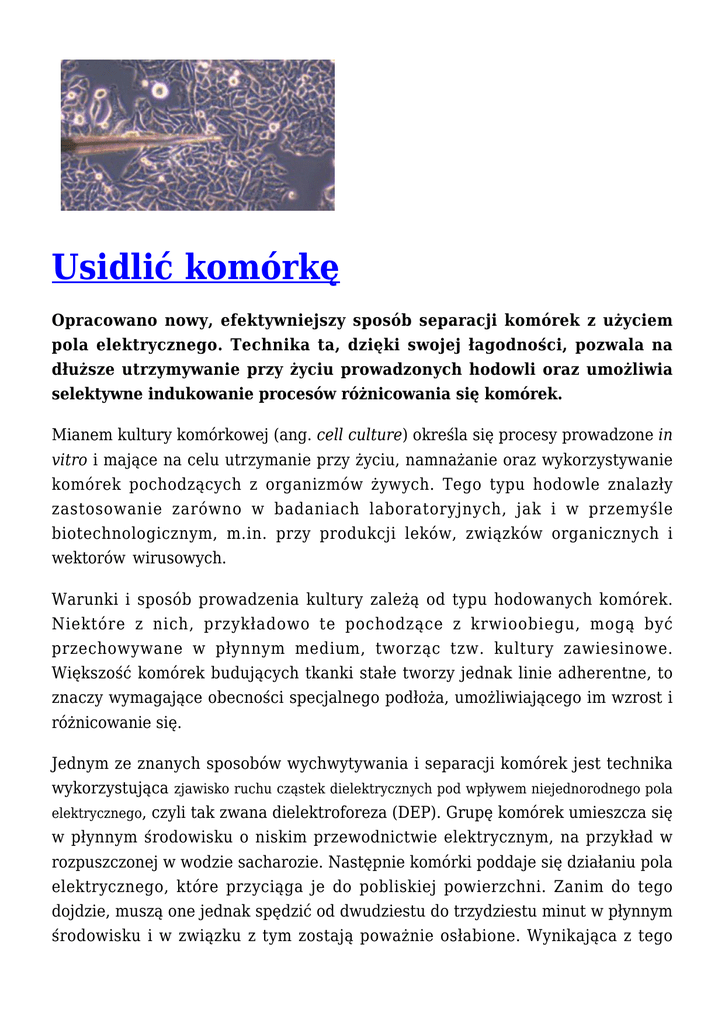 Usidlić komórkę Opracowano nowy, efektywniejszy sposób separacji komórek z użyciem pola elektrycznego. Technika ta, dzięki swojej łagodności, pozwala na dłuższe utrzymywanie przy życiu prowadzonych hodowli oraz umożliwia selektywne indukowanie procesów różnicowania się komórek. Mianem kultury komórkowej (ang. cell culture) określa się procesy prowadzone in vitro i mające na celu utrzymanie przy życiu, namnażanie oraz wykorzystywanie komórek pochodzących z organizmów żywych. Tego typu hodowle znalazły zastosowanie zarówno w badaniach laboratoryjnych, jak i w przemyśle biotechnologicznym, m.in. przy produkcji leków, związków organicznych i wektorów wirusowych. Warunki i sposób prowadzenia kultury zależą od typu hodowanych komórek. Niektóre z nich, przykładowo te pochodzące z krwioobiegu, mogą być przechowywane w płynnym medium, tworząc tzw. kultury zawiesinowe. Większość komórek budujących tkanki stałe tworzy jednak linie adherentne, to znaczy wymagające obecności specjalnego podłoża, umożliwiającego im wzrost i różnicowanie się. Jednym ze znanych sposobów wychwytywania i separacji komórek jest technika wykorzystująca zjawisko ruchu cząstek dielektrycznych pod wpływem niejednorodnego pola elektrycznego, czyli tak zwana dielektroforeza (DEP). Grupę komórek umieszcza się w płynnym środowisku o niskim przewodnictwie elektrycznym, na przykład w rozpuszczonej w wodzie sacharozie. Następnie komórki poddaje się działaniu pola elektrycznego, które przyciąga je do pobliskiej powierzchni. Zanim do tego dojdzie, muszą one jednak spędzić od dwudziestu do trzydziestu minut w płynnym środowisku i w związku z tym zostają poważnie osłabione. Wynikająca z tego krótka żywotność utrudnia przeprowadzanie eksperymentów. Ta powszechnie stosowana metoda separacji została niedawno udoskonalona przez grupę badawczą z amerykańskiego Narodowego Instytutu Standaryzacji i Technologii (ang. National Institute of Standards and Technology, NIST). Nowa technika wykorzystuje hybrydowe nośniki zbudowane z polielektrolitu posiadającego swój własny, przyciągający komórki, dodatni ładunek elektryczny oraz z naturalnego białka zwanego fibronektyną, która pomaga przetrwać przylgniętym już komórkom. Dzięki tym modyfikacjom pozostają one zawieszone w płynnym roztworze jedynie przez około cztery minuty, a ich żywotność po takim zabiegu zwiększa się o około tydzień. Nowa technika może się okazać bardzo cenna podczas indukowania selektywnego różnicowania się komórek, co ułatwi przeprowadzanie badań nad sposobami ich wzajemnego komunikowania się i rozwoju. Obecnie trwają już prace nad poznaniem roli, jaką w procesie filtrowania toksyn z krwioobiegu odgrywają poszczególne typy komórek budujących wątrobę. Ma to istotne znaczenie w analizach toksykologicznych. Literatura: Reyes Darwin R., Hong Jennifer S., Elliott John T., Gaitan Michael, Hybrid Cell Adhesive Material for Instant Dielectrophoretic Cell Trapping and Long-Term Cell Function Assessment, Langmuir 27 (2011), s. 10027–10034. Opracowano nowy, efektywniejszy sposób separacji komórek z użyciem pola elektrycznego. Data publikacji: 27.08.2011r.