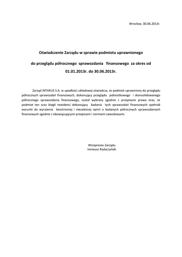 Wrocław, 30.06.2013r. Oświadczenie Zarządu w sprawie podmiotu uprawnionego do przeglądu półrocznego sprawozdania finansowego za okres od 01.01.2013r. do 30.06.2013r. Zarząd INTAKUS S.A. w upadłości układowej oświadcza, że podmiot uprawniony do przeglądu półrocznych sprawozdań finansowych, dokonujący przeglądu jednostkowego i skonsolidowanego półrocznego sprawozdania finansowego, został wybrany zgodnie z przepisami prawa oraz, że podmiot ten oraz biegli rewidenci dokonujący badania tych sprawozdań finansowych spełniali warunki do wyrażenia bezstronnej i niezależnej opinii o badanych półrocznych sprawozdaniach finansowych zgodnie z obowiązującymi przepisami i normami zawodowymi. Wiceprezes Zarządu Ireneusz Radaczyński