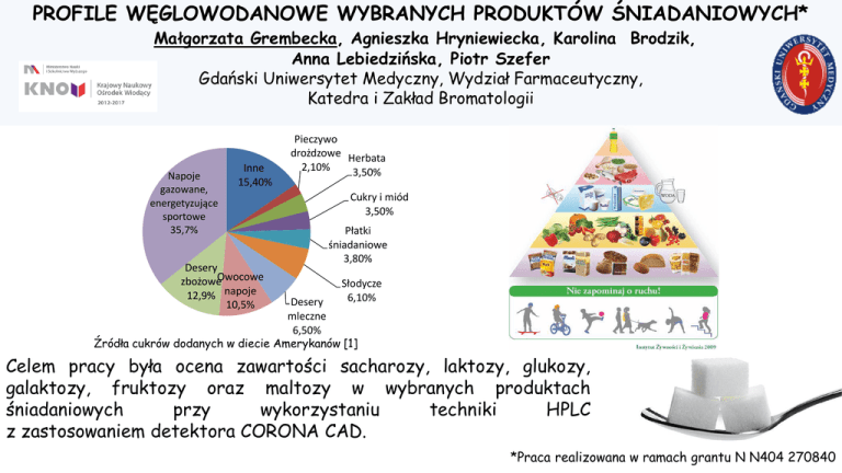 PROFILE WĘGLOWODANOWE WYBRANYCH PRODUKTÓW ŚNIADANIOWYCH* Małgorzata Grembecka, Agnieszka Hryniewiecka, Karolina Brodzik, Anna Lebiedzińska, Piotr Szefer Gdański Uniwersytet Medyczny, Wydział Farmaceutyczny, Katedra i Zakład Bromatologii Napoje gazowane, energetyzujące sportowe 35,7% Inne 15,40% Desery zbożoweOwocowe 12,9% napoje 10,5% Pieczywo drożdzowe Herbata 2,10% 3,50% tek Cukry i miód 3,50% Płatki śniadaniowe 3,80% Słodycze 6,10% Desery mleczne 6,50% Źródła cukrów dodanych w diecie Amerykanów [1] Celem pracy była ocena zawartości sacharozy, laktozy, glukozy, galaktozy, fruktozy oraz maltozy w wybranych produktach śniadaniowych przy wykorzystaniu techniki HPLC z zastosowaniem detektora CORONA CAD. *Praca realizowana w ramach grantu N N404 270840 Materiał badawczy obejmował następujące rodzaje produktów: 7 płatków śniadaniowych 3 herbat rozpuszczalnych 9 dżemów, konfitur, powideł 14 produktów mleczarskich Przygotowanie badanych próbek: Odważanie badanej próbki i dodanie 25 mL fazy ekstrakcyjnej (1:1 metanol i woda) Wytrząsanie ( 25 st. C, 1 h) Sączenie przez sączki membranowe do próbówek Sączenie przez sączki strzykawkowe do ependorfów Odwirowanie Sporządzenie odpowiedniego rozcieńczenia Analiza próbek z wykorzystaniem HPLC-CAD Precyzja = RSD = 1,60-5,03% Dokładność = Odzysk = 96,1-102% Chromatogram próbek płatków śniadaniowych Smako Corn Flakes – próba podstawowa (1) i próby z wzbogaceniem : 10 µg/mL (2) , 20 µg/mL (3), 30 µg/mL (4) erytritolu (ER), fruktozy (FR), glukozy (GL), sacharozy (SA), maltoza (MA). Całkowita zawartość cukrów 82,8 Płatki śniadaniowe 100 40 g/100 g 60 35,4 40 9,80 4,89 20 30 20 10 0 Nestle Smako 0 Dżemy Płatki śniadaniowe Herbatki 80 Produkty mleczarskie Sante Wartość oznaczona cukrów Gellwe Borin Lubella de Your Wartość deklarowana cukrów Profile węglowodanowe produktów śniadaniowych 68,0 60 g/100 g g/100g 80 40 21,8 SACHAROZA FRUKTOZA GLUKOZA 14,7 20 0 Dżemy Płatki śniadaniowe Herbatki Produkty mleczarskie Produkt Węglowodany [g] (porcja) RDAa [%] Zalecana dzienna ilość cukrów dodanych w diecieb [%] 1000 kcal 2000 kcal Łowicz dżem truskawkowy Nestle, Corn Flakes Smako, Corn Flakes 15,7 (15 g) 12,08 62,8 31,4 25,0 (30 g) 24,5 (30g) 19,25 18,85 100,1 98 50,0 49,0 Płatki Borin de Jour 24,6 (30 g) 18,92 98,4 49,2 Gluten free, Corn flakes 24,5 (30 g) 18,85 98,0 49,0 Lubella, Corn Flakes ECO+ Napój herbaciany o smaku malinowym Danio serek homogenizowany o smaku waniliowym Benecol truskawkowy 25,5 (30g) 19,62 102 51,0 15,5 (16 g) 11,92 62,0 31,0 23,7 (150g) 18,23 94,8 47,4 19,4 (125g) 14,92 77,6 38,8 a Zalecane b spożycie (RDA) węglowodanów wynosi 130 g/dzień [2] <10% zapotrzebowania energetycznego 1. 2. Dietary Guidelines for Americans, 2010 Jarosz M. Normy żywienia dla populacji polskiej – nowelizacja. IŻŻ 2012 Podsumowanie 1. Wykorzystana metoda analityczna umożliwia jakościowe i ilościowe oznaczenie fruktozy, sacharozy, sumy glukozy i galaktozy, laktozy i maltozy w badanych produktach śniadaniowych. 2. Analiza wykazała największą średnią zawartość badanych cukrów, tj. 82,95 g/100 g w herbatach rozpuszczalnych,natomiast najmniejszą w płatkach śniadaniowych (4,89 g/100 g). 3. Ze względu na dużą zawartość owoców w dżemach oznaczono w nich największą ilość fruktozy (21,8 g/100 g). 4. Wykazano różnice w zawartościach węglowodanów oznaczonych i deklarowanych przez producenta na etykiecie.