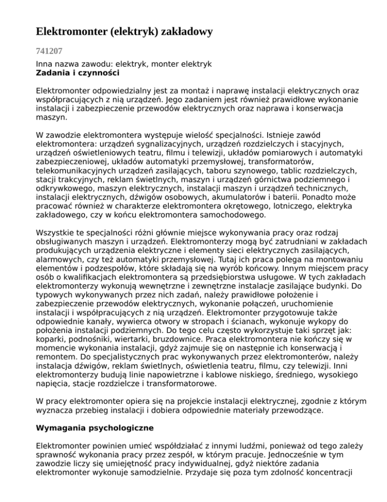 Elektromonter (elektryk) zakładowy 741207 Inna nazwa zawodu: elektryk, monter elektryk Zadania i czynności Elektromonter odpowiedzialny jest za montaż i naprawę instalacji elektrycznych oraz współpracujących z nią urządzeń. Jego zadaniem jest również prawidłowe wykonanie instalacji i zabezpieczenie przewodów elektrycznych oraz naprawa i konserwacja maszyn. W zawodzie elektromontera występuje wielość specjalności. Istnieje zawód elektromontera: urządzeń sygnalizacyjnych, urządzeń rozdzielczych i stacyjnych, urządzeń oświetleniowych teatru, filmu i telewizji, układów pomiarowych i automatyki zabezpieczeniowej, układów automatyki przemysłowej, transformatorów, telekomunikacyjnych urządzeń zasilających, taboru szynowego, tablic rozdzielczych, stacji trakcyjnych, reklam świetlnych, maszyn i urządzeń górnictwa podziemnego i odkrywkowego, maszyn elektrycznych, instalacji maszyn i urządzeń technicznych, instalacji elektrycznych, dźwigów osobowych, akumulatorów i baterii. Ponadto może pracować również w charakterze elektromontera okrętowego, lotniczego, elektryka zakładowego, czy w końcu elektromontera samochodowego. Wszystkie te specjalności różni głównie miejsce wykonywania pracy oraz rodzaj obsługiwanych maszyn i urządzeń. Elektromonterzy mogą być zatrudniani w zakładach produkujących urządzenia elektryczne i elementy sieci elektrycznych zasilających, alarmowych, czy też automatyki przemysłowej. Tutaj ich praca polega na montowaniu elementów i podzespołów, które składają się na wyrób końcowy. Innym miejscem pracy osób o kwalifikacjach elektromontera są przedsiębiorstwa usługowe. W tych zakładach elektromonterzy wykonują wewnętrzne i zewnętrzne instalacje zasilające budynki. Do typowych wykonywanych przez nich zadań, należy prawidłowe położenie i zabezpieczenie przewodów elektrycznych, wykonanie połączeń, uruchomienie instalacji i współpracujących z nią urządzeń. Elektromonter przygotowuje także odpowiednie kanały, wywierca otwory w stropach i ścianach, wykonuje wykopy do położenia instalacji podziemnych. Do tego celu często wykorzystuje taki sprzęt jak: koparki, podnośniki, wiertarki, bruzdownice. Praca elektromontera nie kończy się w momencie wykonania instalacji, gdyż zajmuje się on następnie ich konserwacją i remontem. Do specjalistycznych prac wykonywanych przez elektromonterów, należy instalacja dźwigów, reklam świetlnych, oświetlenia teatru, filmu, czy telewizji. Inni elektromonterzy budują linie napowietrzne i kablowe niskiego, średniego, wysokiego napięcia, stacje rozdzielcze i transformatorowe. W pracy elektromonter opiera się na projekcie instalacji elektrycznej, zgodnie z którym wyznacza przebieg instalacji i dobiera odpowiednie materiały przewodzące. Wymagania psychologiczne Elektromonter powinien umieć współdziałać z innymi ludźmi, ponieważ od tego zależy sprawność wykonania pracy przez zespół, w którym pracuje. Jednocześnie w tym zawodzie liczy się umiejętność pracy indywidualnej, gdyż niektóre zadania elektromonter wykonuje samodzielnie. Przydaje się poza tym zdolność koncentracji uwagi, a także dobra pamięć (zwłaszcza jeśli chodzi o pracę przy skomplikowanych układach sieci elektrycznej). Ważna jest też łatwość podporządkowania się osobom kierującym jego pracą. Każdy, kto podejmuje pracę w tym zawodzie powinien być świadomy, że bardzo ważne jest poczucie odpowiedzialności za wykonywane czynności. Niedbałość w wykonaniu napraw lub dokonaniu pomiarów, spowodować może poważne straty materialne i narazić na niebezpieczeństwo obsługujących urządzenia, a nawet może dojść do narażenia czyjegoś życia. Sam pracownik podczas wykonywania pracy również naraża własne zdrowie i życie, dlatego też elektromontera powinna cechować szczególna dyscyplina, dokładność i skrupulatność w wykonywaniu zadań. Charakterystyczne dla tego typu pracy są zainteresowania techniczne (wiążą się one z umiejętnością posługiwania się różnego typu narzędziami oraz umiejętnością czytania rysunków technicznych). Elektromonter powinien także znać zagadnienia związane z fizyką i matematyką. Wymagania fizyczne i zdrowotne Praca elektromontera należy do ciężkich prac fizycznych. Wymaga ona często ręcznego przenoszenia różnych materiałów (samo okablowanie w przypadku elektromontera sieci elektrycznych może ważyć kilkadziesiąt kilogramów). Jej specyfiką jest wykonywanie przez elektromontera prac w ciągłym ruchu (chodząc, wspinając się, podnosząc), a wielu w pozycji wymuszonej. Z tego powodu niezbędna jest w tym zawodzie wysoka ogólna wydolność organizmu. Elektromontera pracującego na wysokości bezwzględnie musi cechować również duża sprawność narządów równowagi, nie może on w żadnym wypadku mieć lęku wysokości. Do niezbędnych sprawności w tym zawodzie zaliczyć należy koordynację wzrokowo-ruchową, tzn. umiejętność równoczesnego współdziałania narządów wzroku i ruchu. W tym zawodzie przydaje się również zdolność dobrego widzenia (widzenie barw, ostrość wzroku, widzenie po zmroku), jednakże dopuszcza się do tej pracy osoby o wadach wzroku poddających się korekcji. Elektromonter powinien także mieć dobrą koordynację wzrokowo – ruchową oraz sprawny zmysł równowagi, dobry słuch i węch. Ważna jest też duża sprawność układu mięśniowego, układu kostno-stawowego i dobra sprawność narządu dotyku. Istnieje wiele przeciwwskazań do podjęcia pracy na stanowisku elektromontera. Są to przede wszystkim: brak widzenia obuocznego (wyklucza m.in. pracę przy aparaturze kontrolno-pomiarowej), nieprawidłowe widzenie barw zasadniczych (różnokolorowe przewody), zaburzenia węchu (zapach izolacji przy zwarciu), zaburzenia równowagi i świadomości (praca z prądem, przy aparaturze), padaczka. Warunki podjęcia pracy w zawodzie O