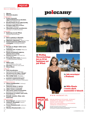 NR 32 15 SIERPNIA 2016 8 12 Skaner Zdarzyło się jutro PA ŃS T WO 14 Próba zrzucenia odpowiedzialności za zbrodnie. ZDF kontra żołnierze AK 18 Kurski dostał od nas żółtą kartkę. Rozmowa z Joanną Lichocką 22 Grzegorz łapie PO za twarz. Utwardzanie Platformy 24 Wszystkie grzechy narodowców. Dlaczego są w politycznej niszy R A P O RT 28 Będziemy żyć jak Włosi. Strategia Morawieckiego NA R Ó D 36 Nowe rozdanie w Kościele. Kto spodoba się Franciszkowi 38 Wakacje z luksusem. „Wprost” na lato 46 Zostań mistrzem publicznych wystąpień. Coaching zawodowy R A P O RT 47 Recepta na długie i dobre życie. 25 sposobów eprasa.pl 50 Jesteśmy tym, co jemy. Medycyna prewencyjna 52 Kiedy przedsionki migoczą, niszczą serce i mózg 54 Szansa na życie. Jak bronić się przed udarem 56 Ortopedia XXI wieku. Rozmowa z ortopedą Michałem Szyszką RY N E K 60 Milion polo. Jak się zarabia na disco polo 28 Według Morawieckiego już za 14 lat będziemy żyć jak Włosi K R AJ E 68 Unia lewoskrętna. Komisja Europejska po Brexicie 71 Jak potoczy się wojna z Rosją? Rozmowa z Richardem Shirreffem 74 Kto rozbije bank. Pieniądze w kampanii prezydenckiej w USA 71 Jak zwyciężyć z Putinem 76 Państwo zaginionych dzieci. Dlaczego porywa się małych Chińczyków C Y W I L I Z AC JA 78 Wiwat niedojrzałość. Animacje dla dorosłych 81 Upiornie zdolny w operze. Krystian Krzeszowiak ma głos 84 Allen i beton z owsianki 88 Jak cenzor został recenzentem. Naukowcy badają nowy gatunek 95 Mila Kunis i reszta złych mamusiek w kinach 90 Rewolucja na wodzie i pod wodą. Podwodne drony 92 Książki, muzyka, filmy, auto, W W W . W PR O S T . PL know-how FELIETONY 17 Paweł Kowal o świadkach historii 26 Antoni Z. Kamiński o dużych kwantyfikatorach 35 Cezary Kaźmierczak o zdrowym rozsądku 98 Mariusz Staniszewski na finał 4 PE Ł N E B I E Ż ĄC E W Y DA N I E „W PR O S T ” P O B I E R Z NA S WOJ E G O I PH O N E ’A, I PA DA ( A P P S T O R E ) O R A Z NA U R Z Ą D Z E N I A Z S YS T E M E M A N D R O I D ( G O O GL E P L AY ) PROJEKT OKŁADKI: STUDIO „WPROST” ZDJĘCIE: ROGER VIOLLET/GETTY IMAGES, RUE DES ARCHIVES/ TALL/FORUM, ANDRZEJ STAWIŃSKI/REPORTER 14 S I E R P N I A 2016 ZDJĘCIA: JAKUB KAMIŃSKI/PAP, ISTOCK, 123RF, VITALY NEVAR/TASS/FORUM, MICHELE K. SHORT/2016 STX PRODUCTIONS 64 Gaz-mat. Paliwowa szara strefa 66 Hossa Bessa