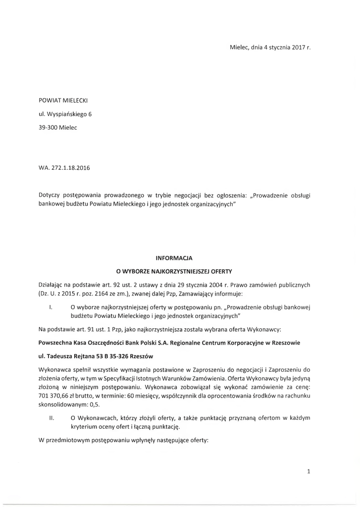 Mielec, dnia 4 stycznia 2017 r. POWIAT MIELECKI ul. Wyspiańskiego 6 39-300 Mielec WA. 272.1.18.2016 Dotyczy postępowania prowadzonego w trybie negocjacji bez ogłoszenia: „Prowadzenie obsługi bankowej budżetu Powiatu Mieleckiego i jego jednostek organizacyjnych" INFORMACJA O WYBORZE NAJKORZYSTNIEJSZEJ OFERTY Działając na podstawie art. 92 ust. 2 ustawy z dnia 29 stycznia 2004 r. Prawo zamówień publicznych (Dz. U. z 2015 r. poz. 2164 ze zm.), zwanej dalej Pzp, Zamawiający informuje: I. O wyborze najkorzystniejszej oferty w postępowaniu pn. „Prowadzenie obsługi bankowej budżetu Powiatu Mieleckiego i jego jednostek organizacyjnych" Na podstawie art. 91 ust. 1 Pzp, jako najkorzystniejsza została wybrana oferta Wykonawcy: Powszechna Kasa Oszczędności Bank Polski S.A. Regionalne Centrum Korporacyjne w Rzeszowie ul. Tadeusza Rejtana 53 B 35-326 Rzeszów Wykonawca spełnił wszystkie wymagania postawione w Zaproszeniu do negocjacji i Zaproszeniu do złożenia oferty, w tym w Specyfikacji Istotnych Warunków Zamówienia. Oferta Wykonawcy była jedyną złożoną w niniejszym postępowaniu. Wykonawca zobowiązał się wykonać zamówienie za cenę: 701 370,66 zł brutto, w terminie: 60 miesięcy, współczynnik dla oprocentowania środków na rachunku skonsolidowanym: 0,5. II. O Wykonawcach, którzy złożyli oferty, a także punktację przyznaną ofertom w każdym kryterium oceny ofert i łączną punktację. W przedmiotowym postępowaniu wpłynęły następujące oferty: 1 Punktacja dla danego kryterium Nr oferty 1. Nazwa albo imię i nazwisko, siedziba albo miejsce zamieszkania i adres Wykonawcy Powszechna Kasa Oszczędności Bank Polski S.A. Regionalne Centrum Korporacyjne w Rzeszowie ul. Tadeusza Rejtana 53 B 35-326 Rzeszów Łączna punktacja 95 Kryterium cena 60 Kryterium współczynnik dla oprocentowania środków na rachunku skonsolidowanym Kryterium liczba placówek 10 25 III. Zamawiający w niniejszym postępowaniu nie ustanowił dynamicznego systemu zakupów. I\ 2