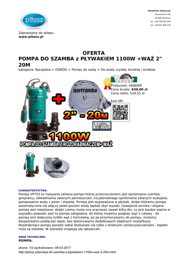 PitoszPiotr Adamczyk Pszczelińska 102 05-805 Otrębusy tel. +48 790 354 038 tel. +48 501 858 218 Zapraszamy do sklepu www.pitosz.pl OFERTA POMPA DO SZAMBA z PŁYWAKIEM 1100W +WĄŻ 2" 20M kategoria: Narzędzia > OGRÓD > Pompy do wody > Do wody czystej, brudnej i ścieków Producent: VANDER Cena brutto: 639,00 zł Cena netto: 519,51 zł Kod QR: CHARAKTERYSTYKA: Pompa VP753 to masywna żeliwna pompa której przeznaczeniem jest opróżnianie szamba, gnojowicy, odwadniania zalanych pomieszczeń, incydentalnego opróżniania zalanych wykopów, pompowania wody z jezior i stawów. Pompa jest wyposażona w pływak, dzięki któremu pompa automatycznie się włączy jeżeli poziom wody będzie zbyt wysoki. Uzwojenie wirnika i stojana pompy jest miedziane, dzięki czemu może ona pracować nawet kilka dni, co jest bardzo ważne w wypadku powodzi. Jest to pompa zatapialna, do której możemy podpiąć wąż 2 calowy - do pompy jest dołączony krótki wąż z końcówką; po jej przymocowaniu do pompy, możemy bezpośrednio podłączać węże, bez dokonywania dodatkowych zbędnych modyfikacji. Rozdrabniacz pompy poradzi sobie doskonale nie tylko z drobnymi zanieczyszczeniami - łopatki noża są stalowe. W zestawie znajdują się rękawiczki. DANE TECHNICZNE: POMPA: strona: 1/2 wydrukowano: 08-03-2017 http://pitosz.pl/pompa-do-szamba-z-plywakiem-1100w-waz-2-20m.html Napięcie i częstotliwość: 230V-50Hz Pobór mocy: 1100W Wyłącznik pływakowy Wydajność: 15000 L/H Wysokość podnoszenia: 10m Długość przewodu zasilającego: 10m Wymiary: 46x25x25 WĄŻ: Długość 20M Średnica 2" Kolor biały Ciśnienie robocze 6 bar Zakończony szybko złączami WYPOSAŻENIE PODSTAWOWE: -Pompa z rozdrabniaczem 1100W z zestawie z wężem -Rękawiczki -Śrubokręt -Opaska zaciskowa strona: 2/2 wydrukowano: 08-03-2017 http://pitosz.pl/pompa-do-szamba-z-plywakiem-1100w-waz-2-20m.html
