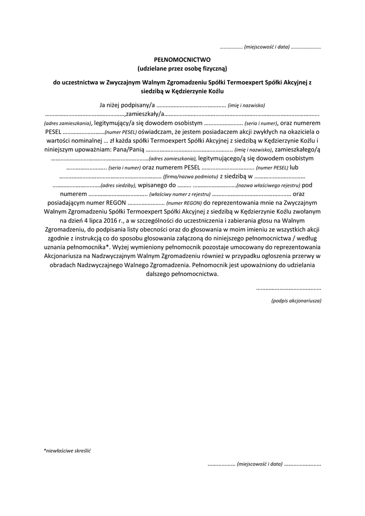 ……………… (miejscowość i data) …………………… PEŁNOMOCNICTWO (udzielane przez osobę fizyczną) do uczestnictwa w Zwyczajnym Walnym Zgromadzeniu Spółki Termoexpert Spółki Akcyjnej z siedzibą w Kędzierzynie Koźlu Ja niżej podpisany/a ……………………………………… (imię i nazwisko) ……………………………………………,zamieszkały/a………………………………………………………………………………………. (adres zamieszkania), legitymujący/a się dowodem osobistym ……………………. (seria i numer), oraz numerem PESEL ………………………(numer PESEL) oświadczam, że jestem posiadaczem akcji zwykłych na okaziciela o wartości nominalnej … zł każda spółki Termoexpert Spółki Akcyjnej z siedzibą w Kędzierzynie Koźlu i niniejszym upoważniam: Pana/Panią ……………………………………………….. (imię i nazwisko), zamieszkałego/ą ………………………………………………………(adres zamieszkania), legitymującego/ą się dowodem osobistym …………………….. (seria i numer) oraz numerem PESEL ……………………………. (numer PESEL) lub ………………………………………………………… (firma/nazwa podmiotu) z siedzibą w …………………………… ………………………….(adres siedziby), wpisanego do ……… ……………………….(nazwa właściwego rejestru) pod numerem ……………………………….. (właściwy numer z rejestru) …………………………………………… oraz posiadającym numer REGON …………………… (numer REGON) do reprezentowania mnie na Zwyczajnym Walnym Zgromadzeniu Spółki Termoexpert Spółki Akcyjnej z siedzibą w Kędzierzynie Koźlu zwołanym na dzień 4 lipca 2016 r., a w szczególności do uczestniczenia i zabierania głosu na Walnym Zgromadzeniu, do podpisania listy obecności oraz do głosowania w moim imieniu ze wszystkich akcji zgodnie z instrukcją co do sposobu głosowania załączoną do niniejszego pełnomocnictwa / według uznania pełnomocnika*. Wyżej wymieniony pełnomocnik pozostaje umocowany do reprezentowania Akcjonariusza na Nadzwyczajnym Walnym Zgromadzeniu również w przypadku ogłoszenia przerwy w obradach Nadzwyczajnego Walnego Zgromadzenia. Pełnomocnik jest upoważniony do udzielania dalszego pełnomocnictwa. …………………………………… (podpis akcjonariusza) *niewłaściwe skreślić ……………… (miejscowość i data) …………………… PEŁNOMOCNICTWO (udzielane przez osobę prawną) do uczestnictwa w Zwyczajnym Walnym Zgromadzeniu Spółki Termoexpert Spółki Akcyjnej z siedzibą w Kędzierzynie Koźlu Ja/My niżej podpisany/a/i reprezentując ……………………… (firma/nazwa podmiotu) …………………………………………, z siedzibą w ………………………………………… (adres siedziby) wpisany do ……………………………………………………………. (nazwa właściwego rejestru) pod numerem …………………… (właściwy numer z rejestru) oraz posiadający numer REGON …………………… (numer REGON) oświadczam/y, że……………………………………….(firma/nazwa podmiotu) jest posiadaczem akcji zwykłych na okaziciela o wartości nominalnej …. zł każda spółki Termoexpert Spółki Akcyjnej z siedzibą w Kędzierzynie Koźlu i niniejszym upoważniam/y: Pana/Panią ………………………………………………… (imię i nazwisko) zamieszkałego/ą ………………………………………………………………… (adres zamieszkania), legitymującego/ą się dowodem osobistym ……………………… (seria i numer) oraz numerem PESEL ………………………….. (numer PESEL) lub …………………………………………….. (firma/nazwa podmiotu) z siedzibą w …………………………………………………………. (adres siedziby), wpisanego do ……… ……………………….(nazwa właściwego rejestru) pod numerem ………………………………. (właściwy numer z rejestru) oraz posiadającym numer REGON …………………… (numer REGON) do reprezentowania ……………………………………….(firma/nazwa podmiotu) na Zwyczajnym Walnym Zgromadzeniu Termoexpert Spółki Akcyjnej z siedzibą w Kędzierzynie Koźlu zwołanym na dzień 4 lipca 2016 r., a w szczególności do uczestniczenia i zabierania głosu na Walnym Zgromadzeniu, do podpisania listy obecności oraz do głosowania w naszym imieniu ze wszystkich akcji zgodnie z instrukcją co do sposobu głosowania załączoną do niniejszego pełnomocnictwa / według uznania pełnomocnika*. Wyżej wymieniony pełnomocnik pozostaje umocowany do reprezentowania Akcjonariusza na Nadzwyczajnym Walnym Zgromadzeniu również w przypadku ogłoszenia przerwy w obradach Nadzwyczajnego Walnego Zgromadzenia. Pełnomocnik jest upoważniony do udzielania dalszego pełnomocnictwa. …………………………………… (podpis osób reprezentujących akcjonariusza) Załącznik: odpis z właściwego rejestru akcjonariusza *niewłaściwe skreślić.
