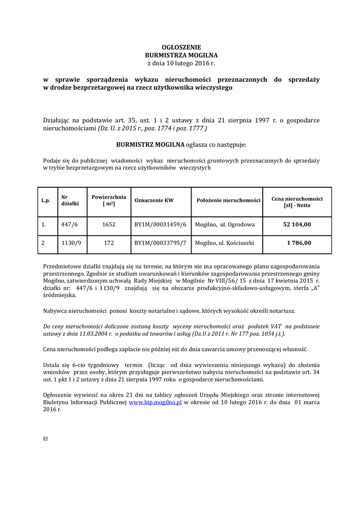 OGŁOSZENIE BURMISTRZA MOGILNA z dnia 10 lutego 2016 r. w sprawie sporządzenia wykazu nieruchomości przeznaczonych do sprzedaży w drodze bezprzetargowej na rzecz użytkownika wieczystego Działając na podstawie art. 35, ust. 1 i 2 ustawy z dnia 21 sierpnia 1997 r. o gospodarce nieruchomościami (Dz. U. z 2015 r., poz. 1774 i poz. 1777 ) BURMISTRZ MOGILNA ogłasza co następuje: Podaje się do publicznej wiadomości wykaz nieruchomości gruntowych przeznaczonych do sprzedaży w trybie bezprzetargowym na rzecz użytkowników wieczystych L.p. Nr działki Powierzchnia [ m2] 1. 447/6 1652 BY1M/00031459/6 Mogilno, ul. Ogrodowa 52 104,00 2 1130/9 172 BY1M/00033795/7 Mogilno, ul. Kościuszki 1 786,00 Oznaczenie KW Położenie nieruchomości Cena nieruchomości [zł] - Netto Przedmiotowe działki znajdują się na terenie, na którym nie ma opracowanego planu zagospodarowania przestrzennego. Zgodnie ze studium uwarunkowań i kierunków zagospodarowania przestrzennego gminy Mogilno, zatwierdzonym uchwałą Rady Miejskiej w Mogilnie Nr VIII/56/ 15 z dnia 17 kwietnia 2015 r. działki nr: 447/6 i 1130/9 znajdują się na obszarze produkcyjno-składowo-usługowym, sterfa „A” śródmiejska. Nabywca nieruchomości ponosi koszty notarialne i sądowe, których wysokość określi notariusz. Do ceny nieruchomości doliczone zostaną koszty wyceny nieruchomości oraz podatek VAT na podstawie ustawy z dnia 11.03.2004 r. o podatku od towarów i usług (Dz.U z 2011 r. Nr 177 poz. 1054 j.t.). Cena nieruchomości podlega zapłacie nie później niż do dnia zawarcia umowy przenoszącej własność. Ustala się 6-cio tygodniowy termin (licząc od dnia wywieszenia niniejszego wykazu) do złożenia wniosków przez osoby, którym przysługuje pierwszeństwo nabycia nieruchomości na podstawie art. 34 ust. 1 pkt 1 i 2 ustawy z dnia 21 sierpnia 1997 roku o gospodarce nieruchomościami. Ogłoszenie wywiesić na okres 21 dni na tablicy ogłoszeń Urzędu Miejskiego oraz stronie internetowej Biuletynu Informacji Publicznej www.bip.mogilno.pl w okresie od 10 lutego 2016 r. do dnia 01 marca 2016 r. El