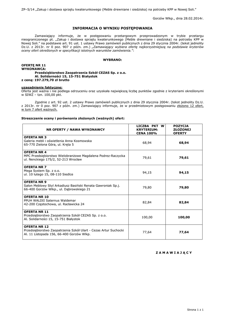ZP–5/14 „Zakup i dostawa sprzętu kwaterunkowego (Meble drewniane i siedziska) na potrzeby KPP w Nowej Soli.” Gorzów Wlkp., dnia 28.02.2014r. INFORMACJA O WYNIKU POSTĘPOWANIA Zamawiający informuje, że w postępowaniu przetargowym przeprowadzonym w trybie przetargu nieograniczonego pt. „Zakup i dostawa sprzętu kwaterunkowego (Meble drewniane i siedziska) na potrzeby KPP w Nowej Soli.” na podstawie art. 91 ust. 1 ustawy Prawo zamówień publicznych z dnia 29 stycznia 2004r. (tekst jednolity Dz.U. z 2013r. nr 0 poz. 907 z późn. zm.) „Zamawiający wybiera ofertę najkorzystniejszą na podstawie kryteriów oceny ofert określonych w specyfikacji istotnych warunków zamówienia.”: WYBRANO: OFERTĘ NR 11 WYKONAWCA: Przedsiębiorstwo Zaopatrzenia Szkół CEZAS Sp. z o.o. Al. Solidarności 15, 15-751 Białystok z ceną: 197.279,70 zł brutto uzasadnienie faktyczne: Oferta jest ważna i nie podlega odrzuceniu oraz uzyskała największą liczbę punktów zgodnie z kryteriami określonymi w SIWZ – tzn. 100,00 pkt. Zgodnie z art. 92 ust. 2 ustawy Prawo zamówień publicznych z dnia 29 stycznia 2004r. (tekst jednolity Dz.U. z 2013r. nr 0 poz. 907 z późn. zm.) Zamawiający informuje, że w przedmiotowym postępowaniu złożono 12 ofert, w tym 7 ofert ważnych. Streszczenie oceny i porównania złożonych (ważnych) ofert: NR OFERTY / NAWA WYKONAWCY OFERTA NR 3 Galeria mebli i oświetlenia Anna Kosmowska 65-770 Zielona Góra, ul. Kręta 5 OFERTA NR 4 MPC Przedsiębiorstwo Wielobranżowe Magdalena Podrez-Raczycka ul. Nenckiego 175/2, 52-213 Wrocław OFERTA NR 7 Mega System Sp. z o.o. ul. 10 lutego 15, 08-110 Siedlce OFERTA NR 9 Salon Meblowy Styl Arkadiusz Basiński Renata Gawroniak Sp.j. 66-400 Gorzów Wlkp., ul. Dąbrowskiego 21 OFERTA NR 10 PPUH WALDII Saternus Waldemar 42-200 Częstochowa, ul. Racławicka 24 OFERTA NR 11 Przedsiębiorstwo Zaopatrzenia Szkół CEZAS Sp. z o.o. Al. Solidarności 15, 15-751 Białystok OFERTA NR 12 Przedsiębiorstwo Zaopatrzenia Szkół Ulart - Cezas Artur Suchocki Al. 11 Listopada 156, 66-400 Gorzów Wlkp. LICZBA PKT W KRYTERIUM: CENA 100% POZYCJA ZŁOŻONEJ OFERTY 68,94 68,94 79,61 79,61 94,15 94,15 79,80 79,80 82,84 82,84 100,00 100,00 77,64 77,64 ZAMAWIAJĄCY Strona 1 z 1