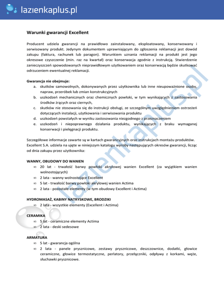 Warunki gwarancji Excellent Producent udziela gwarancji na prawidłowo zainstalowany, eksploatowany, konserwowany i serwisowany produkt. Jedynym dokumentem uprawniającym do zgłoszenia reklamacji jest dowód zakupu (faktura, rachunek lub paragon). Warunkiem uznania reklamacji na produkt jest jego okresowe czyszczenie (min. raz na kwartał) oraz konserwacja zgodnie z instrukcją. Stwierdzenie zanieczyszczeń spowodowanych nieprawidłowym użytkowaniem oraz konserwacją będzie skutkować odrzuceniem ewentualnej reklamacji. Gwarancja nie obejmuje: a. skutków samowolnych, dokonywanych przez użytkownika lub inne nieupoważnione osoby, napraw, przeróbek lub zmian konstrukcyjnych b. uszkodzeń mechanicznych oraz chemicznych powłoki, w tym wynikających z zastosowania środków żrących oraz ciernych, c. skutków nie stosowania się do instrukcji obsługi, ze szczególnym uwzględnieniem ostrzeżeń dotyczących instalacji, użytkowania i serwisowania produktu d. uszkodzeń powstałych w wyniku zastosowania niezgodnego z przeznaczeniem e. uszkodzeń i niepoprawnego działania produktu, wynikających z braku wymaganej konserwacji i pielęgnacji produktu. Szczegółowe informacje zawarte są w kartach gwarancyjnych oraz instrukcjach montażu produktów. Excellent S.A. udziela na ujęte w niniejszym katalogu wyroby następujących okresów gwarancji, licząc od dnia zakupu przez użytkownika: WANNY, OBUDOWY DO WANIEN • 20 lat - trwałość barwy powłoki akrylowej wanien Excellent (za wyjątkiem wanien wolnostojących) • 2 lata - wanny wolnostojące Excellent • 5 lat - trwałość barwy powłoki akrylowej wanien Actima • 2 lata - pozostałe elementy (w tym obudowy Excellent i Actima) HYDROMASAŻ, KABINY NATRYSKOWE, BRODZIKI • 2 lata - wszystkie elementy (Excellent i Actima) CERAMIKA • 5 lat - ceramiczne elementy Actima • 2 lata - deski sedesowe ARMATURA • 5 lat - gwarancja ogólna • 2 lata - panele prysznicowe, zestawy prysznicowe, deszczownice, dodatki, głowice ceramiczne, głowice termostatyczne, perlatory, przełączniki, odpływy z korkami, węże, słuchawki prysznicowe. Zasady składania reklamacji Podstawę złożenia reklamacji stanowi dowód zakupu (faktura, rachunek, paragon), a w przypadku wanien z hydromasażem także podbita karta gwarancyjna oraz świadectwo podłączenia elektrycznego. Reklamację można zgłaszać w miejscu zakupu produktu lub bezpośrednio u producenta. Sprzedawca ma obowiązek ustosunkowania się do żądania Klienta i poinformowania go o tym fakcie w terminie nie dłuższym niż 14 dni od dnia zgłoszenia reklamacji przez Klienta. Gwarancja obejmuje produkty sprzedane i zainstalowane na terenie Rzeczypospolitej Polskiej. Excellent S.A. zastrzega sobie prawo do zmian produkcyjnych i modyfikacji wyrobów, podyktowanych postępem technicznym, bez uprzedniego zawiadomienia; w tym w trybie reklamacji elementy mogą zostać wymienione na odpowiedniki o tych samych właściwościach i walorach użytkowych, ale zgodne z obecnie wprowadzonym standardem technicznym i technologicznym w budowie produktów.