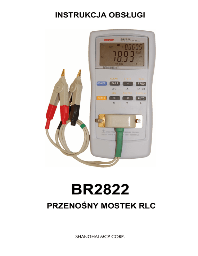 INSTRUKCJA OBSŁUGI BR2822 PRZENOŚNY MOSTEK RLC SHANGHAI MCP CORP. Spis treści Strona 1. ZASADY UŻYTKOWANIA .................................................................................................3 2. CHARAKTERYSTYKA MIERNIKA ....................................................................................4 2.1. Wstęp .........................................................................................................................4 2.2. Funkcje pomiarowe i pomocnicze...............................................................................4 2.3. Dane techniczne.........................................................................................................5 2.4. Środowisko pracy i przechowywania ..........................................................................6 3. Elementy obsługi miernika .................................................................................................7 3.1. Wyświetlacz LCD........................................................................................................7 3.2. Klawiatura...................................................................................................................8 4. Obsługa .............................................................................................................................9 4.1. Uruchomienie .............................................................................................................9 4.2. Obsługa miernika......................................................................................................10 4.2.1. Obsługa podstawowych funkcji miernika .........................................................10 4.2.2. Obsługa rozszerzonych funkcji miernika .........................................................11 4.3. Ładowanie akumulatorka..........................................................................................19 4.4. Konserwacja .............................................................................................................19 5. OCHRONA ŚRODOWISKA.............................................................................................20 -2- 1. ZASADY UŻYTKOWANIA • Miernik jest przeznaczony do użytku wewnątrz pomieszczeń • Podczas podłączania zasilacza lub wymiany akumulatorka miernik powinien być wyłączony. • Pomimo zastosowanych zabezpieczeń obwodów wewnętrznych miernika napięcie lub prąd stały może spowodować zniszczenie miernika. Przed pomiarem pojemności należy upewnić się, czy mierzony kondensator nie jest naładowany. • Do zasilania miernika używany jest akumulatorek żelazowo-niklowy 9V. Miernik nie będzie właściwie pracował, gdy napięcie akumulatorka spadnie poniżej 6V. • Wykonywanie pomiarów podczas ładowania akumulatorka może wpływać na wyniki pomiarów. • Zaleca się zasilanie miernika zasilaczem prądu stałego 12V. • Należy dokonywać okresowej korekcji obciążenia dla zwartego i rozwartego obwodu - w szczególności po naprawie miernika. • Funkcje zabezpieczone hasłem nie są dostępne dla użytkownika. -3- 2. CHARAKTERYSTYKA MIERNIKA Podczas pomiarów należy postępować zgodnie z instrukcją obsługi, aby pomiar został wykonany prawidłowo. 2.1. Wstęp Sterowany mikroprocesorowo miernik BR2822 charakteryzuje się małym poborem prądu i jest w stanie wykonać następujące pomiary: • Indukcyjność L • Pojemność C • Rezystancja R • Impedancja |Z| • Stratność D • Dobroć Q Miernik jest w stanie zaspokoić potrzeby szerokiego grona odbiorców, zarówno w dziedzinie produkcji jak i utrzymania. 2.2. Funkcje pomiarowe i pomocnicze 1. Dwa jednoczesne pomiary na dwóch osobnych wyświetlaczach: L-Q, C-D, R-Q i Z-Q 2. Korekcja obciążenia: OPEN: automatyczna korekcja obciążenia dla obwodu rozwartego SHORT: automatyczna korekcja obciążenia dla obwodu zwartego 3. Wyświetlanie wyników pomiarów: rzeczywiste - wyświetlanie aktualnej wartości pomiaru ∆ – wyświetlanie wartości względnej ∆% - wyświetlanie wartości względnej wyrażonej procentowo 4. Automatyczny/ręczny wybór zakresów pomiarowych: Ręczny wybór zakresu pomiarowego zwiększa efektywność przy pomiarach wielu elementów elektronicznych o tej samej wartości nominalnej. 5. Funkcja komparatora: Możliwość wyznaczenia czterech przedziałów procentowych względem wartości odniesienia i sygnalizacja obecności aktualnego wyniku pomiaru w danym przedziale: NG, P1, P2 i P3 6. Układ zastępczy: Możliwość wyboru układu zastępczego równoległego lub szeregowego. 7. Zatrzymanie wyniku pomiaru: Funkcja umożliwiająca zatrzymanie aktualnego wyniku pomiaru na wyświetlaczu. 8. Sygnalizacja przekroczenia Funkcja sygnalizacji przekroczenia górnego lub dolnego limitu pomiaru NG, P1, P2 i P3. -4- 2.3. Dane techniczne Rodzaj pomiaru Częstotliwość Dokładność Wyświetlacz Zakresy pomiarowe Napięcie pomiarowe (dla autozakresów i obwodów rozwartych) Wybór zakresu pom. Układy zastępcze Wyświetlanie wyników pomiarów Korekcja obciążenia Próbkowanie Liczba styków wejściowych Komparator Zakresy sygnalizacji przekroczenia limitów L-Q, C-D, R-Q, Z-Q 100Hz, 120Hz, 1kHz, 10kHz Podstawowa 0,3% Główny 5 cyfr + dodatkowy 5 cyfr 100Hz, 120Hz 1µH ÷ 9999H L 1kHz, 10kHz 0,1µH ÷ 999,9H 100Hz, 120Hz 1pF ÷ 9999µF C 1kHz, 10kHz 0,1pF ÷ 999,9µF R, |Z| 0,0001Ω ÷ 999,9MΩ D, Q 0,0001 ÷ 9999 ∆% 0,0001% ÷ 9999% 10kHz 0,1 Vrms (1±15%) 120Hz 0,3 Vrms (1±15%) 1kHz 100Hz 0,42 Vrms (1±15%) Automatyczny lub ręczny Szeregowy lub równoległy Wartość rzeczywista, względna lub względna wyrażona procentowo Dla obwodów zwartych lub rozwartych 3 razy/s. 5 styków Czterozakresowy: NG, P1, P2, P3 ∆% -9999% ÷ 99999% L 0,0001µH ÷ 99999H C 0,0001pF ÷ 99999µF R 0,0001Ω ÷ 99999MΩ Z 0,0001Ω ÷ 99999MΩ Tryby sygnalizacji przekroczenia limitów Zasilanie NG, P1, P2, P3 i OFF akumulatorek żelazowo-niklowy 9V lub zasilacz