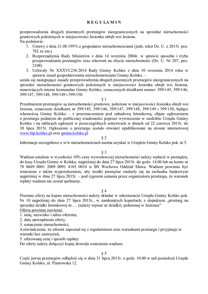 R E G U LA M I N przeprowadzenia drugich pisemnych przetargów nieograniczonych na sprzedaż nieruchomości gruntowych położonych w miejscowości Jesionka obręb wsi Jesiona. Na podstawie: 1. Ustawy z dnia 21.08.1997r.o gospodarce nieruchomościami (jedn. tekst Dz. U. z 2015r. poz. 782 ze zm.) 2. Rozporządzenia Rady Ministrów z dnia 14 września 2004r. w sprawie sposobu i trybu przeprowadzania przetargów oraz rokowań na zbycie nieruchomości (Dz. U. Nr 207, poz. 2108) 3. Uchwały Nr XXXVI.236.2014 Rady Gminy Kolsko z dnia 10 września 2014 roku w sprawie zasad gospodarowania nieruchomościami Gminy Kolsko. – ustala się następujące zasady przeprowadzenia drugich pisemnych przetargów nieograniczonych na sprzedaż nieruchomości gruntowych położonych w miejscowości Jesionka obręb wsi Jesiona, stanowiących mienie komunalne Gminy Kolsko, oznaczonych działkami numer: 399/145, 399/146, 399/147, 399/148, 399/149 i 399/150. §1 Przedmiotem przetargów są nieruchomości gruntowe, położone w miejscowości Jesionka obręb wsi Jesiona, oznaczone działkami nr 399/145, 399/146, 399/147, 399/148, 399/149 i 399/150, będące własnością Gminy Kolsko – z przeznaczeniem pod zabudowę letniskową, objęte ogłoszeniem o przetargu podanym do publicznej wiadomości poprzez wywieszenie w siedzibie Urzędu Gminy Kolsko i na tablicach ogłoszeń w poszczególnych sołectwach w dniach od 22 czerwca 2015r. do 30 lipca 2015r. Ogłoszenie o przetargu zostało również opublikowane na stronie internetowej www.bip.kolsko.pl oraz gmina.kolsko.pl §2 Informacje szczegółowe o w/w nieruchomościach można uzyskać w Urzędzie Gminy Kolsko pok. nr 5. §3 Wadium ustalone w wysokości 10% ceny wywoławczej nieruchomości należy wpłacić w pieniądzu, do kasy Urzędu Gminy w Kolsku, najpóźniej do dnia 27 lipca 2015r. do godz. 14.00 lub na konto nr 78 8669 0001 2009 0091 4105 0010 w BS Wschowa Oddział Sława. Wadium powinno być wniesione z takim wyprzedzeniem, aby środki pieniężne znalazły się na rachunku bankowym najpóźniej w dniu 27 lipca 2015r. – pod rygorem uznania przez organizatora przetargu, że warunek wpłaty wadium nie został spełniony. §4 Pisemne oferty na kupno nieruchomości należy składać w sekretariacie Urzędu Gminy Kolsko pok. Nr 10 najpóźniej do dnia 27 lipca 2015r., w zamkniętych kopertach, z dopiskiem „przetarg na sprzedaż działki letniskowej nr … (należy wpisać nr działki), położonej w Jesionce” Oferta powinna zawierać: 1. imię, nazwisko i adres oferenta, 2. datę sporządzenia oferty, 3. oznaczenie nieruchomości, 4.oświadczenie, że oferent zapoznał się z regulaminem oraz warunkami przetargu i przyjmuje te warunki bez zastrzeżeń, 5. oferowaną cenę i sposób zapłaty. Do oferty należy dołączyć kopię dowodu wniesienia wadium. §5 Część jawna przetargów odbędzie się w dniu 31 lipca 2015r. o godz. 10.00 w sali posiedzeń Urzędu Gminy Kolsko, ul. Piastowska 12. §6 1. Za prawidłowe przeprowadzenie przetargów odpowiedzialna jest Komisja Przetargowa w składzie: Pan Łukaszewski Zdzisław - Przewodniczący Pani Sieradza Anna - Członek Pan Radoła Ilona - Członek Pani Leszko Edyta - Członek Pani Bosy Marta - Członek 2. Przetargi mogą się odbyć jedynie w przypadku, gdy w ich prowadzeniu uczestniczy, co najmniej 3 osobowa komisja. 3. Decyzje Komisji zapadają bezwzględną większością głosów, a w przypadku równej ilości głosów decyduje głos Przewodniczącego. 4. Komisja Przetargowa odmawia zakwalifikowania ofert do części niejawnej przetargu, jeżeli nie spełniają warunków formalnych, zostały złożone po wyznaczonym terminie, do oferty nie dołączono kopii dowodu wpłaty wadium, są nieczytelne lub budzą wątpliwości, co do ich treści. 5. W przypadku złożenia ofert równorzędnych, Komisja Przetargowa organizuje dodatkowy przetarg ustny ograniczony do oferentów, którzy złożyli te oferty. §7 1. Przetarg jest ważny, chociaż wpłynie tylko jedna oferta spełniająca warunki określone w ogłoszeniu o przetargu oraz w regulaminie przetargu. 2. Cena zaoferowana musi być wyższa od ceny wywoławczej, o co najmniej 1% z zaokrągleniem w górę do pełnych dziesiątek złotych. 3. Do ceny uzyskanej w przetargu doliczony zostanie podatek VAT w wysokości 23%. §8 Z przeprowadzonych przetargów sporządza się protokoły w 4 jednobrzmiących egzemplarzach, z których po 1 otrzymuje osoba ustalono jako nabywca nieruchomości oraz notariusz, a 2 są przeznaczone dla właściwego organu. Protokoły podpisuje przewodniczący i członkowie komisji oraz osoba ustalona jako nabywca nieruchomości. §9 O wynikach przetargów przewodniczący komisji przetargowej zawiadamia wszystkich, którzy złożyli oferty, w terminie nie dłuższym niż 3 dni od dnia zamknięcia przetargu. § 10 Zapłata należności za nabytą nieruchomość winna być uregulowana nie później niż do dnia zawarcia umowy notarialnej. O terminie sporządzenia umowy notarialnej, sprzedający zawiadomi kupującego najpóźniej w ciągu 21 dni od dnia przetargu. Nie stawienie się bez usprawiedliwienia w podanym miejscu i terminie może spowodować odstąpienie organizatora przetargu od zawarcia umowy, a wpłacone wadium nie podlega zwrotowi. § 11 1. Uczestnicy przetargów mogą złożyć skargę na czynności związane z przeprowadzeniem przetargów za pośrednictwem właściwego organu. 2. Organ wykonawczy rozpatruje skargę w terminie 7 dni od daty jej otrzymania i może: uznać skargę za zasadną i nakazać powtórzenie czynności przetargowych lub unieważnić przetargi albo uznać skargę za niezasadną. Kolsko, dnia 18 czerwca 2015r.