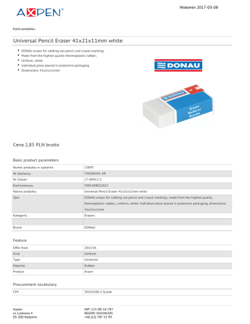 Wołomin 2017-03-08 Karta produktu: Universal Pencil Eraser 41x21x11mm white DONAU eraser for rubbing out pencil and crayon marking; Made from the highest quality thermoplastic rubber; Uniform, white Individual piece placed in protective packaging Dimensions: 41x21x11mm Cena 2,85 PLN brutto Basic product parameters Numer produktu w systemie 13893 Nr dostawcy 7305001PL-09 Nr Celcen 17-00413-2 Kod kreskowy 5901498022022 Nazwa produktu Universal Pencil Eraser 41x21x11mm white Opis DONAU eraser for rubbing out pencil and crayon marking;; made from the highest quality thermoplastic rubber;; uniform, white; individual piece placed in protective packaging; dimensions: 41x21x11mm Kategoria Erasers Brand DONAU Feature Offer from 2013-01 Kind Uniform Type Universal Material Rubber Product Eraser Procurement vocabulary CPV 30192100-2 Gumki Axpen ul. Laskowa 4 05-200 Wołomin NIP: 125-00-16-787 REGON: 010346305 +48 (22) 787 55 99 Wołomin 2017-03-08 Karta katalogowa produktu cd. Universal Pencil Eraser 41x21x11mm white Certifications New product Standard Hit Standard Colour Colour White Dimensions Dimensions (mm) 41x21x11 Serdecznie zapraszamy do współpracy Axpen zespół. Axpen ul. Laskowa 4 05-200 Wołomin NIP: 125-00-16-787 REGON: 010346305 +48 (22) 787 55 99
