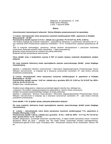 Załącznik do Zarządzenia nr 1/08 Wójta Gminy Niebylec z dnia 7 stycznia 2008r Wykaz nieruchomości stanowiących własność Gminy Niebylec przeznaczonych do sprzedaŜy: 1/ Lutcza- nieruchomość rolna oznaczona numerem ewidencyjnym 4429 , ujawniona w Księdze Wieczystej Nr 49 587 Powierzchnia działki wynosi 0,13 ha i składa się z gruntów: Ps IV-0,07 ha; B-Ps- 0,06 ha. 2 Na działce znajduje się budynek mieszkalno - gospodarczy drewniany o powierzchni zabudowy 95 m w 2 2 tym weranda 20m .Powierzchnia uŜytkowa mieszkalna –19 m ; Powierzchnia uŜytkowa gospodarcza 38 m2. Jest to budynek wolnostojący, parterowy, nakryty dachem dwuspadowym z pokryciem dachówką cementową. Budynek posiada cześć mieszkalną i część gospodarczą. Budynek zuŜyty technicznie do rozbiórki lub pełnej odbudowy. Budynek ten jest zamieszkany bezumownie. Cena działki wraz z budynkiem wynosi 8 827 zł (osiem tysięcy osiemset dwadzieścia siedem złotych). Do ceny zostanie doliczony koszt sporządzenia operatu szacunkowego działki rzeczoznawcę. przez biegłego Zgodnie z ustaleniami Studium Uwarunkowań i Kierunków Zagospodarowania Przestrzennego Gminy Niebylec nieruchomość ta znajduje się w obszarze oznaczonym symbolem „R”- jako tereny rolniczej przestrzeni produkcyjnej. 2/ Lutcza- nieruchomość rolna oznaczona numerem ewidencyjnym 5, ujawniona w Księdze Wieczystej nr 45 333. Powierzchnia działki wynosi 0,42 ha i składa się z gruntów S/Ps IV- 0,29 ha; Ps IV-0,07 ha; B/Ps0,05 ha; Dr-Ps IV 0,01 ha. Działka rolna- niezabudowana. Działka ta jest odłogowania, miejscowo porośnięta kępami wierzby Iwy, dzikiego bzu i ostręŜyny. Na działce występują pojedyncze egzemplarze starych drzew owocowych. Działka nie posiada bezpośredniego dostępu do drogi publicznej. Zgodnie z ustaleniami Studium Uwarunkowań i Kierunków Zagospodarowania Przestrzennego Gminy Niebylec nieruchomość ta znajduje się w obszarze oznaczonym symbolem „R” – jako tereny rolniczej przestrzeni produkcyjnej. Cena działki 1 411 zł (jeden tysiąc czterysta jedenaście złotych) Do ceny zostanie doliczony koszt sporządzenia operatu szacunkowego działki przez biegłego rzeczoznawcę. 3/ Lutcza – nieruchomość rolno leśna oznaczona numerem ewidencyjnym 713, ujawniona w Księdze Wieczystej 6 270. Powierzchnia działki 1,56 ha i składa się z gruntów: R IVa – 0,96 ha; B/Ps – 0,11 ha; Ps V-0,16 ha; lasy i grunty leśne- Ls IV - 0,33 ha. Działka odłogowania porośnięta koŜuchem zeschłej trawy, w części działki samosiewy drzew i krzewów liściastych takich jak grab i wierzba Iwa. Na części leśnej- drzewostan liściasty róŜnogatunkowy. Podstawowe gatunki to buk i grab. Przeciętny wiek – drzewostan młodszy 30 lat, drzewostan starszy 100 lat. Działka bez dostępu ewidencyjnego do drogi publicznej. Cena działki 24 571 zł (dwadzieścia cztery tysiące pięćset siedemdziesiąt jeden złotych) w tym wartość drzewostanu 3 674 zł. Do ceny zostanie doliczony koszt sporządzenia operatu szacunkowego działki przez biegłego rzeczoznawcę. Zgodnie z ustaleniami Studium Uwarunkowań i Kierunków Zagospodarowania Przestrzennego Gminy Niebylec nieruchomość ta leŜy w terenach rolnych, oznaczonych na planie symbolem D 03 R. 4/ Baryczka – działka oznaczona numerem ewidencyjnym 1338,ujawniona w Księdze Wieczystej 38 884. Powierzchnia działki wynosi 1,15 ha i składa się z gruntów: R III b 0,21 ha; R-IV a- 0,38 ha; R VI – 0,04 ha; B/Ps III –0,20 ha; Ps IV- 0,31 ha; Ls IV- 0,01 ha. Działka połoŜona jest w pasie gruntów ciągnących się wzdłuŜ drogi krajowej nr 9, po jej zachodniej stronie. Wjazd na teren działki bezpośrednio z drogi krajowej. Na odcinku około 60 m działka bezpośrednio przylega do drogi krajowej. Uzbrojenie terenu: w pobliŜu drogi krajowej przebiega sieć gazowa, napowietrzna sieć telefoniczna oraz napowietrzna sieć energetyczna- słup energetyczny na działce. Na działce znajduje się budynek mieszkalny konstrukcji murowano- drewnianej, kryty dachówką, o wymiarach 10,20 x 5,8 m. Budynek znajduje się w bardzo złym stanie technicznym. Na działce znajduje się równieŜ stodoła, której konstrukcję budynku stanowią murowane filary, dach budynku jest dwuspadowy, kryty dachówką cementową, ściany budynku wypełnione deskami. Wymiary budynku 6,50 x 6,50 m. Budynek o duŜym zuŜyciu technicznym. Zgodnie z ustaleniami Studium Uwarunkowań i Kierunków Zagospodarowania Przestrzennego Gminy Niebylec nieruchomość ta leŜy w terenach oznaczonych symbolem „M” – tereny zabudowy mieszkalnej. Cena działki wraz z budynkami wynosi 64 725 zł (sześćdziesiąt cztery tysiące siedemset dwadzieścia pięć złotych) Do ceny zostanie doliczony koszt sporządzenia operatu szacunkowego działki przez biegłego rzeczoznawcę. Informuje się, Ŝe zgodnie z art. 34 ust. 1 pkt. 1 i 2 Ustawy o gospodarce nieruchomościami z dnia 21 sierpnia 1997r (Dz.U. z 2004r Nr 261 poz. 2603 z późniejszymi zmianami) pierwszeństwo w nabyciu nieruchomości po cenie podanej w wykazie przysługuje osobie, której przysługuje roszczenie o nabycie nieruchomości z mocy niniejszej ustawy bądź teŜ jest poprzednim właścicielem zbywanej nieruchomości pozbawionej prawa własności tej nieruchomości przed dniem 5 grudnia 1990r albo jego spadkobiercą, jeŜeli złoŜy wniosek o nabycie przed upływem terminu określonego w wykazie tj. 6 tygodni licząc od dnia wywieszenia wykazu. Termin i warunki przetargu określone zostaną w odrębnym terminie. Szczegółowe informacje o nieruchomościach moŜna uzyskać w Urzędzie Gminy w Niebylcu –pok. nr. 16 (tel. 277-39-93).