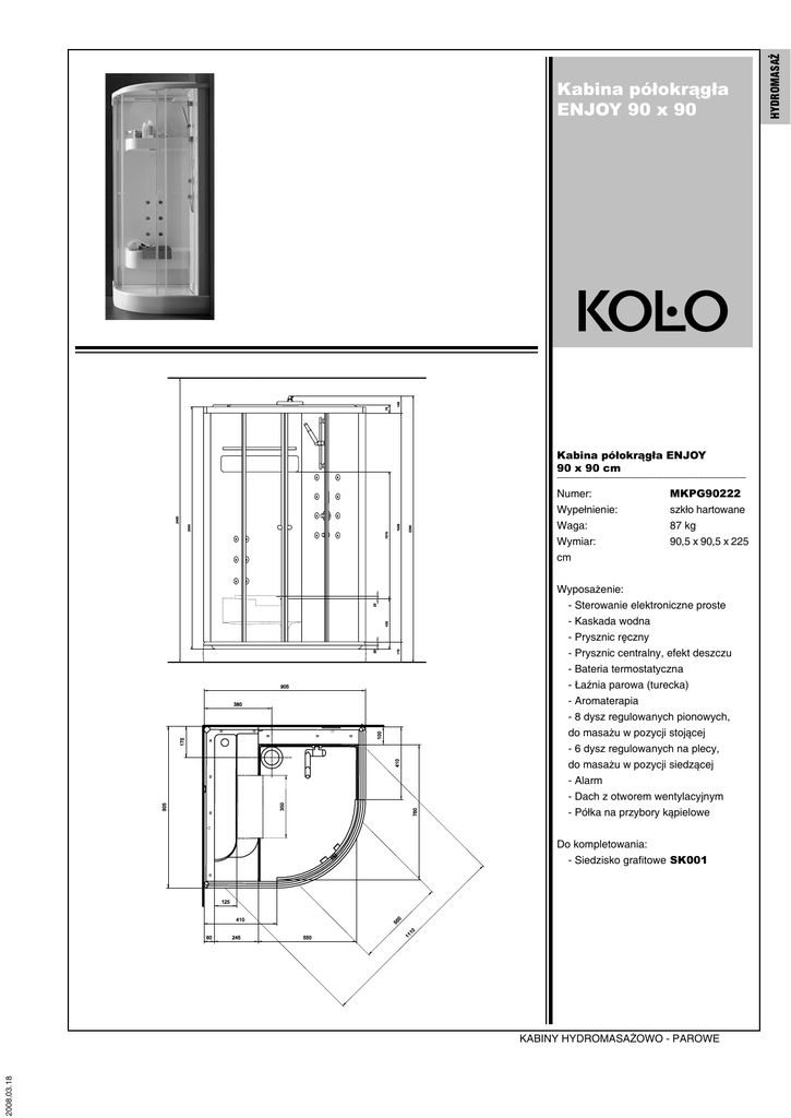 Kabina półokrągła ENJOY 90 x 90 cm ________________________________ Numer: Wypełnienie: Waga: Wymiar: cm MKPG90222 szkło hartowane 87 kg 90,5 x 90,5 x 225 Wyposażenie: - Sterowanie elektroniczne proste - Kaskada wodna - Prysznic ręczny - Prysznic centralny, efekt deszczu - Bateria termostatyczna - Łaźnia parowa (turecka) - Aromaterapia - 8 dysz regulowanych pionowych, do masażu w pozycji stojącej - 6 dysz regulowanych na plecy, do masażu w pozycji siedzącej - Alarm - Dach z otworem wentylacyjnym - Półka na przybory kąpielowe Do kompletowania: - Siedzisko grafitowe SK001 2008.03.18 KABINY HYDROMASAŻOWO - PAROWE HYDROMASA Kabina półokrągła ENJOY 90 x 90