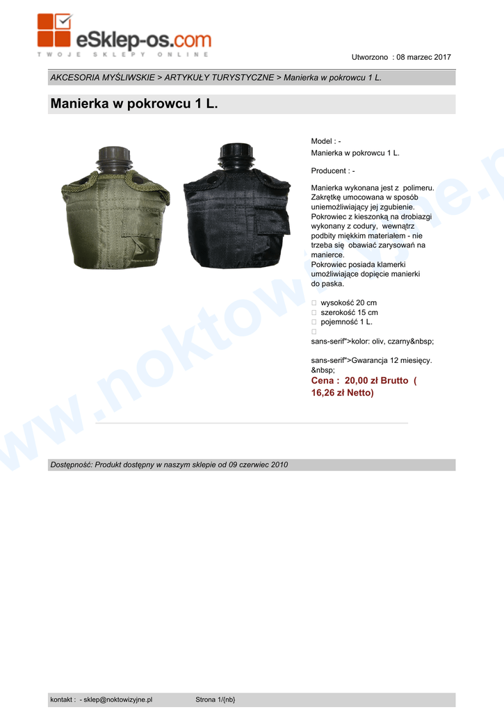 w Utworzono : 08 marzec 2017 AKCESORIA MYŚLIWSKIE > ARTYKUŁY TURYSTYCZNE > Manierka w pokrowcu 1 L. Manierka w pokrowcu 1 L. p . e Model : Manierka w pokrowcu 1 L. Producent : - n j y iz Manierka wykonana jest z polimeru. Zakrętkę umocowana w sposób uniemożliwiający jej zgubienie. Pokrowiec z kieszonką na drobiazgi wykonany z codury, wewnątrz podbity miękkim materiałem - nie trzeba się obawiać zarysowań na manierce. Pokrowiec posiada klamerki umożliwiające dopięcie manierki do paska. w o t k o .n � wysokość 20 cm � szerokość 15 cm � pojemność 1 L. � sans-serif">kolor: oliv, czarny sans-serif">Gwarancja 12 miesięcy. Cena : 20,00 zł Brutto ( 16,26 zł Netto) w w Dostępność: Produkt dostępny w naszym sklepie od 09 czerwiec 2010 kontakt : - [email protected] Strona 1/{nb}
