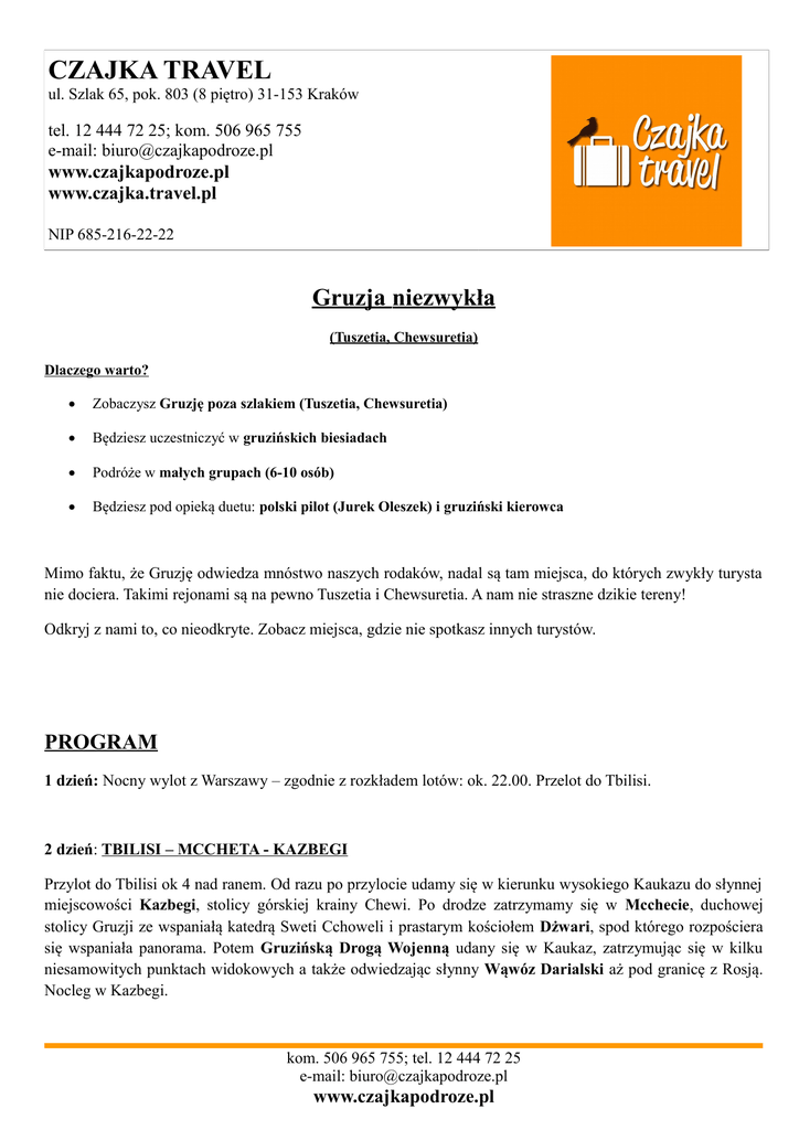 CZAJKA TRAVEL ul. Szlak 65, pok. 803 (8 piętro) 31-153 Kraków tel. 12 444 72 25; kom. 506 965 755 e-mail: [email protected] www.czajkapodroze.pl www.czajka.travel.pl NIP 685-216-22-22 Gruzja niezwykła (Tuszetia, Chewsuretia) Dlaczego warto? Zobaczysz Gruzję poza szlakiem (Tuszetia, Chewsuretia) Będziesz uczestniczyć w gruzińskich biesiadach Podróże w małych grupach (6-10 osób) Będziesz pod opieką duetu: polski pilot (Jurek Oleszek) i gruziński kierowca Mimo faktu, że Gruzję odwiedza mnóstwo naszych rodaków, nadal są tam miejsca, do których zwykły turysta nie dociera. Takimi rejonami są na pewno Tuszetia i Chewsuretia. A nam nie straszne dzikie tereny! Odkryj z nami to, co nieodkryte. Zobacz miejsca, gdzie nie spotkasz innych turystów. PROGRAM 1 dzień: Nocny wylot z Warszawy – zgodnie z rozkładem lotów: ok. 22.00. Przelot do Tbilisi. 2 dzień: TBILISI – MCCHETA - KAZBEGI Przylot do Tbilisi ok 4 nad ranem. Od razu po przylocie udamy się w kierunku wysokiego Kaukazu do słynnej miejscowości Kazbegi, stolicy górskiej krainy Chewi. Po drodze zatrzymamy się w Mcchecie, duchowej stolicy Gruzji ze wspaniałą katedrą Sweti Cchoweli i prastarym kościołem Dżwari, spod którego rozpościera się wspaniała panorama. Potem Gruzińską Drogą Wojenną udany się w Kaukaz, zatrzymując się w kilku niesamowitych punktach widokowych a także odwiedzając słynny Wąwóz Darialski aż pod granicę z Rosją. Nocleg w Kazbegi. kom. 506 965 755; tel. 12 444 72 25 e-mail: [email protected] www.czajkapodroze.pl 3 dzień: KAZBEGI Wyjazd pod górujący nad Kazbegi kościółek Cminda Sameba, skąd zobaczymy wspaniałą panoramą. Następnie wycieczka na położoną prawie 3000 m n.p.m. przełęcz pod majestatycznym Kazbekiem. Nocleg w Kazbegi. 4 dzień: DŻUTA – GUDANI (Chewsuretia) Poranny wyjazd do położonej w głębi gór Dżuty, krótka wycieczka, a następnie długi przejazd do jeszcze głębiej w górach położonej Chewsuretii. Nocleg w Gudani. 5 dzień: SZATILI - MUCO Wycieczka do położonej już po północnej stronie gór górnej Chewsuretii, krainy bezgranicznie pięknej. Odwiedzimy jej stolicę wioskę-twierdzę Szatili, niesamowity cmentarz tuż pod czeczeńską granicą oraz fantastyczne ruiny wioski-twierdzy Muco. Nocleg w Gudani. 6 dzień: GUDANI i okolice Wycieczka w okolicach Gudani: do położonych w głębi doliny odległych wiosek albo na jeden z okolicznych grzbietów. Nocleg w Gudani. 7 dzień: TUSZETIA Długi przejazd z Chewsuretii do najbardziej chyba odległej gruzińskiej krainy Tuszetii. Droga do Tuszetii to zapierający dech w piersiach niesamowity, przepiękny, karkołomny trakt. 8 i 9 dzień: TUSZETIA: OMALO, DIKLO, DARTLO, CZESZO. Tuszetia, odległa kraina wysokich, zielonych gór gdzie latem żyje tylko około 2 tyś ludzi a na zimę zostaje tylko kilkudziesięciu najtwardszych. Dwa dni będziemy chodzili po pełnych obronnych wież tutejszych malutkich wioskach jak Omalo, Diklo, Dartlo czy Czeszo. Noclegi w Omalo. 10 dzień: KACHETIA: KWARELI – GREMI - LAGODECHI Zjazd z gór do cywilizacji, przejazd przez Kachetię, krainę skąd wszystko jest najlepsze. A najlepsze z najlepszych jest kachetyńskie wino! Spróbujemy go w okolicach Kwareli. Poza tym zwiedzimy malowniczy kościółek w Gremi. Nocleg w Lagodechi. kom. 506 965 755; tel. 12 444 72 25 e-mail: [email protected] www.czajkapodroze.pl 11 dzień: LAGODECHI Piesza wycieczka lesistą doliną do wodospadu będzie naszym pożegnaniem z Kaukazem. Nocleg w Lagodechi. 12 dzień: SIGHNAGHI - BODBE Niedługi przejazd do Sighnaghi, uroczego miasteczka w okolicy przypominającej Toskanię. Po drodze odwiedzimy źródło świętej Nino gdzie w lodowatej wodzie będziemy mogli zmyć z siebie grzechy oraz klasztor Bodbe, gdzie ta najukochańsza z gruzińskich świętych jest pochowana. Nocleg w Sighnaghi. 13 dzień: PARK WASZLOWANI Wycieczka do położonego przy azerskiej granicy parku narodowego Waszlowani. Stepowe pagórki, zachwycające dalekie widoki i zupełne pustkowia. Nocleg w Sighnaghi. 14 dzień: DAWID GAREDŻA - TBILISI Po drodze do Tbilisi wstąpimy do Dawid Garedża, niesamowitych klasztorów i pustelni położonych na granicy z Azerbejdżanem, wśród fantastycznych półpustynnych krajobrazów. Nie zabraknie także polskiej knajpy położonej na pustkowiu. Wieczór i nocleg w Tbilisi. 15 dzień: TBILISI – BOLNISI - DMANISI Wycieczka do Bolnisi z najstarszym w Gruzji kościołem z V wieku i do Dmanisi, gruzińskiego Maczu Pikczu, w którym znajdował się być może biblijny Eden, czyli nasza wspólna prakolebka. Wieczór w Tbilisi, możliwość zmycia trudów wycieczki w słynnych tbiliskich łaźniach siarkowych. Późną nocą wyjazd na lotnisko. 16 dzień: POŻEGNANIE Odlot do Warszawy nad ranem. Kolejność zwiedzania może ulec zmianie. Uwaga! Organizator nie ponosi odpowiedzialności za pogodę! W przypadku deszczu czy mgły niektóre wycieczki mogą się nie odbyć. Również na skutek działania sił wyższych niektóre drogi mogą być nieprzejezdne. W takich przypadkach odwiedzimy inne miejsca. kom. 506 965 755; tel. 12 444 72 25 e-mail: [email protected] www.czajkapodroze.pl CENA OBEJMUJE: Bilet lotniczy na trasie Warszawa-Tbilisi-Warszawa (do kwoty 1400 PLN) 13 noclegów zgodnie z programem 13 śniadań Opiekę polskiego pilota i gruzińskiego kierowcy Transport zgodnie z programem (bus terenowy) Ubezpieczenie KL, NNW, bagażu CENA NIE OBEJMUE: Wydatków na pamiątki Obiadokolacji (ok. 10-15USD dziennie) TERMINY/CENY TERMIN CENA (6-8 osób) CENA (9-10 osób) 03.09-18.09.2016 2570PLN + 1050USD 2570PLN + 870USD 2370PLN + 1050USD 2370PLN + 870USD Jeśli w tabeli nie widzisz terminu, w którym chcesz pojechać – skontaktuj się z nami. Dopasujemy się do Ciebie w miarę naszych możliwości. Cena promocyjna przy zapisie i wpłacie zaliczki do 15.05.2016 UWAGA: Część w PLN: zaliczka (500 PLN) płatna w momencie zapisu; II rata (1500 PLN) płatna na ok. 90 dni pr