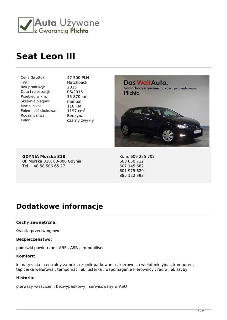 Seat Leon III Cena (brutto) Typ: Rok produkcji: Data I rejestracji: Przebieg w km: Skrzynia biegów: Moc silnika: Pojemność skokowa: Rodzaj paliwa: Kolor: 47 500 PLN Hatchback 2015 05/2015 35 870 km manual 110 KM 1197 cm3 Benzyna czarny zwykły GDYNIA Morska 318 Ul. Morska 318, 80-006 Gdynia Tel. +48 58 506 65 27 Kom. 609 225 702 603 650 712 607 145 682 601 975 629 885 122 393 Dodatkowe informacje Cechy zewnętrzne: światła przeciwmgłowe Bezpieczeństwo: poduszki powietrzne , ABS , ASR , immobiliser Komfort: klimatyzacja , centralny zamek , czujnik parkowania , kierownica wielofunkcyjna , komputer , tapicerka welurowa , tempomat , el. lusterka , wspomaganie kierownicy , radio , el. szyby Historia: pierwszy właściciel , bezwypadkowy , serwisowany w ASO 1/2 Gwarancja: Gwarancja Fabryczna Gwarancja Szanowni Państwo, Pragniemy Państwa poinformować, iż firma Plichta – Autoryzowany Dealer Škoda Auto prowadzi skup oraz sprzedaż samochodów używanych wszystkich marek, oferując także samochody używane z gwarancją objęte programem „Auta używane z Gwarancją Plichta”. W ramach programu „Auta Używane z Gwarancją Plichta ” każdy Klient otrzymuje atrakcyjny pakiet zniżek pozwalający zoptymalizować koszty eksploatacji samochodu: -50% na serwis klimatyzacji -50% na ustawienie zbieżności -50% na kosmetykę auta -50% na ścieżkę diagnostyczną -25% na wymiany oleju -25% na zakup opon + 5zł na sezon za hotelowanie opon -15% na części i akcesoria Oferujemy również kompleksową obsługę w zakresie finansowania i ubezpieczenia: - kredyty już od 4,99% - leasingi i kredyty bez zaświadczeń - uproszczone procedury – decyzja już od 30 min. - atrakcyjne pakiety AC/OC/NW/ASS wiodących firm ubezpieczeniowych Możliwość pozostawienia dotychczas użytkowanego auta w rozliczeniu – BEZPŁATNA WYCENA!!! Zapraszamy wszystkich Klientów na jazdę próbną wybranym autem. Numer oferty: E950 Informacja nie stanowi oferty w rozumieniu art. 66 KC. Podane dane mają charakter wyłącznie informacyjny. 2/2 Powered by TCPDF (www.tcpdf.org)
