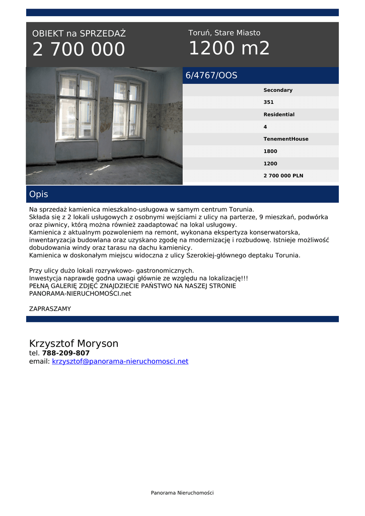OBIEKT na SPRZEDAŻ 2 700 000 Toruń, Stare Miasto 1200 m2 6/4767/OOS Secondary 351 Residential 4 TenementHouse 1800 1200 2 700 000 PLN Opis Na sprzedaż kamienica mieszkalno-usługowa w samym centrum Torunia. Składa się z 2 lokali usługowych z osobnymi wejściami z ulicy na parterze, 9 mieszkań, podwórka oraz piwnicy, którą można również zaadaptować na lokal usługowy. Kamienica z aktualnym pozwoleniem na remont, wykonana ekspertyza konserwatorska, inwentaryzacja budowlana oraz uzyskano zgodę na modernizację i rozbudowę. Istnieje możliwość dobudowania windy oraz tarasu na dachu kamienicy. Kamienica w doskonałym miejscu widoczna z ulicy Szerokiej-głównego deptaku Torunia. Przy ulicy dużo lokali rozrywkowo- gastronomicznych. Inwestycja naprawdę godna uwagi głównie ze względu na lokalizację!!! PEŁNĄ GALERIĘ ZDJĘĆ ZNAJDZIECIE PAŃSTWO NA NASZEJ STRONIE PANORAMA-NIERUCHOMOŚCI.net ZAPRASZAMY Krzysztof Moryson tel. 788-209-807 email: [email protected] Panorama Nieruchomości Powered by TCPDF (www.tcpdf.org)
