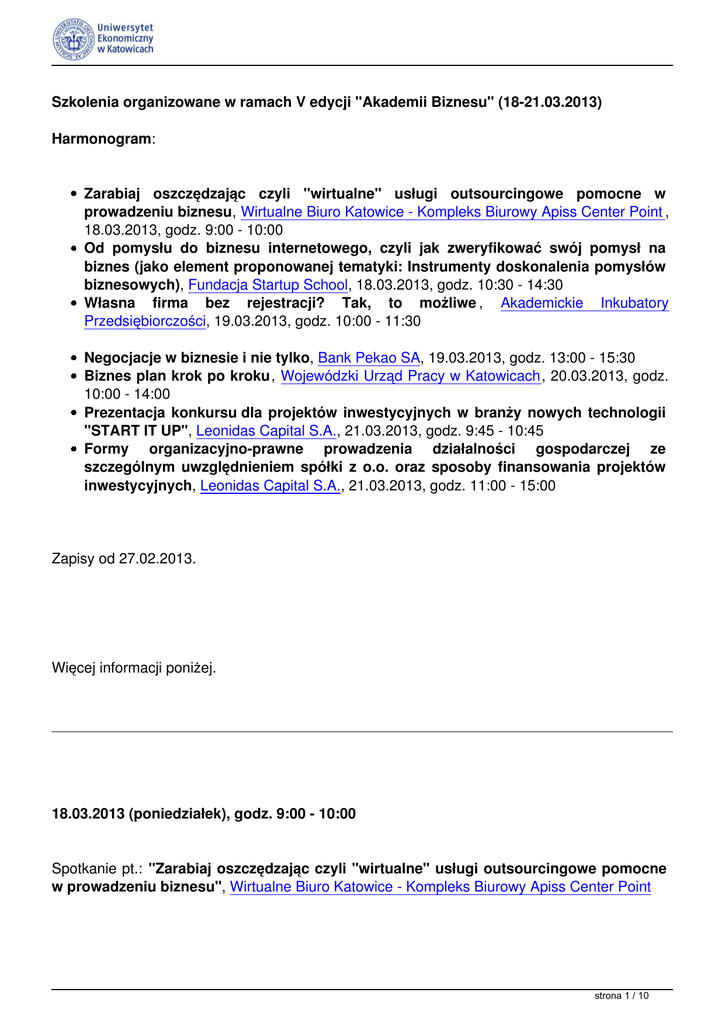 Szkolenia organizowane w ramach V edycji "Akademii Biznesu" (18-21.03.2013) Harmonogram: Zarabiaj oszczędzając czyli "wirtualne" usługi outsourcingowe pomocne w prowadzeniu biznesu, Wirtualne Biuro Katowice - Kompleks Biurowy Apiss Center Point , 18.03.2013, godz. 9:00 - 10:00 Od pomysłu do biznesu internetowego, czyli jak zweryfikować swój pomysł na biznes (jako element proponowanej tematyki: Instrumenty doskonalenia pomysłów biznesowych), Fundacja Startup School, 18.03.2013, godz. 10:30 - 14:30 Własna firma bez rejestracji? Tak, to możliwe , Akademickie Inkubatory Przedsiębiorczości, 19.03.2013, godz. 10:00 - 11:30 Negocjacje w biznesie i nie tylko, Bank Pekao SA, 19.03.2013, godz. 13:00 - 15:30 Biznes plan krok po kroku, Wojewódzki Urząd Pracy w Katowicach, 20.03.2013, godz. 10:00 - 14:00 Prezentacja konkursu dla projektów inwestycyjnych w branży nowych technologii "START IT UP", Leonidas Capital S.A., 21.03.2013, godz. 9:45 - 10:45 Formy organizacyjno-prawne prowadzenia działalności gospodarczej ze szczególnym uwzględnieniem spółki z o.o. oraz sposoby finansowania projektów inwestycyjnych, Leonidas Capital S.A., 21.03.2013, godz. 11:00 - 15:00 Zapisy od 27.02.2013. Więcej informacji poniżej. 18.03.2013 (poniedziałek), godz. 9:00 - 10:00 Spotkanie pt.: "Zarabiaj oszczędzając czyli "wirtualne" usługi outsourcingowe pomocne w prowadzeniu biznesu", Wirtualne Biuro Katowice - Kompleks Biurowy Apiss Center Point strona 1 / 10 Miejsce: Uniwersytet Ekonomiczny w Katowicach, ul. Bogucicka 3a, II piętro, Pawłowskiego (sala 314B) Aula Prowadzący spotkanie: Jacek Walaszczyk Program: co to jest Wirtualne Biuro? jak działa e-sekretariat? korzyści wynikające z outsourcingu wirtualny telefon, czyli nowoczesna forma kontaktu z klientem i sprzedaży usług. Uczestnicy szkolenia otrzymają Zaświadczenia. NA SZKOLENIE OBOWIĄZUJĄ ZAPISY. ILOŚĆ MIEJSC OGRANICZONA. ZGŁOSZENIA: Osoby zainteresowane uczestnictwem w szkoleniu proszone są o przysłanie zgłoszenia na adres e-mail: [email protected] w temacie wiadomości proszę wpisać temat szkolenia, natomiast w treści e-maila: Imię i nazwisko, Uczelnie, Wydział, Kierunek, Rok studiów, Nr albumu, E-mail, Tel. kontaktowy. strona 2 / 10 18.03.2013 (poniedziałek), godz. 10:30 - 14:30 Szkolenie pt.: Od pomysłu do biznesu internetowego, czyli jak zweryfikować swój pomysł na biznes (jako element proponowanej tematyki: Instrumenty doskonalenia pomysłów biznesowych), Fundacja Startup School Miejsce: Uniwersytet Ekonomiczny w Katowicach, ul. Bogucicka 3a, II piętro, Pawłowskiego (sala 314B) Aula Trener: Agnieszka Lewandowska-Dziewięcka, Prezes Zarządu Program: Wprowadzenie do tworzenia modelu biznesowego projektu oraz jego ewaluacji Przygotowanie modelu biznesowego i planu działania dla własnego pomysłu. Uczestnicy szkolenia otrzymają Zaświadczenia. NA SZKOLENIE OBOWIĄZUJĄ ZAPISY. ILOŚĆ MIEJSC OGRANICZONA. ZGŁOSZENIA: Osoby zainteresowane uczestnictwem w szkoleniu proszone są o przysłanie zgłoszenia na adres e-mail: [email protected] w temacie wiadomości proszę wpisać temat szkolenia, natomiast w treści e-maila: Imię i nazwisko, strona 3 / 10 Uczelnie, Wydział, Kierunek, Rok studiów, Nr albumu, E-mail, Tel. kontaktowy. Uczestnictwo w szkoleniu zostanie potwierdzone e-mailowo, w terminie do 7 dni od przysłania zgłoszenia. 19.03.2013 (wtorek), godz. 10:00 - 11:30 Szkolenie pt.: Własna firma bez rejestracji? Tak, to możliwe , Akademickie Inkubatory Przedsiębiorczości Miejsce: Uniwersytet Ekonomiczny w Katowicach, ul. Bogucicka 3a, II piętro, Pawłowskiego (sala 314B) Aula Uczestnicy szkolenia otrzymają Zaświadczenia. NA SZKOLENIE OBOWIĄZUJĄ ZAPISY. ILOŚĆ MIEJSC OGRANICZONA. ZGŁOSZENIA: Osoby zainteresowane uczestnictwem w szkoleniu proszone są o przysłanie zgłoszenia na adres e-mail: [email protected] w temacie wiadomości proszę wpisać temat szkolenia, natomiast w treści e-maila: strona 4 / 10 Imię i nazwisko, Uczelnie, Wydział, Kierunek, Rok studiów, Nr albumu, E-mail, Tel. kontaktowy. Uczestnictwo w szkoleniu zostanie potwierdzone e-mailowo, w terminie do 7 dni od przysłania zgłoszenia. 19.03.2013 (wtorek), godz. 13:00 - 15:30 Szkolenie pt.: Negocjacje w biznesie i nie tylko, Bank Pekao SA Miejsce: Uniwersytet Ekonomiczny w Katowicach, ul. Bogucicka 3a, II piętro, Pawłowskiego (sala 314B) Aula Uczestnicy szkolenia otrzymają Zaświadczenia. NA SZKOLENIE OBOWIĄZUJĄ ZAPISY. ILOŚĆ MIEJSC OGRANICZONA. ZGŁOSZENIA: Osoby zainteresowane uczestnictwem w szkoleniu proszone są o przysłanie zgłoszenia na adres e-mail: [email protected] w temacie wiadomości proszę wpisać temat szkolenia, natomiast w treści e-maila: Imię i nazwisko, strona 5 / 10 Uczelnie, Wydział, Kierunek, Rok studiów, Nr albumu, E-mail, Tel. kontaktowy. Uczestnictwo w szkoleniu zostanie potwierdzone e-mailowo, w terminie do 7 dni od przysłania zgłoszenia. 20.03.2013 (środa), godz. 10:00 - 14:00 Szkolenie pt.: Biznes plan krok po kroku, Wojewódzki Urząd Pracy w Katowicach Miejsce: Uniwersytet Ekonomiczny w Katowicach, ul. Bogucicka 3a, II piętro, sala 314B (Aula Pawłowskiego) Program: Zadania i rola biznesplan. Charakterystyka produktów i usług. Rynek i marketing ( zasięg terytorialny, charakterystyk, klientów, konkurencji, dostawców). Analiza finansowa przedsięwzięcia. Analiza SWOT. Dotacje z Powiatowego Urzędu Pracy na założenie własnej działalności gospodarczej. Uczestnicy szkolenia otrzymają Zaświadczenia. NA SZKOLENIE OBOWIĄZUJĄ ZAPISY. ILOŚĆ MIEJSC OGRANICZONA. strona 6 / 10 ZGŁOSZENIA: Osoby zainteresowane uczestnictwem w szkoleniu proszone są o przysłanie zgłoszenia na adres e-mail: [email protected] w temacie wiadomości proszę wpisać temat szkolenia, natomiast w treści e-maila: Imię i nazwisko, Uczelnie, Wydział, Kierunek, Rok studiów, Nr albumu, E-mail, Tel. kontaktowy. Uczestnictwo w szkoleniu zostanie potwierdzone e-mailowo, w terminie do 7 dni 