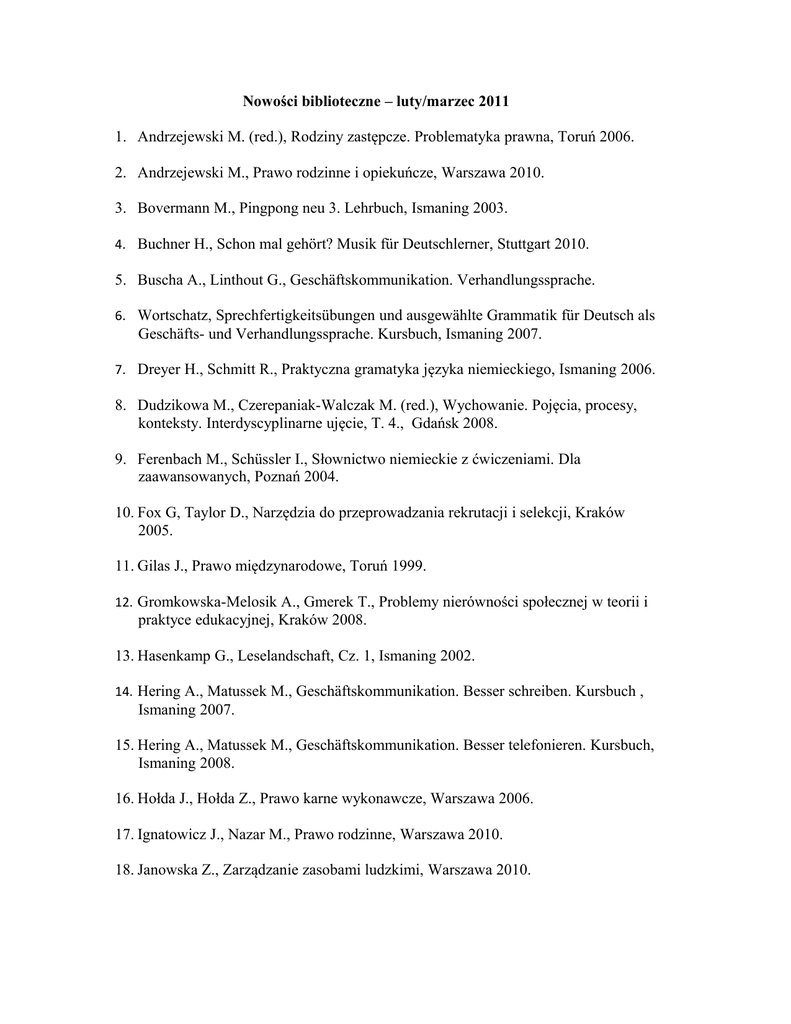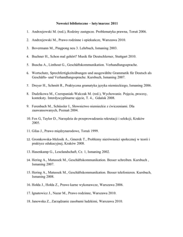 Nowości biblioteczne – luty/marzec 2011 1. Andrzejewski M. (red.), Rodziny zastępcze. Problematyka prawna, Toruń 2006. 2. Andrzejewski M., Prawo rodzinne i opiekuńcze, Warszawa 2010. 3. Bovermann M., Pingpong neu 3. Lehrbuch, Ismaning 2003. 4. Buchner H., Schon mal gehört? Musik für Deutschlerner, Stuttgart 2010. 5. Buscha A., Linthout G., Geschäftskommunikation. Verhandlungssprache. 6. Wortschatz, Sprechfertigkeitsübungen und ausgewählte Grammatik für Deutsch als Geschäfts- und Verhandlungssprache. Kursbuch, Ismaning 2007. 7. Dreyer H., Schmitt R., Praktyczna gramatyka języka niemieckiego, Ismaning 2006. 8. Dudzikowa M., Czerepaniak-Walczak M. (red.), Wychowanie. Pojęcia, procesy, konteksty. Interdyscyplinarne ujęcie, T. 4., Gdańsk 2008. 9. Ferenbach M., Schüssler I., Słownictwo niemieckie z ćwiczeniami. Dla zaawansowanych, Poznań 2004. 10. Fox G, Taylor D., Narzędzia do przeprowadzania rekrutacji i selekcji, Kraków 2005. 11. Gilas J., Prawo międzynarodowe, Toruń 1999. 12. Gromkowska-Melosik A., Gmerek T., Problemy nierówności społecznej w teorii i praktyce edukacyjnej, Kraków 2008. 13. Hasenkamp G., Leselandschaft, Cz. 1, Ismaning 2002. 14. Hering A., Matussek M., Geschäftskommunikation. Besser schreiben. Kursbuch , Ismaning 2007. 15. Hering A., Matussek M., Geschäftskommunikation. Besser telefonieren. Kursbuch, Ismaning 2008. 16. Hołda J., Hołda Z., Prawo karne wykonawcze, Warszawa 2006. 17. Ignatowicz J., Nazar M., Prawo rodzinne, Warszawa 2010. 18. Janowska Z., Zarządzanie zasobami ludzkimi, Warszawa 2010. 19. Jasiński Z. (red.), Motywowanie w przedsiębiorstwie [dokument elektroniczny]. Uwalnianie ludzkiej produktywności. Materialne, organizacyjne i psychologiczne motywatory, Warszawa 1998. (CD-ROM) 20. Jasudowicz T., Administracja wobec praw człowieka, Toruń 1996. 21. Jedynak T., Stasiak K. (red.), Zarys metodyki pracy kuratora sądowego, Warszawa 2010. 22. Jopkiewicz A., Suliga E., Biomedyczne podstawy rozwoju i wychowania, Radom 2008. 23. Kamińska-Juckiewicz M., Tomaszewska L. (red.), Demokratyczne ścieżki edukacji, Płock 2010. 24. Kaufmann S. (red.), Fortbildung für Kursleitende Deutsch als Zweitsprache, Ismaning 2008. 25. Kiziukiewicz T. (red.), Rachunkowość w jednostkach sektora finansów publicznych, Warszawa 2004. 26. Knapik W., Uzależnienia jako problem cywilizacyjny XXI wieku. Postawy młodzieży studenckiej wobec narkomanii na podstawie badań socjologicznych, Kraków 2010. 27. Kodeks karny. Kodeks postępowania karnego. Kodeks karny wykonawczy. Kodeks karny skarbowy. Kodeks wykroczeń. Kodeks postępowania w sprawach o wykroczenia. Postępowanie w sprawach nieletnich. Odpowiedzialność podmiotów zbiorowych za czyny zabronione pod groźbą kary. Opłaty w sprawach karnych, Warszawa 2011. 28. Kodeks rodzinny i opiekuńczy. Stan prawny na dzień 1 marca 2011 roku. Uwzględniono zmiany wprowadzone ustawą z dnia 10 czerwca 2010 roku o zmianie ustawy o przeciwdziałaniu przemocy w rodzinie oraz niektórych innych ustaw (Dz. U. z 2010 r., Nr 125, poz. 842) wchodzące w życie z dniem 1 sierpnia 2010 roku, Toruń 2011. Leitfaden für Sprachkursleiter, Ismaning 2009. 29. Kojkoł J., (red.), Filozofia tożsamości, Gdańsk 2007. 30. Kopińska V., Współczesna młodzież wobec problemu wolności. Studium socjologiczno-pedagogiczne, Toruń 2008. 31. Korcz-Maciejko A., Maciejko W., Świadczenia rodzinne. Komentarz, Warszawa 2009. 32. Krauz-Mozer B., Borowiec P. (red.), Samotność idei? Społeczeństwo obywatelskie we współczesnym świecie, Kraków 2007. 33. Listwan T., Antczak Z. (red)., Zarządzanie kadrami, Warszawa 2010. 34. Łuczeczko P. (red.), Przemoc i agresja w szkole. Od rozpoznania przyczyn do sposobów przeciwdziałania, Łódź 2009. 35. Malinowski J. A. (red.), Używanie środków psychoaktywnych przez uczniów w percepcji studentów - kandydatów na nauczycieli. Raport z badań, Toruń 2005. 36. Malinowski J. A., Zandecki A. (red.), Środowisko, młodzież, zdrowie. Pedagogiczne i psychologiczne wymiary zagrożeń życia i rozwoju młodzieży, Toruń 2007. 37. Marzec-Holka K. (red.), Kapitał społeczny a nierówności - kumulacja i redystrybucja Bydgoszcz 2009. 38. Mendel M. (red)., Animacja współpracy środowiskowej, Toruń 2005. 39. Mendel M. (red)., Animacja współpracy środowiskowej, Toruń 2007. 40. Mendel M., Edukacja społeczna. Partnerstwo rodziny, szkoły i gminy w perspektywie amerykańskiej, Toruń 2001. 41. Mendel M., Edukacja społeczna. Partnerstwo rodziny, szkoły i gminy w perspektywie amerykańskiej, Toruń 2002. 42. Michalak J. (red.), Przywództwo w szkole, Kraków 2007. 43. Middleman D., Sprechen - Hören – Sprechen. Übungen zur deutschen Sprachen, Ismaning 2006. (CD-ROM) 44. Middleman D., Sprechen - Hören – Sprechen. Übungen zur deutschen Aussprache, Ismaning 2008. 45. Müller-Küppers E., Zöllner I., Leseverstehen. Fachtexte mit Übungen und methodischen Hinweisen, Ismaning 2002. 46. Nogalski B., Zarządzanie organizacjami, Toruń 2002. 47. Nowicki G., Nowicki R., Zróżnicowanie morfologiczne i motoryczne, a wiek i rodzaj pracy zawodowej kobiet, Bydgoszcz 2010. 48. Nowicki G., Wskaźniki rozwoju biologicznego dzieci i młodzieży regionu kujawsko-pomorskiego, Bydgoszcz 2006. 49. Ochendowski E., Prawo administracyjne. Część ogólna, Toruń 2006. 50. Pankowska D., Wychowanie a role płciowe, Gdańsk 2005. 51. Pocztowski A., Zarządzanie zasobami ludzkimi. Strategie - procesy – metody, Warszawa 2008. 52. Przygodzińska E., Chmielewska I. (red.), Nauczyciele wobec wyzwań współczesności. Doświadczenia - badania – koncepcje, Łódź 2009. 53. Rutkowiak J., Kubinowski D., Nowak M. (red.), Edukacja, moralność, sfera publiczna. Materiały z VI Ogólnopolskiego Zjazdu Pedagogicznego PTP, Lublin 2007. 54. Sierpowska I., Ustawa o pomocy społecznej, Warszawa 2009. 55. Sojak S., Stankiewicz J. (red.), Podstawy rachunkowości, Toruń 2008. 56. Sokala A., Administracja wyborcza w ob