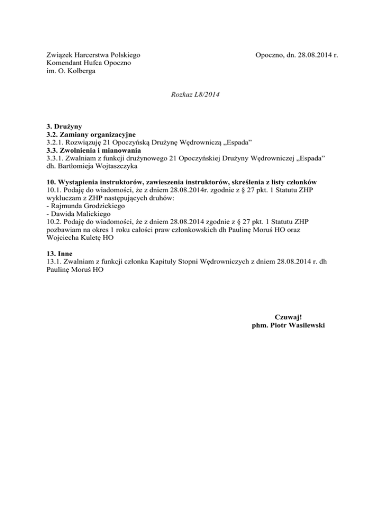 Związek Harcerstwa Polskiego Komendant Hufca Opoczno im. O. Kolberga Opoczno, dn. 28.08.2014 r. Rozkaz L8/2014 3. Drużyny 3.2. Zamiany organizacyjne 3.2.1. Rozwiązuję 21 Opoczyńską Drużynę Wędrowniczą „Espada” 3.3. Zwolnienia i mianowania 3.3.1. Zwalniam z funkcji drużynowego 21 Opoczyńskiej Drużyny Wędrowniczej „Espada” dh. Bartłomieja Wojtaszczyka 10. Wystąpienia instruktorów, zawieszenia instruktorów, skreślenia z listy członków 10.1. Podaję do wiadomości, że z dniem 28.08.2014r. zgodnie z § 27 pkt. 1 Statutu ZHP wykluczam z ZHP następujących druhów: - Rajmunda Grodzickiego - Dawida Malickiego 10.2. Podaję do wiadomości, że z dniem 28.08.2014 zgodnie z § 27 pkt. 1 Statutu ZHP pozbawiam na okres 1 roku całości praw członkowskich dh Paulinę Moruś HO oraz Wojciecha Kuletę HO 13. Inne 13.1. Zwalniam z funkcji członka Kapituły Stopni Wędrowniczych z dniem 28.08.2014 r. dh Paulinę Moruś HO Czuwaj! phm. Piotr Wasilewski