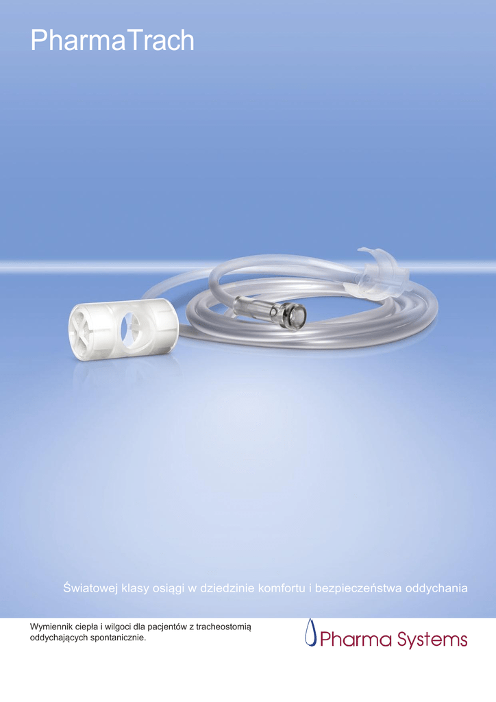 PharmaTrach Światowej klasy osiągi w dziedzinie komfortu i bezpieczeństwa oddychania Wymiennik ciepła i wilgoci dla pacjentów z tracheostomią oddychających spontanicznie. Pharma Systems Pharma Trach • Zapewnia ogrzane i wilgotne powietrze pacjentom z tracheostomią. • Różne opcje zapewniają wybór właściwego urządzenia. • Przeznaczone dla: - dla pacjentów z tracheostomią, • Należy wymieniać co najmniej co 24 godziny. w Opiece Respiratorowej, w laryngologii, • Dostępne różne opcje, - Nawilżony dopływ tlenu - Samozamykający port do odsysania - Unikalne wymienne kasety HME oszczędność kosztów i higiena. • Świetna wydajność nawilżania. • Zaprojektowane dla pacjentów dorosłych i dzieci - Lekkie, niskie opory przepływu i proste - dla pacjentów z tracheostomią w obsłudze. oddychających spontanicznie. • Początkowa konfiguracja jest prosta, szybka • Teraz dostępne z uniwersalnym złączem tlenu ! • Łatwe w użyciu, niskie koszty. • Marka od 20 lat na rynku. i bezpieczna. Modele Pharma Trach Pharma Trach Przeznaczony dla pacjentów z tracheostomią oddychających spontanicznie. Zalecany w Opiece Respiratorowej, Laryngologii Ratownictwie, Opiece Domowej. Pharma Trach jest odpowiedni zarówno dla dorosłych jak i dzieci. Specyfikacja produktu Matwa Przestrzeń (ml) 12 4 Waga (g) Opór cm H 2O 0,7 30 LPM Zwrot wilgoci At VT 500 ml (mg H 2O/l air) 26 Złącza : Strona pacjenta: 15 żeńskie (mm) Podst Kod: Op./Karton: 6240 25/500 Multi funkc. Kod: Op./Karton: 6241 25/500 Port tlen. Kod: Op./Karton: Multi funkc.+ Kod: Op./Karton: x20 6241+ 25/500 x20 HME zestaw Kod: Op./Karton: 6243 25/500 HME zestaw, port tlenu 6250 Kod: 25/250 Op./Karton: 6251 25/250 Port tlen. + Kod: Op./Karton: 6243+ 25/500 Podstawowy Multi Pak Kod: Op./Karton: 6245 25/250 Pharma Trach Uchwyt tlenu Gripper Odsysanie Kod: Op./Karton: PharmaTrachx2 HME-kas.x10 Chwytak dopływu tlenu z tubąx1Hak x1 6242 25/500 Kod: Op./Karton: 6244 25/250 Pharma Trach x2 HME-kas x10 HME- port kas. x5 Tuba dopływu tlenu x1 Hak x1 Multi Pak funkc. Kod: Op./Karton: 6246 25/250 Uchwyt tlenu Gripper Kod: Op./Karton: 6258 25/250 x20 HME zestaw, port tlen. Kod: Op./Karton: 6251+ 25/250 Uchwyt tlenu Gripper Dopływ tlenu z drenem Kod: Op./Karton: 6260 25/250 Kod: Op./Karton: 6261 25/250 INS651 ver 2 Producent : Dystrybutor: MEDOX Pro Sp. z o.o Sp.k. Pharma Systems AB Rubanksgatan 9, 741 71 Knivsta, Szwecja Biuro Obsługi Klienta: 78-320 Połczyn Zdrój, ul. Młyńska 11c Tel/fax +48 712 85 07, +48 9436 62 726 www.medoxpro.pl [email protected] Producent : Dystrybutor: MEDOX Pro Sp. z o.o Sp.k. Pharma Systems AB Rubanksgatan 9, 741 71 Knivsta, Szwecja Biuro Obsługi Klienta: 78-320 Połczyn Zdrój, ul. Młyńska 11c Tel/fax +48 712 85 07, +48 9436 62 726 www.medoxpro.pl [email protected] Producent : Dystrybutor: MEDOX Pro Sp. z o.o Sp.k. Pharma Systems AB Rubanksgatan 9, 741 71 Knivsta, Szwecja Biuro Obsługi Klienta: 78-320 Połczyn Zdrój, ul. Młyńska 11c Tel/fax +48 712 85 07, +48 9436 62 726 www.medoxpro.pl [email protected]