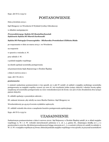 Sygn. akt II Ca 1133/12 POSTANOWIENIE Dnia 3 kwietnia 2013 r. Sąd Okręgowy we Wrocławiu II Wydział Cywilny-Odwoławczy w składzie następującym: Przewodniczący: Sędzia SO BeataStachowiak Sędziowie Sędzia SO Marek Kurkowski Sędzia SO Patrycja Gruszczyńska - Michurska Protokolant Elżbieta Biała po rozpoznaniu w dniu 20 marca 2013 r. we Wrocławiu na rozprawie w sprawie z wniosku A. W. przy udziale J. W. o podział majątku wspólnego na skutek apelacji uczestnika postępowania od postanowienia Sądu Rejonowego w Środzie Śląskiej z dnia 6 czerwca 2012 r. sygn. akt I Ns 26/11 postanawia: I. zmienić zaskarżone postanowienie w ten sposób ,że w pkt IV ustalić ,iż nakład z majątku osobistego uczestnika postępowania na majątek wspólny wynosi 131 000 zł ( sto trzydzieści jeden tysięcy złotych) i obniżyć kwotę spłaty zasądzoną od uczestnika postępowania na rzecz wnioskodawczyni do kwoty 122 500 zł (sto dwadzieścia dwa tysiące pięćset złotych); II. oddalić apelację w pozostałym zakresie ; III .nakazać stronom ,aby uiściły na rzecz Skarbu Państwa -Sąd Okręgowy we Wrocławiukwoty po 45,05 zł zwrotu wydatków sądowych; IV. oddalić wnioski obu stron o zasądzenie kosztów postępowania apelacyjnego . Sygn. akt II Ca 1133/12 UZASADNIENIE Zaskarżonym postanowieniem z dnia 6 czerwca 2012r. Sąd Rejonowy w Środzie Śląskiej ustalił ,że w skład majątku wspólnego A. W. i J. W. wchodzi nieruchomość położona w L. ul. (...), gmina M., obejmująca działkę nr (...) o powierzchni 0,1000 ha, dla której prowadzona jest księga wieczysta nr (...), o wartości 376000 zł; ustalił, że udziały A. W. i J. W. w majątku wspólnym są równe; dokonał podziału majątku wspólnego w ten sposób, że przyznał uczestnikowi J. W. na wyłączną własność nieruchomość opisaną w punkcie I postanowienia; zasądził od uczestnika J. W. na rzecz wnioskodawczyni A. W. tytułem spłaty kwotę 168000 zł płatną w terminie 3 miesięcy od uprawomocnienia się postanowienia z ustawowymi odsetkami w razie opóźnienia w płatności; ustalił, że wnioskodawczyni i uczestnik ponoszą koszty postępowania związane ze swoim udziałem w sprawie; nakazał wnioskodawczyni i uczestnikowi postępowania, aby uiścili na rzecz Skarbu Państwa kwoty po 170,68 zł każdy tytułem kosztów sądowych pokrytych tymczasowo ze Skarbu Państwa. Podstawę rozstrzygnięcia Sądu rejonowego stanowiły następujące ustalenia faktyczne: A. W.i J. W.zawarli związek małżeński w dniu 28 sierpnia 1999r. Następnie małżeństwo zostało rozwiązane przez rozwód wyrokiem Sądu Okręgowego we Wrocławiu z dnia 11 maja 2009 r. Strony podczas trwania związku małżeńskiego pozostawały w ustroju wspólności majątkowej małżeńskiej. W trakcie trwania związku małżeńskiego w dniu 24 stycznia 2007r. małżonkowie nabyli do majątku wspólnego udział w wysokości 2/6 we własności działki nr (...)położonej w L.. Na podstawie tej samej umowy udziały w tych nieruchomościach nabyli również: E. W.oraz B. N.. Koszty umowy ponieśli proporcjonalnie kupujący. Cenę w kwocie 60 000 zł zapłaciła w całości E. W., przy czym 20000 zł stanowiło darowiznę na rzecz syna J. W.. Po zakupie nieruchomości rozpoczęła się na niej budowa trzech domów, z których jeden miał być przeznaczony dla J.i A.małżonków W.. Budowę wszystkich tych domów finansowała w przeważającym zakresie E. W.do końca 2007r. Materiałybudowlane były kupowane jednorazowo na trzy budowy i te same ekipy wykonywały na nich poszczególne prace. Budowytych trzech domów początkowo prowadził B. N., podejmując decyzje po ustaleniach dokonanych z E. W.. W następnych latach matka uczestnika nie pomagała finansowo, ani nie kupowała materiałów budowlanych na budowę domu wnioskodawczyni i uczestnika. Darowizny materiałów budowlanych na budowę domu w L.zostały dokonane w 2007r. przez E. W.na rzecz swojego syna J. W.. W dniu 29 listopada 2007r. doszło do zniesienia współwłasności nieruchomości obejmującej działkę nr (...)w L., w wyniku, czego małżonkowie A.i J. W.uzyskali na wyłączną własność na prawach wspólności ustawowej działkę nr (...), E. W.działkę nr (...)oraz na współwłasności z B. N.działkę nr (...), wydzielone geodezyjnie z działki nr (...). Koszty tej umowy ponieśli współwłaściciele po 1/3 części. Po 2007r. w domu została wykonana instalacja elektryczna, schody wewnętrzne i zewnętrzne, łuki w salonie, ściany działowe, przyłącze do sieci wodociągowej, otynkowana została kuchnia .Ponadto zbudowane zostało szambo, zamontowane luksfery, a także zakupiono cement, cegły oraz inne materiały budowlane na budowę. Obecnie stan budynku określa się na surowy zamknięty. Na posesji zostało wykonane przyłącze wodociągowe, brak jest natomiast przyłącza energetycznego do budynku. Wartość tej nieruchomości wynosi 376 000 zł. Przez czas trwania małżeństwa matka wnioskodawczyni i matka uczestnika pomagały im finansowo w utrzymaniu. W trakcie małżeństwa oboje małżonkowie pracowali zawodowo z tym, że początkowo wnioskodawczyni prowadziła dom do końca 2006r., natomiast uczestnik pracował do 2008r., po czym przez rok był bezrobotny, W dniu 2 czerwca 2008r. wnioskodawczyni zaciągnęła pożyczkę bankową. Została ona przeznaczona na pokrycie kosztów związanych z budową domu i utrzymanie rodziny. Spłaciła go wnioskodawczyni z własnych zarobków oraz z pieniędzy uzyskanych od swojej matki w kwocie 16000 zł. Wnioskodawczyni uiściła w 2008r. opłaty związane z przyłączeniem do sieci wodociągowej i montażem wodomierzy, a w 2009r. poniosła koszty wymiany wodomierza . Sąd ustalając skład majątku wspólnego oraz dokonując jego podziału kierował się stanowiskiem stron ,które w tych kwestiach było zgodne .Poza sporem było ,iż w skład majątku wspólnego byłych małżonków wchodzi nieruchomość położ