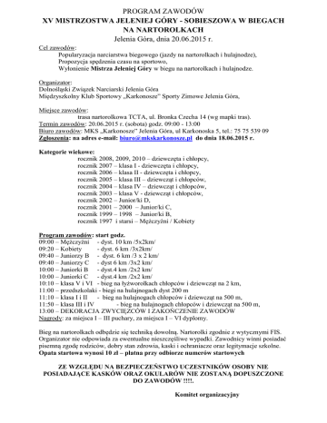 PROGRAM ZAWODÓW XV MISTRZOSTWA JELENIEJ GÓRY - SOBIESZOWA W BIEGACH NA NARTOROLKACH Jelenia Góra, dnia 20.06.2015 r. Cel zawodów: Popularyzacja narciarstwa biegowego (jazdy na nartorolkach i hulajnodze), Propozycja spędzenia czasu na sportowo, Wyłonienie Mistrza Jeleniej Góry w biegu na nartorolkach i hulajnodze. Organizator: Dolnośląski Związek Narciarski Jelenia Góra Międzyszkolny Klub Sportowy „Karkonosze” Sporty Zimowe Jelenia Góra, Miejsce zawodów: trasa nartorolkowa TCTA, ul. Bronka Czecha 14 (wg mapki tras). Termin zawodów: 20.06.2015 r. (sobota) godz. 09:00 - 13:00 Biuro zawodów: MKS „Karkonosze” Jelenia Góra, ul Karkonoska 5, tel.: 75 75 539 09 Zgłoszenia: na adres e-mail: [email protected] do dnia 18.06.2015 r. Kategorie wiekowe: rocznik 2008, 2009, 2010 – dziewczęta i chłopcy, rocznik 2007 – klasa I - dziewczęta i chłopcy, rocznik 2006 – klasa II - dziewczęta i chłopcy, rocznik 2005 – klasa III – dziewcząt i chłopców, rocznik 2004 – klasa IV – dziewcząt i chłopców, rocznik 2003 – klasa V - dziewcząt i chłopców, rocznik 2002 – Junior/ki D, rocznik 2001 – 2000 – Junior/ki C, rocznik 1999 – 1998 – Junior/ki B, rocznik 1997 i starsi – Mężczyźni / Kobiety Program zawodów: start godz. 09:00 – Mężczyźni - dyst. 10 km /5x2km/ 09:20 – Kobiety - dyst. 6 km /3x2km/ 09:40 – Juniorzy B - dyst. 6 km /3 x 2 km/ 09:40 – Juniorzy C - dyst 6 km /3x2 km/ 10:00 – Juniorki B - dyst.4 km /2x2 km/ 10:00 – Juniorki C - dyst.4 km /2x2 km/ 10:10 – klasa V i VI - bieg na łyżworolkach chłopców i dziewcząt na 2 km, 11:00 – przedszkolaki - biegi na hulajnogach dyst 200 m 11:10 – klasa I i II - bieg na hulajnogach chłopców i dziewcząt na 500 m, 11:50 – klasa III i IV - bieg na hulajnogach chłopców i dziewcząt na 500 m, 13:00 – DEKORACJA ZWYCIĘZCÓW I ZAKOŃCZENIE ZAWODÓW Nagrody: za miejsca I – III puchary, za miejsca I – VI dyplomy. Bieg na nartorolkach odbędzie się techniką dowolną. Nartorolki zgodnie z wytycznymi FIS. Organizator nie odpowiada za ewentualne nieszczęśliwe wypadki. Zawodnicy winni posiadać pisemną zgodę rodziców, dobry stan zdrowia, kaski i ochraniacze oraz legitymacje szkolne. Opata startowa wynosi 10 zł – płatna przy odbiorze numerów startowych ZE WZGLĘDU NA BEZPIECZEŃSTWO UCZESTNIKÓW OSOBY NIE POSIADAJĄCE KASKÓW ORAZ OKULARÓW NIE ZOSTANĄ DOPUSZCZONE DO ZAWODÓW !!!!. Komitet organizacyjny