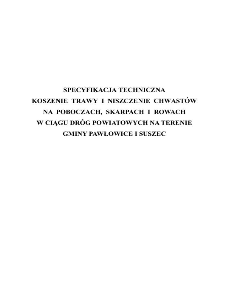 SPECYFIKACJA TECHNICZNA KOSZENIE TRAWY I NISZCZENIE CHWASTÓW NA POBOCZACH, SKARPACH I ROWACH W CIĄGU DRÓG POWIATOWYCH NA TERENIE GMINY PAWŁOWICE I SUSZEC 1. WSTĘP 1.1. Przedmiot ST Przedmiotem niniejszej specyfikacji technicznej są wymagania dotyczące wykonania i odbioru robót związanych z koszeniem trawy i niszczeniem chwastów w pasie drogowym dróg powiatowych na terenie Gminy Pawłowice i Suszec. 1.2. Zakres stosowania ST Specyfikacja techniczna stanowi podstawę jako dokument przetargowy i kontraktowy przy realizacji robót związanych z koszeniem trawy i niszczeniem chwastów w pasie drogowym dróg powiatowych na terenie Gminy Pawłowice i Suszec. Zamawiający wymaga: 1) wykonania trzech pełnych koszeń w ciągu dróg powiatowych na terenie Gminy Suszec 2) wykonania dwóch pełnych koszeń i dwóch na szerokość ok 2x2,5m w ciągu dróg powiatowych na terenie Gminy Pawłowice 1.3. Zakres robót objętych ST Ustalenia zawarte w niniejszej specyfikacji dotyczą zasad prowadzenia robót związanych z: robotami przygotowawczymi, koszeniem traw i chwastów w pasie drogowym kosiarkami , wycięciem jednorocznych samosiewów i odrostów, wycięciem trawy w miejscach niedostępnych, 1.4. Określenia podstawowe 1.4.1. Standard utrzymania drogi - zespół wymagań określający poziom bieżącego utrzymania drogi i jej wyposażenia w zależności od funkcji i obciążenia ruchem. Maksymalna wysokość traw i samosiewów po wykoszeniu: 5 cm. 1.4.2. Jednoroczne samosiewy - rośliny rozmnożone samoczynnie z nasion drzew i krzewów w miejscach niepożądanych. 1.4.3. Chwasty - rośliny niepożądane, występujące wśród upraw roślin (w tym wypadku traw), hamujące ich rozwój i jakość. 2. Sprzęt do koszenia trawy i niszczenia chwastów Wykonawca przystępujący do koszenia trawy i niszczenia chwastów powinien wykazać się możliwością korzystania z następującego sprzętu na każde z zadań: - Ciągnik: 1szt. - Kosiarka bijakowa o wysięgu umożliwiającym koszenie na szerokość 5 m: 1szt. - Podkaszarka ręczna: 2 szt. - Tablica zamykająca U-26c: 1 szt. 4. Transport Do przewozu skoszonej trawy, chwastów i zanieczyszczeń można użyć dowolnego sprzętu transportowego, dopuszczonego do poruszania się po drogach zgodnie z tonażem. 5. Wykonanie robót 5.1. Roboty przygotowawcze Roboty przygotowawcze Wykonawca wykonuje przed rozpoczęciem koszenia, najlepiej wiosną. Do robót tych zalicza się: wybranie z trawy kamieni, gruzu, puszek metalowych lub innych zanieczyszczeń, wygrabienie liści, które spadły z drzew, rozgarnięcie kretowisk, wycięcie jednorocznych samosiewów i odrostów, wywóz zebranych zanieczyszczeń na wysypisko publiczne lub składowiska własne, po uzgodnieniu miejsca wywozu z Zamawiającym. 5.2. Koszenie traw i chwastów Koszenie traw i chwastów na pasach drogowych odbywać się będzie po pisemnym zleceniu robót przez Zamawiającego w zakresie przez niego określonym. Wykonawca ma obowiązek zadbać o to aby trawa na poboczach, skarpach i rowach po wykoszeniu nie była większa niż określona wysokość w pkt. 1.4.1 W pierwszej kolejności powinny być koszone trawy, chwasty i samosiewy na koronie drogi, a w szczególności występujące na: wysepkach i trawnikach, poboczach, pod barierami, oraz w miejscach mających zasadniczy wpływ na wizualny wygląd drogi. W drugiej kolejności powinny być koszone skarpy i przeciwskarpy rowów. Wysokość trawy po skoszeniu powinna być nie większa niż 5 cm. Prace powinny być prowadzone tak by nie występowało zagrożenie bezpieczeństwa dla osób trzecich, a także by nie nastąpiło uszkodzenie pojazdów lub innych urządzeń obcych. Po przeprowadzonych pracach należy uprzątnąć zanieczyszczenia z jezdni i chodników. 5.3. Wycięcie traw w miejscach niedostępnych i obcinka żywopłotu Wycięcie traw i chwastów w miejscach niedostępnych i częściowo obsadzonych wykonuje się kosiarkami żyłkowymi równolegle z głównym koszeniem. 6. Kontrola jakości robót W czasie wykonywania robót należy przeprowadzać ciągłą kontrolę poprawności koszenia trawy i niszczenia chwastów, zgodnie z wymaganiami punktu 5, w tym w szczególności: usunięcia wszystkich obcych zanieczyszczeń z miejsc pracy kosiarek, dopilnowania terminu pierwszego koszenia traw i chwastów, aby nie nastąpił wysyp dojrzałych nasion chwastów, skontrolowania dopuszczalnej wysokości trawy po jej skoszeniu, usunięcia skoszonej trawy i chwastów z jezdni i chodników. 7. Obmiar robót Jednostką obmiarową koszenia traw i niszczenia chwastów jest 100 m2 (100 metrów kwadratowych). 8. Odbiór robót Odbioru dokonuje Zamawiający w terminie do 7 dni od daty zgłoszenia gotowości do odbioru i otrzymania od Wykonawcy niezbędnych dokumentów. Prace podlegają odbiorowi przez Zamawiającego tj. PZD Pszczyna. Z powyższego odbioru zostanie sporządzony protokół odbioru robót, który zostanie załączony do faktury częściowej. 9. Podstawa płatności Cena 100 m2 koszenia obejmuje: oznakowanie robót, roboty przygotowawcze (usunięcie obcych zanieczyszczeń z miejsc pracy kosiarki), dostawę i pracę sprzętu do koszenia, koszenie traw, chwastów i samosiewów, wycięcie traw w miejscach niedostępnych i wycięcie jednorocznych samosiewów i odrostów, uprzątnięcie skoszonej trawy i chwastów z jezdni i chodników, odtransportowanie sprzętu.