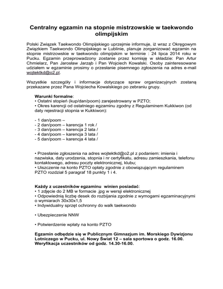 Centralny egzamin na stopnie mistrzowskie w taekwondo olimpijskim Polski Związek Taekwondo Olimpijskiego uprzejmie informuje, iż wraz z Okręgowym Związkiem Taekwondo Olimpijskiego w Lublinie, planuje zorganizować egzamin na stopnie mistrzowskie w taekwondo olimpijskim w terminie : 24 lipca 2014 roku w Pucku. Egzamin przeprowadzony zostanie przez komisję w składzie: Pan Artur Chmielarz, Pan Jarosław Jarząb i Pan Wojciech Kowalski. Osoby zainteresowane udziałem w egzaminie prosimy o przesłanie pisemnego zgłoszenia na adres e-mail [email protected]. Wszystkie szczegóły i informacje dotyczące spraw organizacyjnych zostaną przekazane przez Pana Wojciecha Kowalskiego po zebraniu grupy. Warunki formalne: • Ostatni stopień (kup/dan/poom) zarejestrowany w PZTO; • Okres karencji od ostatniego egzaminu zgodny z Regulaminem Kukkiwon (od daty rejestracji stopnia w Kukkiwon): - 1 dan/poom – - 2 dan/poom – karencja 1 rok / - 3 dan/poom – karencja 2 lata / - 4 dan/poom – karencja 3 lata / - 5 dan/poom – karencja 4 lata / • Przesłanie zgłoszenia na adres [email protected] z podaniem: imienia i nazwiska, daty urodzenia, stopnia i nr certyfikatu, adresu zamieszkania, telefonu kontaktowego, adresu poczty elektronicznej, klubu; • Uiszczenie na konto PZTO opłaty zgodnie z obowiązującym regulaminem PZTO rozdział 5 paragraf 18 punkty 1 i 4. Każdy z uczestników egzaminu winien posiadać: • 1 zdjęcie do 2 MB w formacie .jpg w wersji elektronicznej • Odpowiednią liczbę desek do rozbijania zgodnie z wymogami egzaminacyjnymi o wymiarach 30x30x1,5 • Indywidualny sprzęt ochronny do walk taekwondo • Ubezpieczenie NNW • Potwierdzenie wpłaty na konto PZTO Egzamin odbędzie się w Publicznym Gimnazjum im. Morskiego Dywizjonu Lotniczego w Pucku, ul. Nowy Świat 12 – sala sportowa o godz. 16.00. Weryfikacja uczestników od godz. 14.30-16.00.