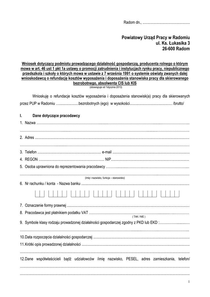 Radom dn., ................................................. Powiatowy Urząd Pracy w Radomiu ul. Ks. Łukasika 3 26-600 Radom Wniosek dotyczący podmiotu prowadzącego działalność gospodarczą, producenta rolnego o którym mowa w art. 46 ust 1 pkt 1a ustawy o promocji zatrudnienia i instytucjach rynku pracy, niepublicznego przedszkola i szkoły o których mowa w ustawie z 7 września 1991 o systemie oświaty zwanych dalej wnioskodawcą o refundację kosztów wyposażenia i doposażenia stanowiska pracy dla skierowanego bezrobotnego, absolwenta CIS lub KIS (obowiązuje od 1stycznia 2013) Wnioskuję o refundacje kosztów wyposażenia i doposażenia stanowisk(a) pracy dla skierowanych przez PUP w Radomiu …....................bezrobotnych (ego) w wysokości............................................ /brutto/ I. Dane dotyczące pracodawcy 1. Nazwa ……………………………………………….........…………………………………..........…………………... ……………………………….........…………………………………………………………...........………………………. 2. Adres ................................................................................................................................................................ ………………………….............………………………………………………………………………………………….… 3. Telefon .................................................................. e-mail ................................................................................ 4. REGON .................................................................... NIP................................................................................. 5. Osoba uprawniona do reprezentowania pracodawcy ………............………….….…………………………….... ………............………………………………………………………………………………………..……………………… (imię i nazwisko, funkcja – stanowisko) 6. Nr rachunku / konta - Nazwa banku ................................................................................................................ 7. Oznaczenie formy prawnej ............................................................................................................................... 8. Pracodawca jest płatnikiem podatku VAT ……………………………………………………...........…...………… ( TAK / NIE ) 9. Symbole klasy rodzaju prowadzonej działalności gospodarczej zgodny z PKD lub EKD :……………..........… ……………………………………………………………………………………...........…………...……………………... 10. Data rozpoczęcia działalności gospodarczej .................................................................................................... 11. Krótki opis prowadzonej działalności ................................................................................................................ ................................................................................................................................................................................ 12. Dane współwłaścicieli bądź udziałowców /imię nazwisko, PESEL, adres zamieszkania, telefon/ ................................................................................................................................................................................ ................................................................................................................................................................................ 1 13. W ostatnich trzech latach korzystałem z następującej pomocy finansowej PUP Radom LP Data pomocy Rodzaj/forma pomocy Wysokość pomocy (zł) 14. Informacja o sytuacji ekonomiczno-finansowej wnioskodawcy Majątek trwały podmiotu/niepublicznego przedszkola/ szkoły/ producenta rolnego: (ruchomości i nieruchomości) – rodzaj, bieżąca wartość rynkowa, nr księgi wieczystej lub nr geodezyjny działki, adres: ................................................................................................................................................................................ ................................................................................................................................................................................ ................................................................................................................................................................................ ................................................................................................................................................................................ ................................................................................................................................................................................ II. Liczba zatrudnionych w przeliczeniu na pełny wymiar czasu pracy pracowników w poszczególnych 6 miesiącach poprzedzających złożenie wniosku Miesiąc /rok III. Ogółem zatrudnionych wszystkich pracowników Zatrudnieni pracownicy w przeliczeniu na pełny wymiar czasu pracy Zwolniono Uwagi Podać przyczyny zwolnienia oraz wskazać na jakiej podstawie rozwiązano stosunek pracy Liczba ogółem zatrudnionych w przeliczeniu na pełny wymiar czasu pracy pracowników w dniu w którym złożono wniosek wynosi ……………..................................................………….….. 2 IV. Lp Kalkulacja wydatków dla poszczególnych tworzonych stanowisk pracy Liczba stanowisk pracy Wydatki /brutto/ Rodzaj / nazwa stanowiska pracy środki własne refundacja razem 1 2 3 4 Razem V. Stanowisko / rodzaj pracy oraz wymagania w stosunku do bezrobotnych. LP Stanowisko / rodzaj pracy Liczba stanowi