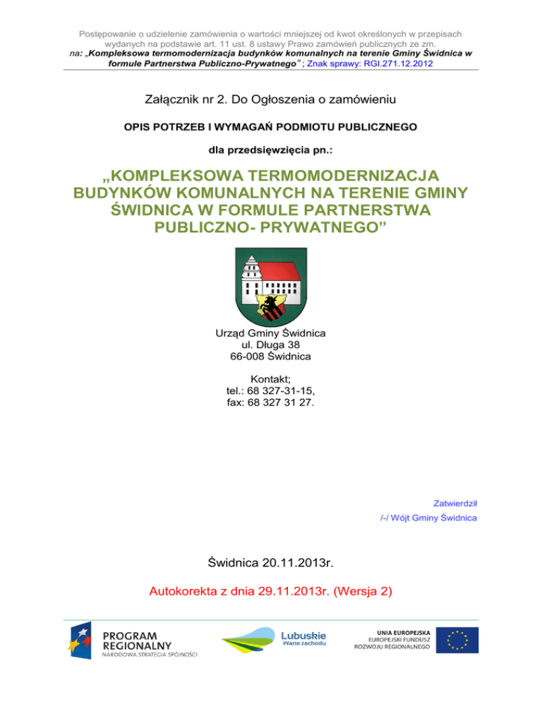 Postępowanie o udzielenie zamówienia o wartości mniejszej od kwot określonych w przepisach wydanych na podstawie art. 11 ust. 8 ustawy Prawo zamówień publicznych ze zm. na: „Kompleksowa termomodernizacja budynków komunalnych na terenie Gminy Świdnica w formule Partnerstwa Publiczno-Prywatnego ” ; Znak sprawy: RGI.271.12.2012 Załącznik nr 2. Do Ogłoszenia o zamówieniu OPIS POTRZEB I WYMAGAŃ PODMIOTU PUBLICZNEGO dla przedsięwzięcia pn.: „KOMPLEKSOWA TERMOMODERNIZACJA BUDYNKÓW KOMUNALNYCH NA TERENIE GMINY ŚWIDNICA W FORMULE PARTNERSTWA PUBLICZNO- PRYWATNEGO” Urząd Gminy Świdnica ul. Długa 38 66-008 Świdnica Kontakt; tel.: 68 327-31-15, fax: 68 327 31 27. Zatwierdził /-/ Wójt Gminy Świdnica Świdnica 20.11.2013r. Autokorekta z dnia 29.11.2013r. (Wersja 2) Postępowanie o udzielenie zamówienia o wartości mniejszej od kwot określonych w przepisach wydanych na podstawie art. 11 ust. 8 ustawy Prawo zamówień publicznych ze zm. na: „Kompleksowa termomodernizacja budynków komunalnych na terenie Gminy Świdnica w formule Partnerstwa Publiczno-Prywatnego ” ; Znak sprawy: RGI.271.12.2012 SPIS TRESCI: 1. Ogólna charakterystyka przedsięwzięcia ......................................................................................... 4 2. Opis potrzeb i wymagań prawno- administracyjnych ..................................................................... 11 3. Potrzeby i wymagania związane ze składnikiem majątkowym przeznaczonym do realizacji przedsięwzięcia ............................................................................................................................. 12 4. Finansowanie przedsięwzięcia ....................................................................................................... 14 5. Potrzeby i wymagania związane z projektowaniem i budową........................................................ 15 6. Potrzeby i wymagania związane z utrzymaniem i zarzadzaniem przedmiotem przedsięwzięcia .. 18 7. Potrzeby i wymagania związane z podziałem ryzyk ...................................................................... 19 8. Potrzeby i wymagania związane z odpowiedzialnością zabezpieczeniami i ubezpieczeniem ...... 21 9. Potrzeby i wymagania związane z warunkami odstąpienia od umowy oraz przedwczesnego rozwiązania umowy ........................................................................................................................ 22 Postępowanie o udzielenie zamówienia o wartości mniejszej od kwot określonych w przepisach wydanych na podstawie art. 11 ust. 8 ustawy Prawo zamówień publicznych ze zm. na: „Kompleksowa termomodernizacja budynków komunalnych na terenie Gminy Świdnica w formule Partnerstwa Publiczno-Prywatnego ” ; Znak sprawy: RGI.271.12.2012 Opis potrzeb i wymagań podmiotu publicznego, który umożliwia przygotowanie się wykonawców do dialogu Niniejszy OPIS POTRZEB I WYMAGAŃ Zamawiającego (zgodnie z art. 60c ust.1 pkt. 1 ustawy PZP) stanowi Załącznik nr 2 do ogłoszenia o zamówieniu oraz (zgodnie z art. 60d ust.5 pkt. 2 ustawy PZP) zostanie przekazany Wykonawcom spełniającym warunki udziału w postępowaniu wraz z zaproszeniem do dialogu. Celem dialogu jest wypracowanie w drodze negocjacji z potencjalnymi partnerami prywatnymi optymalnego modelu realizacji planowanego przedsięwzięcia w zakresie podziału obowiązków oraz ryzyk na strony umowy. Przedmiot zamówienia zostanie doprecyzowany i uzupełniony na etapie prowadzenia dialogu z Wykonawcami. Zamawiający oczekuje, że w trakcie negocjacji Wykonawcy - w oparciu o swoją wiedzę i doświadczenie - zaproponują najbardziej optymalne rozwiązania służące realizacji przedmiotu zamówienia w sposób najbardziej efektywny oraz ustalą wspólnie z Zamawiającym podział zadań i ryzyk związanych z przedsięwzięciem. Zgodnie z art 60e ust. 2 ustawy Prawo zamówień publicznych, Podmiot Publiczny zastrzega sobie prawo zmiany i/lub doprecyzowania wymagań będących przedmiotem dialogu przedstawionych w niniejszym dokumencie przed zaproszeniem Wykonawców do składania ofert. Postępowanie o udzielenie zamówienia o wartości mniejszej od kwot określonych w przepisach wydanych na podstawie art. 11 ust. 8 ustawy Prawo zamówień publicznych ze zm. na: „Kompleksowa termomodernizacja budynków komunalnych na terenie Gminy Świdnica w formule Partnerstwa Publiczno-Prywatnego ” ; Znak sprawy: RGI.271.12.2012 1. Ogólna charakterystyka przedsięwzięcia 1.1. Krótka informacja o podmiocie publicznym Gmina wiejska Świdnica, położona jest na południe od centralnej części Województwa Lubuskiego w Powiecie Zielonogórskim. Lokalizację projektu w kraju i województwie prezentuje poniższa mapa. Mapa 1. Lokalizacja projektu w Województwie Lubuskim, Powiecie Zielonogórskim w Gminie Świdnica Gmina Świdnica to w całości obszar wiejski. Głównym ośrodkiem administracyjnym i jednocześnie największą miejscowością gminy jest m. Świdnica o liczbie 1744 mieszkańców. W pozostałych miejscowościach objętych projektem mieszka odpowiednio: Koźla 549 osób i Słone 471 mieszkańców. Miejscowość Świdnica, stanowiąca centrum życia społeczno-gospodarczego gminy oddalona jest od stolicy powiatu – Zielonej Góry o ok. 7÷ 9 kilometrów. Lokalizację OBIEKTÓW OBJĘTYCH PROJEKTEM z ukazaniem struktury osadniczej gminy ukazuje poniższy schemat. Postępowanie o udzielenie zamówienia o wartości mniejszej od kwot określonych w przepisach wydanych na podstawie art. 11 ust. 8 ustawy Prawo zamówień publicznych ze zm. na: „Kompleksowa termomodernizacja budynków komunalnych na terenie Gminy Świdnica w formule Partnerstwa Publiczno-Prywatnego ” ; Znak sprawy: RGI.271.12.2012 Rysunek 1. Struktura osadnicza Gminy Świdnica z ukazaną lokalizacją projektu. Legenda: O1- Obiekt 1) : Szkoła Podstawowa w Świdnicy, ul. Ogrodowa 26; O2- Obiekt 2) Szkoła Podstawowa w Koźli nr 17; O3- Obiekt 3): Szkoła Podst