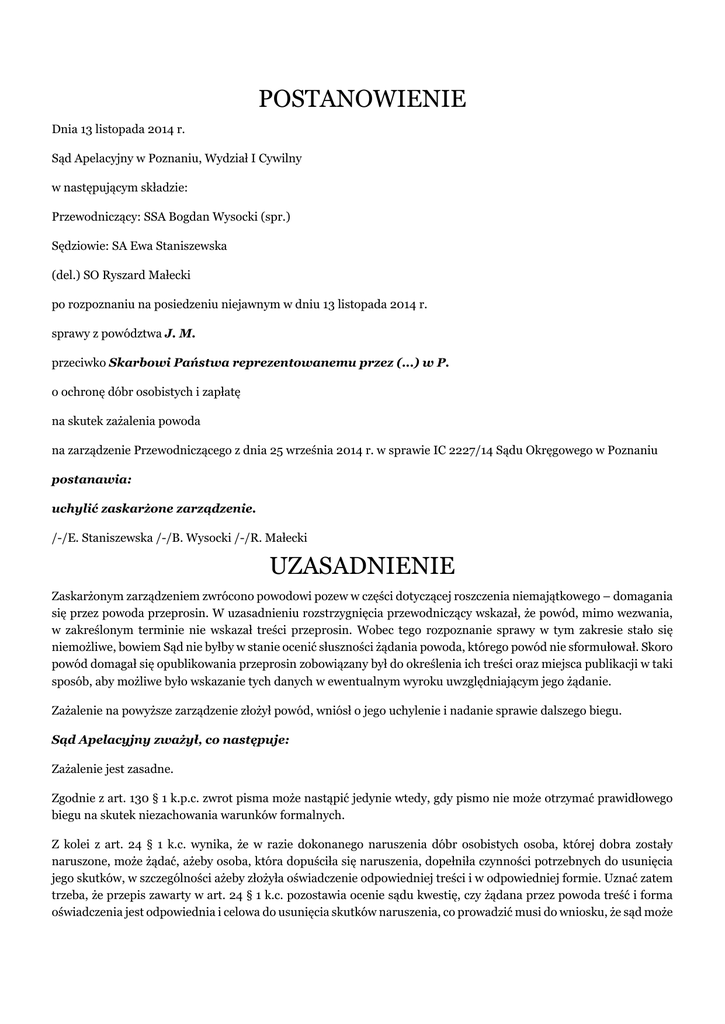 POSTANOWIENIE Dnia 13 listopada 2014 r. Sąd Apelacyjny w Poznaniu, Wydział I Cywilny w następującym składzie: Przewodniczący: SSA Bogdan Wysocki (spr.) Sędziowie: SA Ewa Staniszewska (del.) SO Ryszard Małecki po rozpoznaniu na posiedzeniu niejawnym w dniu 13 listopada 2014 r. sprawy z powództwa J. M. przeciwko Skarbowi Państwa reprezentowanemu przez (...) w P. o ochronę dóbr osobistych i zapłatę na skutek zażalenia powoda na zarządzenie Przewodniczącego z dnia 25 września 2014 r. w sprawie IC 2227/14 Sądu Okręgowego w Poznaniu postanawia: uchylić zaskarżone zarządzenie. /-/E. Staniszewska /-/B. Wysocki /-/R. Małecki UZASADNIENIE Zaskarżonym zarządzeniem zwrócono powodowi pozew w części dotyczącej roszczenia niemajątkowego – domagania się przez powoda przeprosin. W uzasadnieniu rozstrzygnięcia przewodniczący wskazał, że powód, mimo wezwania, w zakreślonym terminie nie wskazał treści przeprosin. Wobec tego rozpoznanie sprawy w tym zakresie stało się niemożliwe, bowiem Sąd nie byłby w stanie ocenić słuszności żądania powoda, którego powód nie sformułował. Skoro powód domagał się opublikowania przeprosin zobowiązany był do określenia ich treści oraz miejsca publikacji w taki sposób, aby możliwe było wskazanie tych danych w ewentualnym wyroku uwzględniającym jego żądanie. Zażalenie na powyższe zarządzenie złożył powód, wniósł o jego uchylenie i nadanie sprawie dalszego biegu. Sąd Apelacyjny zważył, co następuje: Zażalenie jest zasadne. Zgodnie z art. 130 § 1 k.p.c. zwrot pisma może nastąpić jedynie wtedy, gdy pismo nie może otrzymać prawidłowego biegu na skutek niezachowania warunków formalnych. Z kolei z art. 24 § 1 k.c. wynika, że w razie dokonanego naruszenia dóbr osobistych osoba, której dobra zostały naruszone, może żądać, ażeby osoba, która dopuściła się naruszenia, dopełniła czynności potrzebnych do usunięcia jego skutków, w szczególności ażeby złożyła oświadczenie odpowiedniej treści i w odpowiedniej formie. Uznać zatem trzeba, że przepis zawarty w art. 24 § 1 k.c. pozostawia ocenie sądu kwestię, czy żądana przez powoda treść i forma oświadczenia jest odpowiednia i celowa do usunięcia skutków naruszenia, co prowadzić musi do wniosku, że sąd może ingerować w żądaną treść oświadczenia przez ograniczenie jej zakresu, czy uściślenie określonych sformułowań. Nie jest zatem konieczne do nadania sprawie biegu, aby strona wprost redagowała tekst przeprosin jakich się domaga, gdy - jak ma to miejsce w niniejszej sprawie - z treści pisma powoda z dnia 11 sierpnia 2014 r. w sposób dostatecznie zrozumiały wynika, że domaga się przeprosin od pozwanego Skarbu Państwa za wskazane w pozwie i w dalszych pismach procesowych działania. Jest to wystarczające do nadania pismu dalszego biegu, zważywszy na fakt, że Sąd Okręgowy może samodzielnie tekst przeprosin uściślić, mając na uwadze zgłoszone żądanie przeprosin, zakres stwierdzonych naruszeń oraz potrzebę usunięcia ich skutków. Wobec powyższego stanowiska podnoszona w zażaleniu okoliczność braku umiejętności sformułowania przez powoda tekstu przeprosin zgodnie z wezwaniem Przewodniczącego a następnie ich usunięcie w zażaleniu tj. po upływie zakreślonego terminu pozostaje już bez istotnego znaczenia. Mając powyższe na uwadze Sąd Apelacyjny na podstawie art. 386 § 1 k.p.c. w zw. z art. 397 § 2 k.p.c. oraz art. 398 k.p.c. uchylił zaskarżone zarządzenie, wobec stwierdzenia braku uzasadnionych podstaw do jego wydania. /-/E. Staniszewska /-/B. Wysocki /-/R. Małecki
