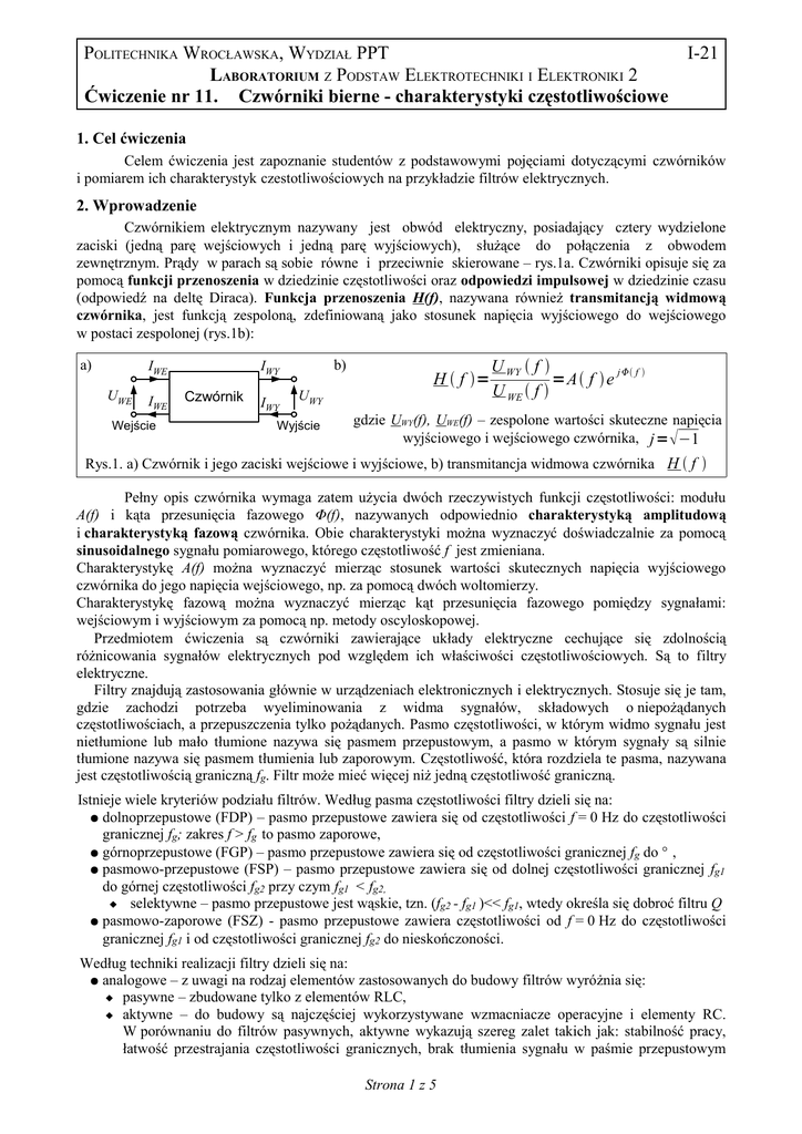 POLITECHNIKA WROCŁAWSKA, WYDZIAŁ PPT LABORATORIUM Z PODSTAW ELEKTROTECHNIKI I ELEKTRONIKI 2 Ćwiczenie nr 11. Czwórniki bierne - charakterystyki częstotliwościowe I-21 1. Cel ćwiczenia Celem ćwiczenia jest zapoznanie studentów z podstawowymi pojęciami dotyczącymi czwórników i pomiarem ich charakterystyk czestotliwościowych na przykładzie filtrów elektrycznych. 2. Wprowadzenie Czwórnikiem elektrycznym nazywany jest obwód elektryczny, posiadający cztery wydzielone zaciski (jedną parę wejściowych i jedną parę wyjściowych), służące do połączenia z obwodem zewnętrznym. Prądy w parach są sobie równe i przeciwnie skierowane – rys.1a. Czwórniki opisuje się za pomocą funkcji przenoszenia w dziedzinie częstotliwości oraz odpowiedzi impulsowej w dziedzinie czasu (odpowiedź na deltę Diraca). Funkcja przenoszenia H(f), nazywana również transmitancją widmową czwórnika, jest funkcją zespoloną, zdefiniowaną jako stosunek napięcia wyjściowego do wejściowego w postaci zespolonej (rys.1b): a) IWE UWE IWE Wejście b) IWY Czwórnik IWY UWY Wyjście H f = U WY f j f =A f e U WE f gdzie UWY(f), UWE(f) – zespolone wartości skuteczne napięcia wyjściowego i wejściowego czwórnika, j=−1 Rys.1. a) Czwórnik i jego zaciski wejściowe i wyjściowe, b) transmitancja widmowa czwórnika H f Pełny opis czwórnika wymaga zatem użycia dwóch rzeczywistych funkcji częstotliwości: modułu A(f) i kąta przesunięcia fazowego Φ(f), nazywanych odpowiednio charakterystyką amplitudową i charakterystyką fazową czwórnika. Obie charakterystyki można wyznaczyć doświadczalnie za pomocą sinusoidalnego sygnału pomiarowego, którego częstotliwość f jest zmieniana. Charakterystykę A(f) można wyznaczyć mierząc stosunek wartości skutecznych napięcia wyjściowego czwórnika do jego napięcia wejściowego, np. za pomocą dwóch woltomierzy. Charakterystykę fazową można wyznaczyć mierząc kąt przesunięcia fazowego pomiędzy sygnałami: wejściowym i wyjściowym za pomocą np. metody oscyloskopowej. Przedmiotem ćwiczenia są czwórniki zawierające układy elektryczne cechujące się zdolnością różnicowania sygnałów elektrycznych pod względem ich właściwości częstotliwościowych. Są to filtry elektryczne. Filtry znajdują zastosowania głównie w urządzeniach elektronicznych i elektrycznych. Stosuje się je tam, gdzie zachodzi potrzeba wyeliminowania z widma sygnałów, składowych o niepożądanych częstotliwościach, a przepuszczenia tylko pożądanych. Pasmo częstotliwości, w którym widmo sygnału jest nietłumione lub mało tłumione nazywa się pasmem przepustowym, a pasmo w którym sygnały są silnie tłumione nazywa się pasmem tłumienia lub zaporowym. Częstotliwość, która rozdziela te pasma, nazywana jest częstotliwością graniczną fg. Filtr może mieć więcej niż jedną częstotliwość graniczną. Istnieje wiele kryteriów podziału filtrów. Według pasma częstotliwości filtry dzieli się na: ● dolnoprzepustowe (FDP) – pasmo przepustowe zawiera się od częstotliwości f = 0 Hz do częstotliwości granicznej fg; zakres f > fg to pasmo zaporowe, ● górnoprzepustowe (FGP) – pasmo przepustowe zawiera się od częstotliwości granicznej fg do ∞, ● pasmowo-przepustowe (FSP) – pasmo przepustowe zawiera się od dolnej częstotliwości granicznej fg1 do górnej częstotliwości fg2 przy czym fg1 < fg2, selektywne – pasmo przepustowe jest wąskie, tzn. (fg2 - fg1 )<< fg1, wtedy określa się dobroć filtru Q ● pasmowo-zaporowe (FSZ) - pasmo przepustowe zawiera częstotliwości od f = 0 Hz do częstotliwości granicznej fg1 i od częstotliwości granicznej fg2 do nieskończoności. Według techniki realizacji filtry dzieli się na: ● analogowe – z uwagi na rodzaj elementów zastosowanych do budowy filtrów wyróżnia się: pasywne – zbudowane tylko z elementów RLC, aktywne – do budowy są najczęściej wykorzystywane wzmacniacze operacyjne i elementy RC. W porównaniu do filtrów pasywnych, aktywne wykazują szereg zalet takich jak: stabilność pracy, łatwość przestrajania częstotliwości granicznych, brak tłumienia sygnału w paśmie przepustowym Strona 1 z 5 POLITECHNIKA WROCŁAWSKA, WYDZIAŁ PPT LABORATORIUM Z PODSTAW ELEKTROTECHNIKI I ELEKTRONIKI 2 Ćwiczenie nr 11. Czwórniki bierne - charakterystyki częstotliwościowe I-21 i możliwość wzmocnienia sygnału. Zaletą jest możliwość wyeliminowania elementów indukcyjnych – ma to szczególne znaczenie przy małych częstotliwościach. Filtry aktywne mogą pracować od tysięcznych części Hz do kilkunastu MHz. Górna częstotliwość graniczna filtrów aktywnych jest ograniczona pasmem przenoszenia zastosowanego wzmacniacza. ● cyfrowe – są realizowane w układach procesorowych w oparciu o odpowiednie algorytmy obliczeniowe. Operują one nie na rzeczywistym sygnale analogowym lecz na jego cyfrowej reprezentacji. Wynikiem filtracji jest również sygnał cyfrowy, który może być zamieniony na sygnał analogowy przy użyciu przetwornika cyfrowo - analogowego. Podstawowe parametry charakteryzujące filtry to: ● typ charakterystyki filtru – dolnoprzepustowy, górnoprzepustowy, itp., ● częstotliwości graniczne filtru – zwykle wyznaczane za pomocą kryterium 3 dB1, ● charakterystyka amplitudowa filtru – zmiana tłumienia w funkcji częstotliwości, ● charakterystyka fazowa2 filtru – zmiana przesunięcia fazowego w funkcji częstotliwości, ● nachylenie zbocza charakterystyki 3 przy przejściu od pasma przenoszenia do pasma tłumienia, zazwyczaj wyrażane w dB/dekadę lub dB/oktawę4 Przyjęto, że na wykresach charakterystyki amplitudowe filtrów są przedstawiane w skali logarytmicznej, przy czym oś częstotliwości jest osią z podziałką logarytmiczną, a oś modułu wyraża się w decybelach. Dzięki takiemu założeniu uzyskuje się czytelne wykresy charakterystyk. Dalszym uproszczeniem są wykresy w pos