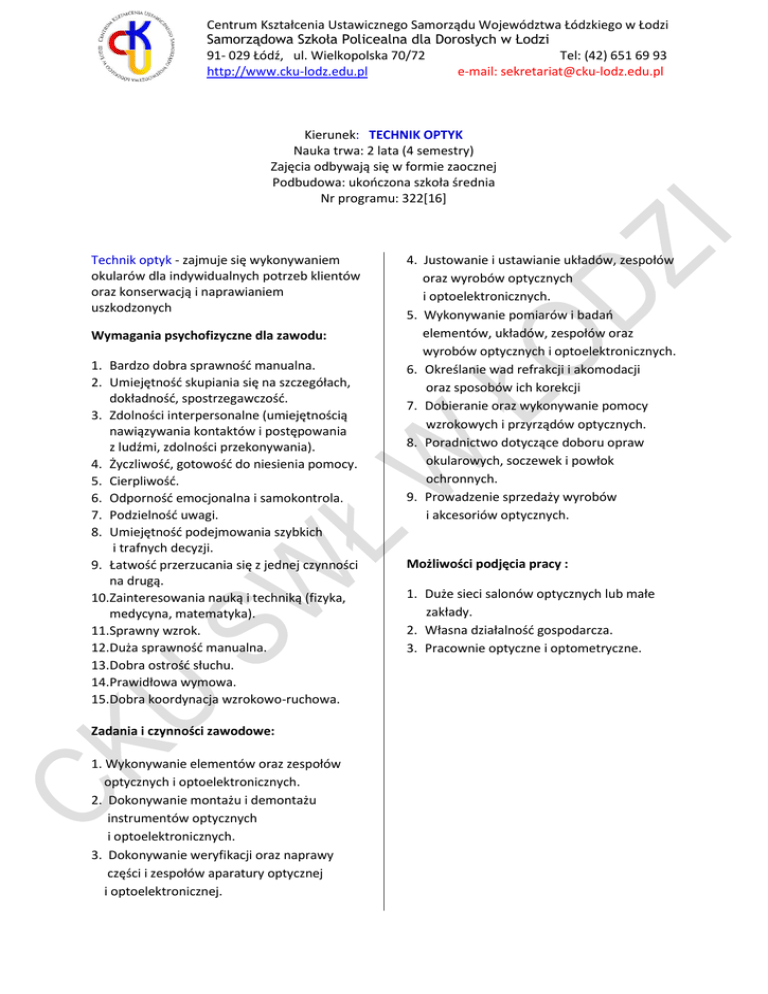 Centrum Kształcenia Ustawicznego Samorządu Województwa Łódzkiego w Łodzi Samorządowa Szkoła Policealna dla Dorosłych w Łodzi 91- 029 Łódź, ul. Wielkopolska 70/72 Tel: (42) 651 69 93 http://www.cku-lodz.edu.pl e-mail: [email protected] Kierunek: TECHNIK OPTYK Nauka trwa: 2 lata (4 semestry) Zajęcia odbywają się w formie zaocznej Podbudowa: ukończona szkoła średnia Nr programu: 322[16] Technik optyk - zajmuje się wykonywaniem okularów dla indywidualnych potrzeb klientów oraz konserwacją i naprawianiem uszkodzonych Wymagania psychofizyczne dla zawodu: 1. Bardzo dobra sprawność manualna. 2. Umiejętność skupiania się na szczegółach, dokładność, spostrzegawczość. 3. Zdolności interpersonalne (umiejętnością nawiązywania kontaktów i postępowania z ludźmi, zdolności przekonywania). 4. Życzliwość, gotowość do niesienia pomocy. 5. Cierpliwość. 6. Odporność emocjonalna i samokontrola. 7. Podzielność uwagi. 8. Umiejętność podejmowania szybkich i trafnych decyzji. 9. Łatwość przerzucania się z jednej czynności na drugą. 10.Zainteresowania nauką i techniką (fizyka, medycyna, matematyka). 11.Sprawny wzrok. 12.Duża sprawność manualna. 13.Dobra ostrość słuchu. 14.Prawidłowa wymowa. 15.Dobra koordynacja wzrokowo-ruchowa. Zadania i czynności zawodowe: 1. Wykonywanie elementów oraz zespołów optycznych i optoelektronicznych. 2. Dokonywanie montażu i demontażu instrumentów optycznych i optoelektronicznych. 3. Dokonywanie weryfikacji oraz naprawy części i zespołów aparatury optycznej i optoelektronicznej. 4. Justowanie i ustawianie układów, zespołów oraz wyrobów optycznych i optoelektronicznych. 5. Wykonywanie pomiarów i badań elementów, układów, zespołów oraz wyrobów optycznych i optoelektronicznych. 6. Określanie wad refrakcji i akomodacji oraz sposobów ich korekcji 7. Dobieranie oraz wykonywanie pomocy wzrokowych i przyrządów optycznych. 8. Poradnictwo dotyczące doboru opraw okularowych, soczewek i powłok ochronnych. 9. Prowadzenie sprzedaży wyrobów i akcesoriów optycznych. Możliwości podjęcia pracy : 1. Duże sieci salonów optycznych lub małe zakłady. 2. Własna działalność gospodarcza. 3. Pracownie optyczne i optometryczne.