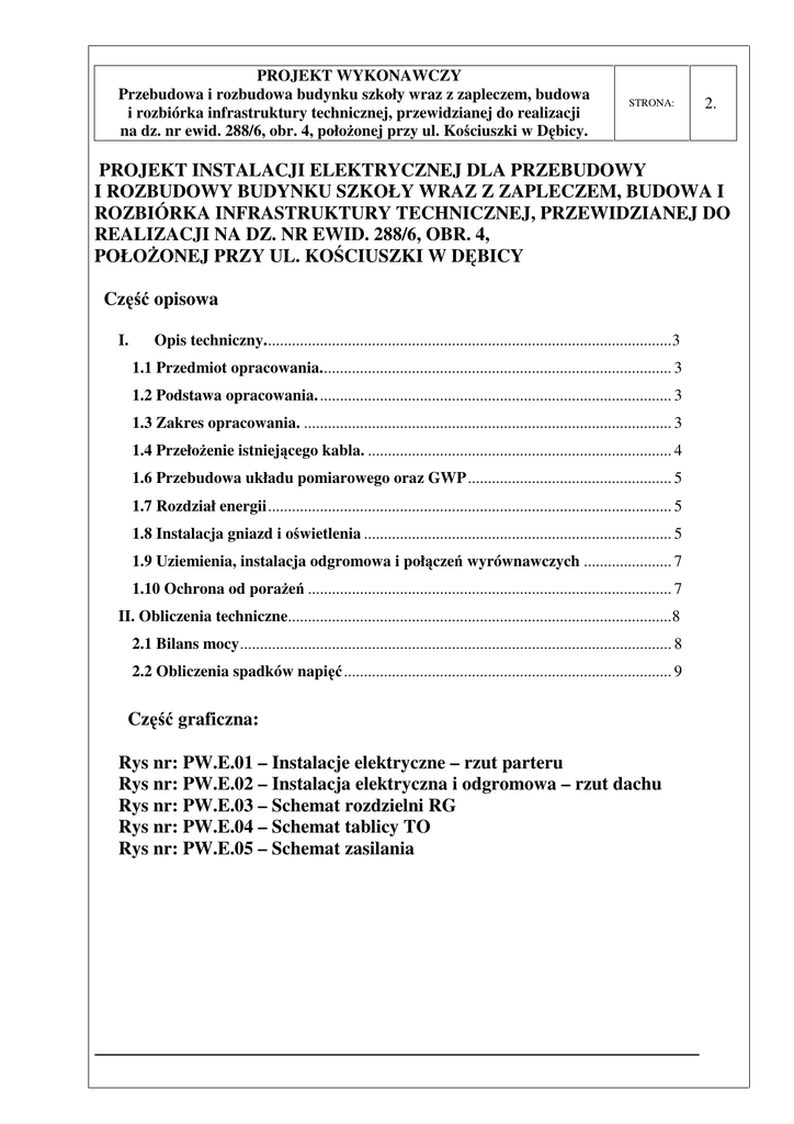 PROJEKT WYKONAWCZY Przebudowa i rozbudowa budynku szkoły wraz z zapleczem, budowa i rozbiórka infrastruktury technicznej, przewidzianej do realizacji na dz. nr ewid. 288/6, obr. 4, położonej przy ul. Kościuszki w Dębicy. STRONA: 2. PROJEKT INSTALACJI ELEKTRYCZNEJ DLA PRZEBUDOWY I ROZBUDOWY BUDYNKU SZKOŁY WRAZ Z ZAPLECZEM, BUDOWA I ROZBIÓRKA INFRASTRUKTURY TECHNICZNEJ, PRZEWIDZIANEJ DO REALIZACJI NA DZ. NR EWID. 288/6, OBR. 4, POŁOŻONEJ PRZY UL. KOŚCIUSZKI W DĘBICY Część opisowa I. Opis techniczny...................................................................................................... 3 1.1 Przedmiot opracowania........................................................................................ 3 1.2 Podstawa opracowania. ........................................................................................ 3 1.3 Zakres opracowania. ............................................................................................ 3 1.4 Przełożenie istniejącego kabla. ............................................................................ 4 1.6 Przebudowa układu pomiarowego oraz GWP ................................................... 5 1.7 Rozdział energii ..................................................................................................... 5 1.8 Instalacja gniazd i oświetlenia ............................................................................. 5 1.9 Uziemienia, instalacja odgromowa i połączeń wyrównawczych ...................... 7 1.10 Ochrona od porażeń ........................................................................................... 7 II. Obliczenia techniczne................................................................................................ 8 2.1 Bilans mocy ............................................................................................................ 8 2.2 Obliczenia spadków napięć .................................................................................. 9 Część graficzna: Rys nr: PW.E.01 – Instalacje elektryczne – rzut parteru Rys nr: PW.E.02 – Instalacja elektryczna i odgromowa – rzut dachu Rys nr: PW.E.03 – Schemat rozdzielni RG Rys nr: PW.E.04 – Schemat tablicy TO Rys nr: PW.E.05 – Schemat zasilania PROJEKT WYKONAWCZY Przebudowa i rozbudowa budynku szkoły wraz z zapleczem, budowa i rozbiórka infrastruktury technicznej, przewidzianej do realizacji na dz. nr ewid. 288/6, obr. 4, położonej przy ul. Kościuszki w Dębicy. STRONA: 3. I. Opis techniczny. 1.1 Przedmiot opracowania. Niniejsze opracowanie stanowi projekt wykonawczy instalacji elektrycznej dla przebudowy i rozbudowy budynku szkoły wraz z zapleczem, budowy i rozbiórki infrastruktury technicznej, przewidzianej do realizacji na dz. Nr ewid. 288/6, obr. 4, położonej przy ul. Kościuszki w Dębicy 1.2 Podstawa opracowania. Projekt niniejszy opracowano na podstawie: • Zalecenia inwestora • Mapy do celów projektowych w skali 1: 500, • Szkiców i pomiarów w terenie • Obowiązujących norm i przepisów • Uzgodnień międzybranżowych. • Warunków przyłączenia O10/RD-2/ZS/MS/51072/2013 1.3 Zakres opracowania. Niniejsze opracowanie obejmuje: • Przełożenie istniejącego kabla YAKY 4x120mm2 na odcinku e1-e2 o długości 8m – zmiana trasy, długość kabla pozostaje bez zmian. • Budowę zewnętrznej instalacji elektrycznej kablem ziemnym nn YAKY 4x120mm2 biegnącym od złącza ZK do złącza ZK-3 o długości kabla w ziemi 50m /całkowita długość 53m dla przebudowy i rozbudowy szkoły wraz z zapleczem • Budowę wewnętrznej instalacji elektrycznej dla przebudowy i rozbudowy budynku szkoły wraz z zapleczem PROJEKT WYKONAWCZY Przebudowa i rozbudowa budynku szkoły wraz z zapleczem, budowa i rozbiórka infrastruktury technicznej, przewidzianej do realizacji na dz. nr ewid. 288/6, obr. 4, położonej przy ul. Kościuszki w Dębicy. STRONA: 4. 1.4 Przełożenie istniejącego kabla. W związku z przebudową i rozbudową szkoły wraz z zapleczem konieczne stało się przełożenie istniejącego kabla YAKY 4x120mm2 na odcinku e1-e2 o długości 8m. W tym celu należy odkopać istniejący kabel i przełożyć w nową trasę o tej samej długości. Kabel należy układać w rurze ochronnej dwudzielnej A110PS o długości 6m ze względu na sąsiedztwo innych sieci i budynków. Kabel należy oznaczyć co 10 m w sposób trwały oznacznikami na których należy umieścić: numer ewidencyjny linii ,typ kabla, rok ułożenia (przełożenia). Następnie kabel przysypać warstwą piasku 10 cm i 15 cm gruntu rodzimego oraz nałożyć folię koloru niebieskiego, poczym zasypać całkowicie wykop doprowadzając teren do stanu pierwotnego. Trasa kabla została pokazane na projekcie zagospodarowanie terenu rys. nr PB_Z_01. 1.5 Budowa zewnętrznej instalacji elektrycznej. Dla zasilenia projektowanej przebudowy i rozbudowy szkoły wraz z zapleczem projektuje się nowy odcinek zewnętrznej instalacji elektrycznej nn YAKY 4x120mm2 o długości 50m /całkowita długość 53m/. Projektowany kabel należy podłączyć w złączach ZK-3 i ZK pod istniejące podstawy bezpiecznikowe Ze względu na bliskie sąsiedztwo budynku szkoły i zaplecza jak również innych sieci, kabel w całości ochronić należy rurą DVK 110 o długości 50m. Kabel należy oznaczyć co 10 m w sposób trwały oznacznikami na których należy umieścić: numer ewidencyjny linii ,typ kabla, rok ułożenia. Następnie kabel wraz z rurą przysypać warstwą piasku 10 cm i 15 cm gruntu rodzimego oraz nałożyć folię koloru niebieskiego, poczym zasypać całkowicie wykop doprowadzając teren do stanu pierwotnego. Trasa kabla została pokazana na projekcie zagospodarowanie terenu rys. nr PB_Z_01. PROJEKT WYKONAWCZY Przebudowa i rozbudowa budynku szkoły wraz z zapleczem, budowa i rozbiórka infrastruktury technicznej, przewidzianej do realizacji na dz. nr ewid. 288/6, obr. 4, położonej przy ul. Kościuszki w Dębicy. STRONA