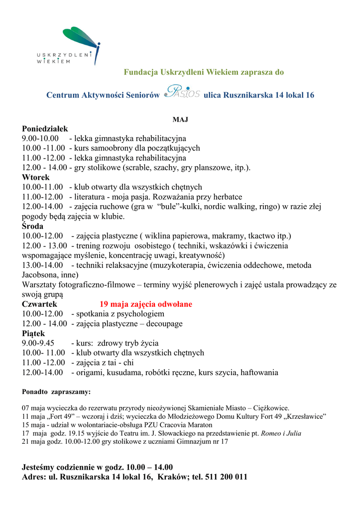 Fundacja Uskrzydleni Wiekiem zaprasza do Centrum Aktywności Seniorów ulica Rusznikarska 14 lokal 16 MAJ Poniedziałek 9.00-10.00 - lekka gimnastyka rehabilitacyjna 10.00 -11.00 - kurs samoobrony dla początkujących 11.00 -12.00 - lekka gimnastyka rehabilitacyjna 12.00 - 14.00 - gry stolikowe (scrable, szachy, gry planszowe, itp.). Wtorek 10.00-11.00 - klub otwarty dla wszystkich chętnych 11.00-12.00 - literatura - moja pasja. Rozważania przy herbatce 12.00-14.00 - zajęcia ruchowe (gra w “bule”-kulki, nordic walking, ringo) w razie złej pogody będą zajęcia w klubie. Środa 10.00-12.00 - zajęcia plastyczne ( wiklina papierowa, makramy, tkactwo itp.) 12.00 - 13.00 - trening rozwoju osobistego ( techniki, wskazówki i ćwiczenia wspomagające myślenie, koncentrację uwagi, kreatywność) 13.00-14.00 - techniki relaksacyjne (muzykoterapia, ćwiczenia oddechowe, metoda Jacobsona, inne) Warsztaty fotograficzno-filmowe – terminy wyjść plenerowych i zajęć ustala prowadzący ze swoją grupą Czwartek 19 maja zajęcia odwołane 10.00-12.00 - spotkania z psychologiem 12.00 - 14.00 - zajęcia plastyczne – decoupage Piątek 9.00-9.45 - kurs: zdrowy tryb życia 10.00- 11.00 - klub otwarty dla wszystkich chętnych 11.00 -12.00 - zajęcia z tai - chi 12.00-14.00 - origami, kusudama, robótki ręczne, kurs szycia, haftowania Ponadto zapraszamy: 07 maja wycieczka do rezerwatu przyrody nieożywionej Skamieniałe Miasto – Ciężkowice. 11 maja „Fort 49” – wczoraj i dziś; wycieczka do Młodzieżowego Domu Kultury Fort 49 „Krzesławice” 15 maja - udział w wolontariacie-obsługa PZU Cracovia Maraton 17 maja godz. 19.15 wyjście do Teatru im. J. Słowackiego na przedstawienie pt. Romeo i Julia 21 maja godz. 10.00-12.00 gry stolikowe z uczniami Gimnazjum nr 17 Jesteśmy codziennie w godz. 10.00 – 14.00 Adres: ul. Rusznikarska 14 lokal 16, Kraków; tel. 511 200 011