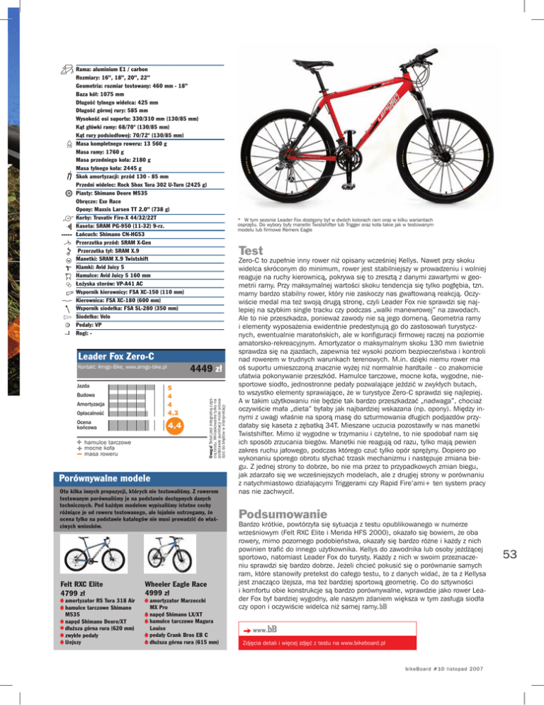 Rama: aluminium E1 / carbon Rozmiary: 16”, 18”, 20”, 22” Geometria: rozmiar testowany: 460 mm - 18” Baza kół: 1075 mm Długość tylnego widelca: 425 mm Długość górnej rury: 585 mm Wysokość osi suportu: 330/310 mm (130/85 mm) Kąt główki ramy: 68/70° (130/85 mm) Kąt rury podsiodłowej: 70/72° (130/85 mm) Masa kompletnego roweru: 13 560 g Masa ramy: 1760 g Masa przedniego koła: 2180 g Masa tylnego koła: 2445 g Skok amortyzacji: przód 130 - 85 mm Przedni widelec: Rock Shox Tora 302 U-Turn (2425 g) Piasty: Shimano Deore M535 Obręcze: Exe Race Opony: Maxxis Larsen TT 2.0” (738 g) Korby: Truvativ Fire-X 44/32/22T Kaseta: SRAM PG-950 (11-32) 9-rz. Łańcuch: Shimano CN-HG53 Przerzutka przód: SRAM X-Gen Przerzutka tył: SRAM X.9 Manetki: SRAM X.9 Twistshift Klamki: Avid Juicy 5 Hamulce: Avid Juicy 5 160 mm Łożyska sterów: VP-A41 AC Wspornik kierownicy: FSA XC-150 (110 mm) Kierownica: FSA XC-180 (600 mm) Wspornik siodełka: FSA SL-280 (350 mm) Siodełko: Velo Pedały: VP Rogi: - * W tym sezonie Leader Fox dostępny był w dwóch kolorach ram oraz w kilku wariantach osprzętu. Do wybory były manetki Twistshifter lub Trigger oraz koła takie jak w testowanym modelu lub firmowe Remerx Eagle Test Leader Fox Zero-C Kontakt: Amigo-Bike, www.amigo-bike.pl Opłacalność 5 4 4 4,3 Ocena końcowa 4,4 Budowa Amortyzacja hamulce tarczowe mocne koła masa roweru Uwaga! Tekst jest integralną częścią testu. Wnioskowanie tylko na podstawie punktacji może prowadzić do błędów w interpretacji Jazda 4449 zł Porównywalne modele Oto kilka innych propozycji, których nie testowaliśmy. Z rowerem testowanym porównaliśmy je na podstawie dostępnych danych technicznych. Pod każdym modelem wypisaliśmy istotne cechy różniące je od roweru testowanego, ale lojalnie ostrzegamy, że ocena tylko na podstawie katalogów nie musi prowadzić do właściwych wniosków. Felt RXC Elite 4799 zł Wheeler Eagle Race 4999 zł * amortyzator RS Tora 318 Air * hamulce tarczowe Shimano M535 * napęd Shimano Deore/XT * dłuższa górna rura (620 mm) * zwykłe pedały * lżejszy * amortyzator Marzocchi MX Pro * napęd Shimano LX/XT * hamulce tarczowe Magura Louise * pedały Crank Bros EB C * dłuższa górna rura (615 mm) Zero-C to zupełnie inny rower niż opisany wcześniej Kellys. Nawet przy skoku widelca skróconym do minimum, rower jest stabilniejszy w prowadzeniu i wolniej reaguje na ruchy kierownicą, pokrywa się to zresztą z danymi zawartymi w geometrii ramy. Przy maksymalnej wartości skoku tendencja się tylko pogłębia, tzn. mamy bardzo stabilny rower, który nie zaskoczy nas gwałtowaną reakcją. Oczywiście medal ma też swoją drugą stronę, czyli Leader Fox nie sprawdzi się najlepiej na szybkim single tracku czy podczas „walki manewrowej” na zawodach. Ale to nie przeszkadza, ponieważ zawody nie są jego domeną. Geometria ramy i elementy wyposażenia ewidentnie predestynują go do zastosowań turystycznych, ewentualnie maratońskich, ale w konfiguracji firmowej raczej na poziomie amatorsko-rekreacyjnym. Amortyzator o maksymalnym skoku 130 mm świetnie sprawdza się na zjazdach, zapewnia też wysoki poziom bezpieczeństwa i kontroli nad rowerem w trudnych warunkach terenowych. M.in. dzięki niemu rower ma oś suportu umieszczoną znacznie wyżej niż normalnie hardtaile - co znakomicie ułatwia pokonywanie przeszkód. Hamulce tarczowe, mocne koła, wygodne, niesportowe siodło, jednostronne pedały pozwalające jeździć w zwykłych butach, to wszystko elementy sprawiające, że w turystyce Zero-C sprawdzi się najlepiej. A w takim użytkowaniu nie będzie tak bardzo przeszkadzać „nadwaga”, chociaż oczywiście mała „dieta” byłaby jak najbardziej wskazana (np. opony). Między innymi z uwagi właśnie na sporą masę do szturmowania długich podjazdów przydałaby się kaseta z zębatką 34T. Mieszane uczucia pozostawiły w nas manetki Twistshifter. Mimo iż wygodne w trzymaniu i czytelne, to nie spodobał nam się ich sposób zrzucania biegów. Manetki nie reagują od razu, tylko mają pewien zakres ruchu jałowego, podczas którego czuć tylko opór sprężyny. Dopiero po wykonaniu sporego obrotu słychać trzask mechanizmu i następuje zmiana biegu. Z jednej strony to dobrze, bo nie ma przez to przypadkowych zmian biegu, jak zdarzało się we wcześniejszych modelach, ale z drugiej strony w porównaniu z natychmiastowo działającymi Triggerami czy Rapid Fire’ami+ ten system pracy nas nie zachwycił. Podsumowanie Bardzo krótkie, powtórzyła się sytuacja z testu opublikowanego w numerze wrześniowym (Felt RXC Elite i Merida HFS 2000), okazało się bowiem, że oba rowery, mimo pozornego podobieństwa, okazały się bardzo różne i każdy z nich powinien trafić do innego użytkownika. Kellys do zawodnika lub osoby jeżdżącej sportowo, natomiast Leader Fox do turysty. Każdy z nich w swoim przeznaczeniu sprawdzi się bardzo dobrze. Jeżeli chcieć pokusić się o porównanie samych ram, które stanowiły pretekst do całego testu, to z danych widać, że ta z Kellysa jest znacząco lżejsza, ma też bardziej sportową geometrię. Co do sztywności i komfortu obie konstrukcje są bardzo porównywalne, wprawdzie jako rower Leader Fox był bardziej wygodny, ale naszym zdaniem większa w tym zasługa siodła czy opon i oczywiście widelca niż samej ramy. Zdjęcia detali i więcej zdjęć z testu na www.bikeboard.pl bi k e Boa rd # 1 0 list o p a d 2 0 0 7 53