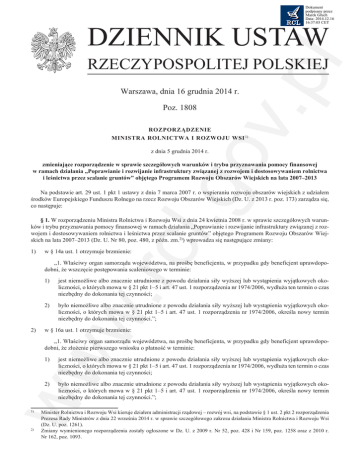 Dokument podpisany przez Marek Głuch Data: 2014.12.16 16:37:03 CET DZIENNIK USTAW v.p l RZECZYPOSPOLITEJ POLSKIEJ Warszawa, dnia 16 grudnia 2014 r. Poz. 1808 ROZPORZĄDZENIE MINISTRA ROLNICTWA I ROZWOJU WSI 1) .go z dnia 5 grudnia 2014 r. zmieniające rozporządzenie w sprawie szczegółowych warunków i trybu przyznawania pomocy finansowej w ramach działania „Poprawianie i rozwijanie infrastruktury związanej z rozwojem i dostosowywaniem rolnictwa i leśnictwa przez scalanie gruntów” objętego Programem Rozwoju Obszarów Wiejskich na lata 2007–2013 Na podstawie art. 29 ust. 1 pkt 1 ustawy z dnia 7 marca 2007 r. o wspieraniu rozwoju obszarów wiejskich z udziałem środków Europejskiego Funduszu Rolnego na rzecz Rozwoju Obszarów Wiejskich (Dz. U. z 2013 r. poz. 173) zarządza się, co następuje: w. rcl § 1. W rozporządzeniu Ministra Rolnictwa i Rozwoju Wsi z dnia 24 kwietnia 2008 r. w sprawie szczegółowych warunków i trybu przyznawania pomocy finansowej w ramach działania „Poprawianie i rozwijanie infrastruktury związanej z rozwojem i dostosowywaniem rolnictwa i leśnictwa przez scalanie gruntów” objętego Programem Rozwoju Obszarów Wiejskich na lata 2007–2013 (Dz. U. Nr 80, poz. 480, z późn. zm.2)) wprowadza się następujące zmiany: 1)w § 14a ust. 1 otrzymuje brzmienie: „1. Właściwy organ samorządu województwa, na prośbę beneficjenta, w przypadku gdy beneficjent uprawdopodobni, że wszczęcie postępowania scaleniowego w terminie: 1)jest niemożliwe albo znacznie utrudnione z powodu działania siły wyższej lub wystąpienia wyjątkowych okoliczności, o których mowa w § 21 pkt 1–5 i art. 47 ust. 1 rozporządzenia nr 1974/2006, wydłuża ten termin o czas niezbędny do dokonania tej czynności; 2)było niemożliwe albo znacznie utrudnione z powodu działania siły wyższej lub wystąpienia wyjątkowych okoliczności, o których mowa w § 21 pkt 1–5 i art. 47 ust. 1 rozporządzenia nr 1974/2006, określa nowy termin niezbędny do dokonania tej czynności.”; 2)w § 16a ust. 1 otrzymuje brzmienie: ww „1. Właściwy organ samorządu województwa, na prośbę beneficjenta, w przypadku gdy beneficjent uprawdopodobni, że złożenie pierwszego wniosku o płatność w terminie: 1)jest niemożliwe albo znacznie utrudnione z powodu działania siły wyższej lub wystąpienia wyjątkowych okoliczności, o których mowa w § 21 pkt 1–5 i art. 47 ust. 1 rozporządzenia nr 1974/2006, wydłuża ten termin o czas niezbędny do dokonania tej czynności; 2)było niemożliwe albo znacznie utrudnione z powodu działania siły wyższej lub wystąpienia wyjątkowych okoliczności, o których mowa w § 21 pkt 1–5 i art. 47 ust. 1 rozporządzenia nr 1974/2006, określa nowy termin niezbędny do dokonania tej czynności.”; Minister Rolnictwa i Rozwoju Wsi kieruje działem administracji rządowej – rozwój wsi, na podstawie § 1 ust. 2 pkt 2 rozporządzenia Prezesa Rady Ministrów z dnia 22 września 2014 r. w sprawie szczegółowego zakresu działania Ministra Rolnictwa i Rozwoju Wsi (Dz. U. poz. 1261). 2) Zmiany wymienionego rozporządzenia zostały ogłoszone w Dz. U. z 2009 r. Nr 52, poz. 428 i Nr 159, poz. 1258 oraz z 2010 r. Nr 162, poz. 1093. 1) Dziennik Ustaw –2– Poz. 1808 3)w § 21 w pkt 5 kropkę zastępuje się średnikiem i dodaje się pkt 6 w brzmieniu: v.p l „6) umorzenie postępowania scaleniowego na skutek wycofania wniosku o wszczęcie postępowania scaleniowego przez większość właścicieli gospodarstw rolnych położonych na projektowanym obszarze scalenia, na wniosek których wszczęto postępowanie scaleniowe, lub właścicieli gruntów, których łączny obszar przekracza połowę powierzchni projektowanego obszaru scalenia.”. § 2. Rozporządzenie wchodzi w życie po upływie 14 dni od dnia ogłoszenia. ww w. rcl .go Minister Rolnictwa i Rozwoju Wsi: M. Sawicki