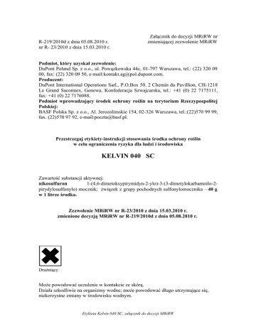 R-219/2010d z dnia 05.08.2010 r. nr R- 23/2010 z dnia 15.03.2010 r. Załącznik do decyzji MRiRW nr zmieniającej zezwolenie MRiRW Podmiot, który uzyskał zezwolenie: DuPont Poland Sp. z o.o., ul. Powązkowska 44c, 01-797 Warszawa, tel.: (22) 320 09 00, fax: (22) 320 09 50, e-mail:[email protected]. Producent: DuPont International Operations Sarl., P.O.Box 50. 2 Chemin du Pavillion, CH-1218 Le Grand Saconnex, Genewa, Konfederacja Szwajcarska, tel.: +41 (0) 22 7175111, fax: +41 (0) 22 7176088. Podmiot wprowadzający środek ochrony roślin na terytorium Rzeczypospolitej Polskiej: BASF Polska Sp. z o.o., Al. Jerozolimskie 154, 02-326 Warszawa, tel.:(22)570 99 99, fax. (22)570 97 92, e-mail:[email protected]. Przestrzegaj etykiety-instrukcji stosowania środka ochrony roślin w celu ograniczenia ryzyka dla ludzi i środowiska KELVIN 040 SC Zawartość substancji aktywnej: nikosulfuron 1-(4,6-dimetoksypirymidyn-2-ylo)-3-(3-dimetylokarbamoilo-2pirydylosulfonylo) mocznik; związek z grupy pochodnych sulfonylomocznika – 40 g w 1 litrze środka. Zezwolenie MRiRW nr R-23/2010 z dnia 15.03.2010 r. zmienione decyzją MRiRW nr R-219/2010d z dnia 05.08.2010 r. Drażniący Może powodować uczulenie w kontakcie ze skórą. Działa szkodliwie na organizmy wodne; może powodować długo utrzymujące się, niekorzystne zmiany w środowisku wodnym. Etykieta Kelvin 040 SC, załącznik do decyzji MRiRW Uwaga! 1. Zabrania się stosowania środka w strefie bezpośredniej ochrony ujęć wody, na terenie uzdrowisk, otulin parków narodowych i rezerwatów. 2. Nie zanieczyszczać wód środkiem ochrony roślin i jego opakowaniem. I OPIS DZIAŁANIA Kelvin 040 SC to środek chwastobójczy, koncentrat w postaci stężonej zawiesiny do rozcieńczania wodą, stosowany nalistnie, przeznaczony do powschodowego zwalczania perzu i jednorocznych chwastów jednoliściennych (chwasty prosowate) oraz niektórych chwastów dwuliściennych w kukurydzy. Kelvin 040 SC jest selektywnym herbicydem o działaniu systemicznym. Pobierany jest głównie poprzez liście i szybko przemieszczany w roślinie, hamując jej wzrost i rozwój. Wzrost chwastów zostaje zahamowany wkrótce po zastosowaniu środka, po czym następuje stopniowe przebarwianie się roślin. Chwasty zamierają całkowicie po 20-25 dniach od zabiegu. Środek działa najskuteczniej na młode, intensywnie rosnące chwasty. Ciepła i wilgotna pogoda przyspiesza działanie środka. Chwasty wrażliwe np.: Jednoliścienne jednoroczne: chwastnica jednostronna, włośnice jednoliścienne wieloletnie: perz właściwy dwuliścienne jednoroczne: fiołek polny, rdest powojowy, tasznik pospolity, wyki. Chwasty średnio wrażliwe np.: komosa biała. Chwasty odporne np.: odporne są chwasty średnio wrażliwe w późniejszych fazach rozwojowych (powyżej 6 liści), skrzyp polny, ostrożeń polny. II ZAKRES STOSOWANIA, TERMINY I DAWKI KUKURYDZA Zabieg wykonać wcześnie po wschodach w fazie 2-7 liści kukurydzy (BBCH 12-17). Zalecana dawka: 1-1,5 l/ha. Zwalczanie chwastnicy jednostronnej i innych chwastów prosowatych. Zabieg wykonać gdy chwasty są w fazie 3 liści do końca fazy krzewienia. Zalecana dawka: 1 l/ha. Zwalczanie perzu właściwego. Zabieg wykonać gdy większość chwastów osiągnęła wysokość 15-20 cm (perz ma wtedy 5-7 liści). Zalecana dawka: 1-1,5 l/ha. Etykieta Kelvin 040 SC, załącznik do decyzji MRiRW 2 Wyższą z zalecanych dawek stosować w przypadku bardzo silnego zachwaszczenia perzem. Zwalczanie chwastów dwuliściennych. Zabieg wykonać, gdy większość chwastów (ponad 50%) znajduje się w fazie 2-4 liści. Zalecana dawka: 1 l/ha. Zalecana ilość wody: 200-300 l/ha. Zalecane opryskiwanie: średniokropliste. Uwagi: 1. W warunkach niekorzystnych dla wzrostu i rozwoju kukurydzy po zastosowaniu środka mogą wystąpić przemijające zniekształcenia liści, przebarwienia oraz wstrzymanie wzrostu roślin. Szczególnie silnie mogą reagować odmiany: Contessa, Fart, Frida, Koka, Melina, Mieszko, Mona i Trophee. 2. Środka nie stosować: - w kukurydzy cukrowej, pękającej i w uprawie materiałów hodowlanych - w fazie rozwojowej kukurydzy powyżej 7 liści - na odmianę kukurydzy Koka 3. Zabiegu nie wykonywać: - bezpośrednio po okresie długotrwałych chłodów na rośliny, których wzrost został zahamowany wskutek niskich temperatur; zabieg można wykonać po wznowieniu intensywnego wzrostu kukurydzy - w temperaturze powietrza poniżej 10oC i powyżej 25oC - na rośliny osłabione i uszkodzone przez przymrozki, suszę, szkodniki lub choroby - na rośliny mokre (rosa, deszcze) Podczas stosowania środka nie dopuścić do: - znoszenia cieczy użytkowej na sąsiednie rośliny uprawne - nakładania się cieczy użytkowej na stykach pasów zabiegowych i uwrociach III NASTĘPSTWO ROŚLIN W przypadku wcześniejszej likwidacji plantacji można siać bez ograniczeń kukurydzę jako roślinę następczą lub: - zboża - po 3 miesiącach - na glebach kwaśnych) po 9 miesiącach - na glebach obojętnych i zasadowych, - strączkowe - po 9 miesiącach, - lucernę - po 12 miesiącach. Wiosną następnego roku można uprawiać wszystkie rośliny. IV OKRES KARENCJI okres od dnia ostatniego zabiegu do dnia zbioru roślin przeznaczonych do konsumpcji NIE DOTYCZY V OKRES PREWENCJI DLA LUDZI, ZWIERZĄT, PSZCZÓŁ okres zapobiegający zatruciu NIE DOTYCZY VI SPORZĄDZANIE CIECZY UŻYTKOWEJ Przed przystąpieniem do sporządzania cieczy użytkowej dokładnie ustalić potrzebną jej ilość. Zawartością opakowania przed użyciem wstrząsnąć. Etykieta Kelvin 040 SC, załącznik do decyzji MRiRW 3 Odmierzoną ilość środka wlać do zbiornika opryskiwacza napełnionego częściowo wodą z włączonym mieszadłem i uzupełnić wodą do potrzebnej ilości. Po wlaniu środka do zbiornika opryskiwacza nie wyposażonego w mieszadło hydrauliczne ciecz w zbiorniku mechanicznie wymieszać. Opróżnione opakowania przepłukać trzykrotnie wodą, a popłuczyny wlać do zbiornik