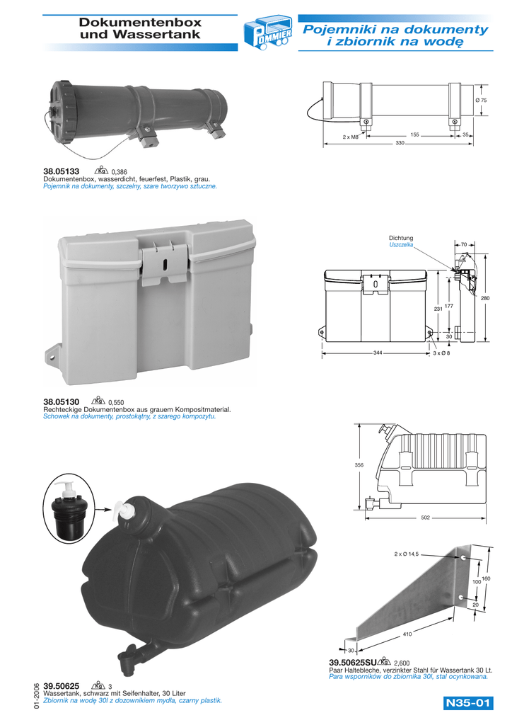 Dokumentenbox und Wassertank Pojemniki na dokumenty i zbiornik na wodę Ø 75 155 2 x M8 35 330 38.05133 Kg 0,386 Dokumentenbox, wasserdicht, feuerfest, Plastik, grau. Pojemnik na dokumenty, szczelny, szare tworzywo sztuczne. Dichtung Uszczelka 70 280 231 177 30 344 3xØ8 38.05130 Kg 0,550 Rechteckige Dokumentenbox aus grauem Kompositmaterial. Schowek na dokumenty, prostokątny, z szarego kompozytu. 356 502 39.50625SU 01-2006 Kg 2,600 Paar Haltebleche, verzinkter Stahl für Wassertank 30 Lt. Para wsporników do zbiornika 30l, stal ocynkowana. 39.50625 Kg 3 Wassertank, schwarz mit Seifenhalter, 30 Liter Zbiornik na wodę 30l z dozownikiem mydła, czarny plastik. N35-01