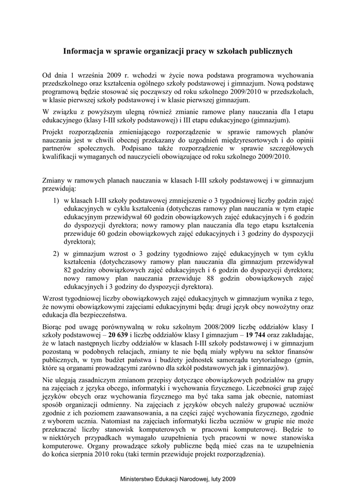 Informacja w sprawie organizacji pracy w szkołach publicznych Od dnia 1 września 2009 r. wchodzi w Ŝycie nowa podstawa programowa wychowania przedszkolnego oraz kształcenia ogólnego szkoły podstawowej i gimnazjum. Nową podstawę programową będzie stosować się począwszy od roku szkolnego 2009/2010 w przedszkolach, w klasie pierwszej szkoły podstawowej i w klasie pierwszej gimnazjum. W związku z powyŜszym ulegną równieŜ zmianie ramowe plany nauczania dla I etapu edukacyjnego (klasy I-III szkoły podstawowej) i III etapu edukacyjnego (gimnazjum). Projekt rozporządzenia zmieniającego rozporządzenie w sprawie ramowych planów nauczania jest w chwili obecnej przekazany do uzgodnień międzyresortowych i do opinii partnerów społecznych. Podpisano takŜe rozporządzenie w sprawie szczegółowych kwalifikacji wymaganych od nauczycieli obowiązujące od roku szkolnego 2009/2010. Zmiany w ramowych planach nauczania w klasach I-III szkoły podstawowej i w gimnazjum przewidują: 1) w klasach I-III szkoły podstawowej zmniejszenie o 3 tygodniowej liczby godzin zajęć edukacyjnych w cyklu kształcenia (dotychczas ramowy plan nauczania w tym etapie edukacyjnym przewidywał 60 godzin obowiązkowych zajęć edukacyjnych i 6 godzin do dyspozycji dyrektora; nowy ramowy plan nauczania dla tego etapu kształcenia przewiduje 60 godzin obowiązkowych zajęć edukacyjnych i 3 godziny do dyspozycji dyrektora); 2) w gimnazjum wzrost o 3 godziny tygodniowo zajęć edukacyjnych w tym cyklu kształcenia (dotychczasowy ramowy plan nauczania dla gimnazjum przewidywał 82 godziny obowiązkowych zajęć edukacyjnych i 6 godzin do dyspozycji dyrektora; nowy ramowy plan nauczania przewiduje 88 godzin obowiązkowych zajęć edukacyjnych i 3 godziny do dyspozycji dyrektora). Wzrost tygodniowej liczby obowiązkowych zajęć edukacyjnych w gimnazjum wynika z tego, Ŝe nowymi obowiązkowymi zajęciami edukacyjnymi będą: drugi język obcy nowoŜytny oraz edukacja dla bezpieczeństwa. Biorąc pod uwagę porównywalną w roku szkolnym 2008/2009 liczbę oddziałów klasy I szkoły podstawowej – 20 639 i liczbę oddziałów klasy I gimnazjum – 19 744 oraz zakładając, Ŝe w latach następnych liczby oddziałów w klasach I-III szkoły podstawowej i w gimnazjum pozostaną w podobnych relacjach, zmiany te nie będą miały wpływu na sektor finansów publicznych, w tym budŜet państwa i budŜety jednostek samorządu terytorialnego (gmin, które są organami prowadzącymi zarówno dla szkół podstawowych jak i gimnazjów). Nie ulegają zasadniczym zmianom przepisy dotyczące obowiązkowych podziałów na grupy na zajęciach z języka obcego, informatyki i wychowania fizycznego. Liczebności grup zajęć języków obcych oraz wychowania fizycznego ma być taka sama jak obecnie, natomiast sposób organizacji odmienny. Na zajęciach z języków obcych naleŜy grupować uczniów zgodnie z ich poziomem zaawansowania, a na części zajęć wychowania fizycznego, zgodnie z wyborem ucznia. Natomiast na zajęciach informatyki liczba uczniów w grupie nie moŜe przekraczać liczby stanowisk komputerowych w pracowni komputerowej. Będzie to w niektórych przypadkach wymagało uzupełnienia tych pracowni w nowe stanowiska komputerowe. Organy prowadzące szkoły publiczne będą mieć czas na te uzupełnienia do końca sierpnia 2010 roku (taki termin przewiduje projekt rozporządzenia). Ministerstwo Edukacji Narodowej, luty 2009 Od roku szkolnego 2009/2010 – rok po roku, przez sześć lat – począwszy od klasy I szkoły podstawowej i klasy I gimnazjum, oprócz tego, Ŝe wchodzi nowa podstawa programowa kształcenia ogólnego, wchodzą takŜe nowe podręczniki. Planowane jest rokrocznie obejmowanie kaŜdego rocznika ze zmieniającymi się podręcznikami programem „Wyprawka szkolna”. Oprócz tego wchodzą w Ŝycie inne zmiany bardzo istotne dla organizacji pracy szkół. Nauczyciele zgodnie ze zmianami w art. 42 Karty Nauczyciela mają obowiązek, poza swoim pensum, przepracować przynajmniej jedną godzinę tygodniowo z uczniami w sposób wychodzący naprzeciw ich indywidualnym potrzebom – udzielając im pomocy w przezwycięŜaniu trudności, w rozwijaniu zdolności lub pogłębianiu zainteresowań. Najistotniejszą zmianą w ramowym planie nauczania jest nieokreślanie liczby godzin tygodniowo w cyklu kształcenia przeznaczonej na poszczególne obowiązkowe zajęcia edukacyjne. W to miejsce określone zostały minimalne ogólne liczby godzin przeznaczone na realizację podstawy programowej z poszczególnych obowiązkowych zajęć edukacyjnych w całym cyklu kształcenia. Dyrektor szkoły odpowiada za to, aby łączne sumy godzin w ciągu trzech lat zajęć z danego przedmiotu były nie mniejsze niŜ wymienione w ramowym planie nauczania, a efekty określone w podstawie programowej zostały osiągnięte. Tak określona realizacja podstawy programowej z poszczególnych przedmiotów będzie podlegała kontroli kuratora oświaty w ramach sprawowanego nadzoru pedagogicznego. Podane są natomiast sumaryczne tygodniowe liczby godzin w cyklach kształcenia (w klasach I-III szkoły podstawowej 60 godzin zajęć obowiązkowych i 3 godziny do dyspozycji dyrektora szkoły, a w gimnazjum 88 godzin zajęć obowiązkowych i 3 godziny do dyspozycji dyrektora szkoły). Taka liczba godzin (zwiększona o obowiązkowe podziały na grupy na określonych zajęciach) musi być zatwierdzona przez organy prowadzące w arkuszach organizacji szkół opracowywanych przez dyrektorów tych szkół. Dzięki takiemu opisaniu godzin nauczania poszczególnych przedmiotów pojawia się moŜliwość innego planowania roku szkolnego niŜ do tej pory. Dyrektor szkoły moŜe planować rok szkolny równieŜ nierytmicznie, decydując o róŜnej organizacji pracy szkoły w niektóre dni czy tygodnie. Czas pracy nauczyciela, zarówno w wypadku realizowania tych pojedynczych, dodatkowych godzin wynikających z art. 42 ust. 2 pkt 2 lit. a i b Karty N