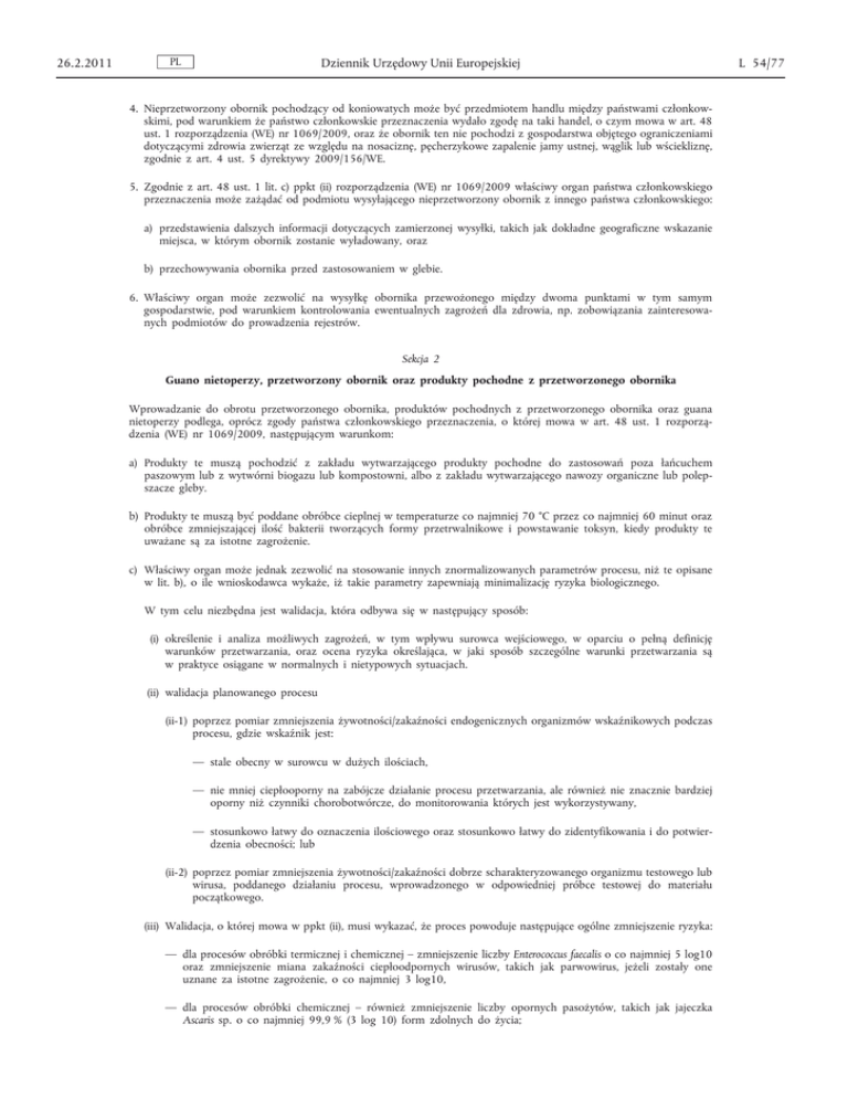 26.2.2011 PL Dziennik Urzędowy Unii Europejskiej 4. Nieprzetworzony obornik pochodzący od koniowatych może być przedmiotem handlu między państwami członkow skimi, pod warunkiem że państwo członkowskie przeznaczenia wydało zgodę na taki handel, o czym mowa w art. 48 ust. 1 rozporządzenia (WE) nr 1069/2009, oraz że obornik ten nie pochodzi z gospodarstwa objętego ograniczeniami dotyczącymi zdrowia zwierząt ze względu na nosaciznę, pęcherzykowe zapalenie jamy ustnej, wąglik lub wściekliznę, zgodnie z art. 4 ust. 5 dyrektywy 2009/156/WE. 5. Zgodnie z art. 48 ust. 1 lit. c) ppkt (ii) rozporządzenia (WE) nr 1069/2009 właściwy organ państwa członkowskiego przeznaczenia może zażądać od podmiotu wysyłającego nieprzetworzony obornik z innego państwa członkowskiego: a) przedstawienia dalszych informacji dotyczących zamierzonej wysyłki, takich jak dokładne geograficzne wskazanie miejsca, w którym obornik zostanie wyładowany, oraz b) przechowywania obornika przed zastosowaniem w glebie. 6. Właściwy organ może zezwolić na wysyłkę obornika przewożonego między dwoma punktami w tym samym gospodarstwie, pod warunkiem kontrolowania ewentualnych zagrożeń dla zdrowia, np. zobowiązania zainteresowa nych podmiotów do prowadzenia rejestrów. Sekcja 2 Guano nietoperzy, przetworzony obornik oraz produkty pochodne z przetworzonego obornika Wprowadzanie do obrotu przetworzonego obornika, produktów pochodnych z przetworzonego obornika oraz guana nietoperzy podlega, oprócz zgody państwa członkowskiego przeznaczenia, o której mowa w art. 48 ust. 1 rozporzą dzenia (WE) nr 1069/2009, następującym warunkom: a) Produkty te muszą pochodzić z zakładu wytwarzającego produkty pochodne do zastosowań poza łańcuchem paszowym lub z wytwórni biogazu lub kompostowni, albo z zakładu wytwarzającego nawozy organiczne lub polep szacze gleby. b) Produkty te muszą być poddane obróbce cieplnej w temperaturze co najmniej 70 °C przez co najmniej 60 minut oraz obróbce zmniejszającej ilość bakterii tworzących formy przetrwalnikowe i powstawanie toksyn, kiedy produkty te uważane są za istotne zagrożenie. c) Właściwy organ może jednak zezwolić na stosowanie innych znormalizowanych parametrów procesu, niż te opisane w lit. b), o ile wnioskodawca wykaże, iż takie parametry zapewniają minimalizację ryzyka biologicznego. W tym celu niezbędna jest walidacja, która odbywa się w następujący sposób: (i) określenie i analiza możliwych zagrożeń, w tym wpływu surowca wejściowego, w oparciu o pełną definicję warunków przetwarzania, oraz ocena ryzyka określająca, w jaki sposób szczególne warunki przetwarzania są w praktyce osiągane w normalnych i nietypowych sytuacjach. (ii) walidacja planowanego procesu (ii-1) poprzez pomiar zmniejszenia żywotności/zakaźności endogenicznych organizmów wskaźnikowych podczas procesu, gdzie wskaźnik jest: — stale obecny w surowcu w dużych ilościach, — nie mniej ciepłooporny na zabójcze działanie procesu przetwarzania, ale również nie znacznie bardziej oporny niż czynniki chorobotwórcze, do monitorowania których jest wykorzystywany, — stosunkowo łatwy do oznaczenia ilościowego oraz stosunkowo łatwy do zidentyfikowania i do potwier dzenia obecności; lub (ii-2) poprzez pomiar zmniejszenia żywotności/zakaźności dobrze scharakteryzowanego organizmu testowego lub wirusa, poddanego działaniu procesu, wprowadzonego w odpowiedniej próbce testowej do materiału początkowego. (iii) Walidacja, o której mowa w ppkt (ii), musi wykazać, że proces powoduje następujące ogólne zmniejszenie ryzyka: — dla procesów obróbki termicznej i chemicznej – zmniejszenie liczby Enterococcus faecalis o co najmniej 5 log10 oraz zmniejszenie miana zakaźności ciepłoodpornych wirusów, takich jak parwowirus, jeżeli zostały one uznane za istotne zagrożenie, o co najmniej 3 log10, — dla procesów obróbki chemicznej – również zmniejszenie liczby opornych pasożytów, takich jak jajeczka Ascaris sp. o co najmniej 99,9 % (3 log 10) form zdolnych do życia; L 54/77 PL L 54/78 Dziennik Urzędowy Unii Europejskiej (iv) opracowanie pełnego programu kontroli, w tym procedur monitorowania przebiegu procesu; (v) środki zapewniające stałe monitorowanie i nadzór istotnych parametrów procesu ustalonych w programie kontroli podczas eksploatacji zakładu. Szczegóły dotyczące istotnych parametrów procesu wykorzystywanych w zakładzie, a także innych krytycznych punktów kontroli, muszą być rejestrowane i przechowywane tak, aby właściciel, podmiot prowadzący lub ich przed stawiciel oraz właściwy organ mogły monitorować działalność zakładu. Informacje dotyczące procesu zatwierdzonego na mocy niniejszego punktu muszą być udostępniane Komisji na jej żądanie. d) reprezentatywne próbki obornika pobrane podczas przetwarzania lub bezpośrednio po nim w zakładzie w celu monitorowania procesu muszą być zgodne z następującymi normami: Escherichia coli: n = 5, c = 5, m = 0, M= 1 000 w 1 g; lub Enterococaceae: n = 5, c = 5, m = 0, M = 1 000 w 1 g; oraz reprezentatywne próbki obornika pobrane podczas składowania lub w momencie wycofywania ze składowania w zakładzie produkcyjnym, wytwórni biogazu lub kompostowni muszą spełniać następujące normy: Salmonella: nieobecna w 25 g: n = 5; c = 0; m = 0; M = 0 gdzie: n = liczba badanych próbek, m = wartość graniczna liczby bakterii; wynik jest uznawany za zadowalający, jeżeli liczba bakterii we wszystkich próbkach nie przekracza m; M = maksymalna wartość dla liczby bakterii; wynik jest uznawany za niezadowalający, jeżeli liczba bakterii w jednej lub kilku próbkach jest równa lub większa od M; oraz c = liczba próbek, w których liczba bakterii zawiera się między m i M; próbka jest w dalszym ciągu uznawana za zadowalającą, jeżeli liczba bakterii pozostałych próbek jest równa lub mniejsza od m. Przetworzony obornik 